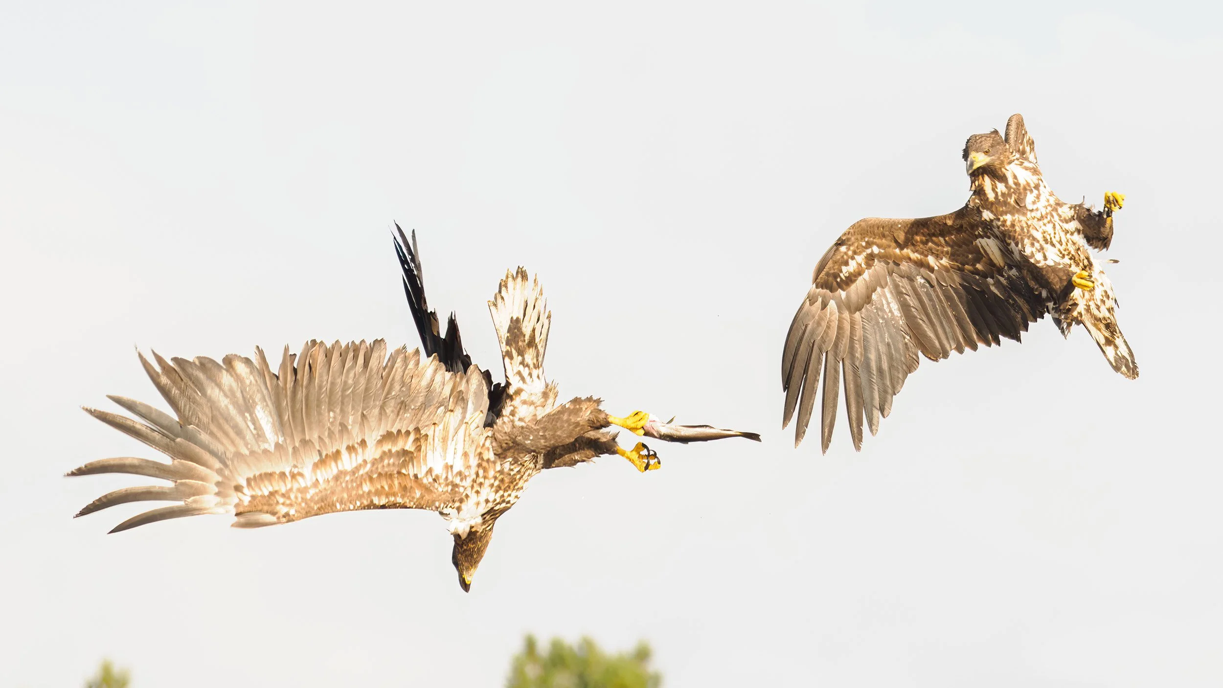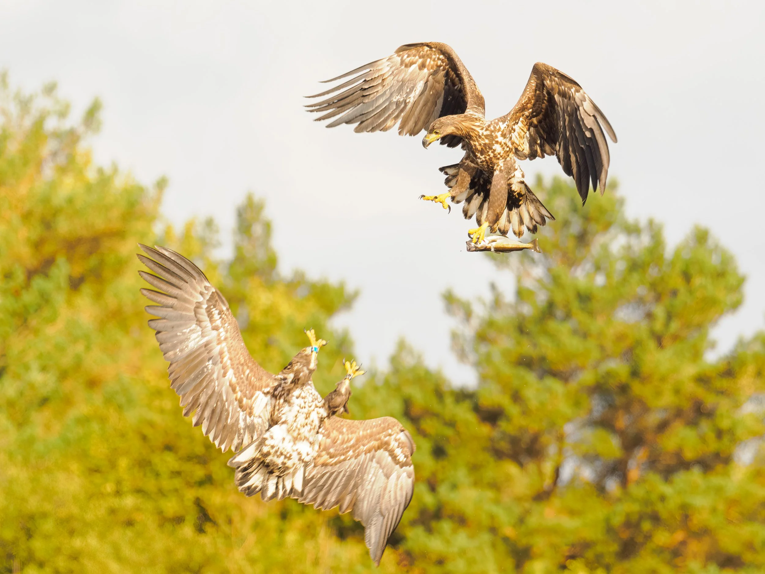 Medan eg fotograferte den første havørna etter den hadde plukka opp fisken, så kom det brått ei merka ungørn til inn i søkaren. Den var på jakt etter den same fisken. Det vart difor ein kamp og luftdans mellom dei to. I første omgang avverga den første angrepet og flaug lenger inn mot land. Der vart den tatt igjen av den andre, og ny kamp om fisken utspant seg. I tumultane mista den første havørna fisken, som datt ned i sjøen. Den eine havørna gjekk etter og prøvde å fiske den opp, men etter det eg kunne sjå av bildene, så var sannsynlegvis fisken søkt.
