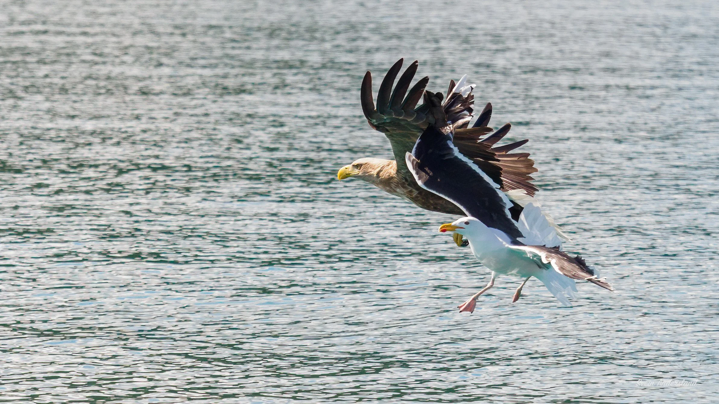 Havørna og svartbaken tek sikte på same målet, der svartbaken vil gjere det den kan for å stoppe havørna.