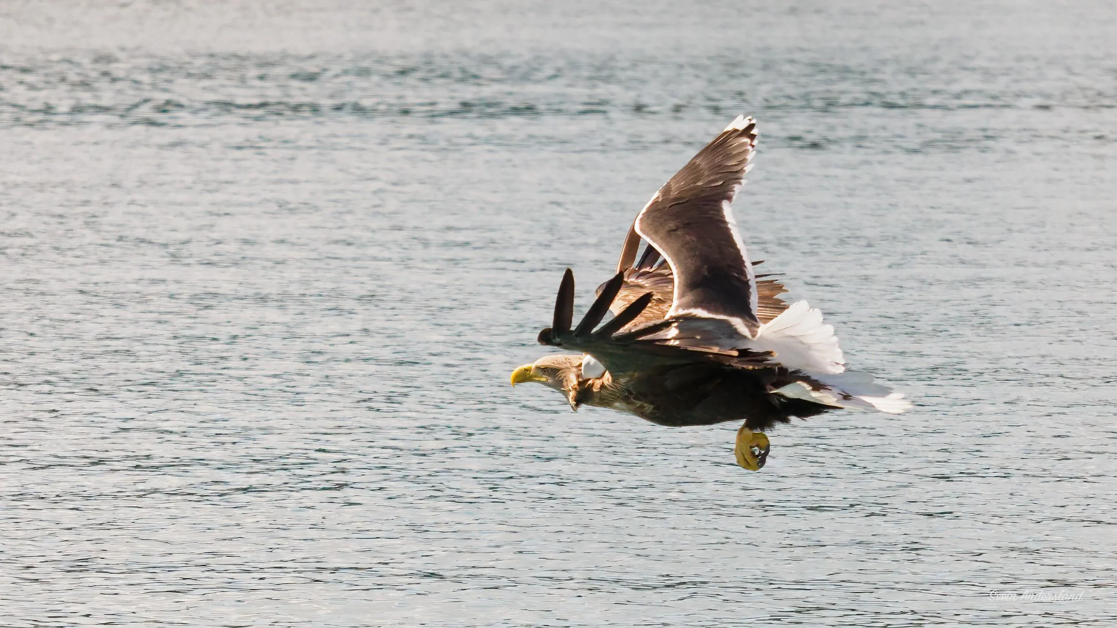 Havørna siktar seg inn på torsken, måsen følgjer med utafor bildekanten.