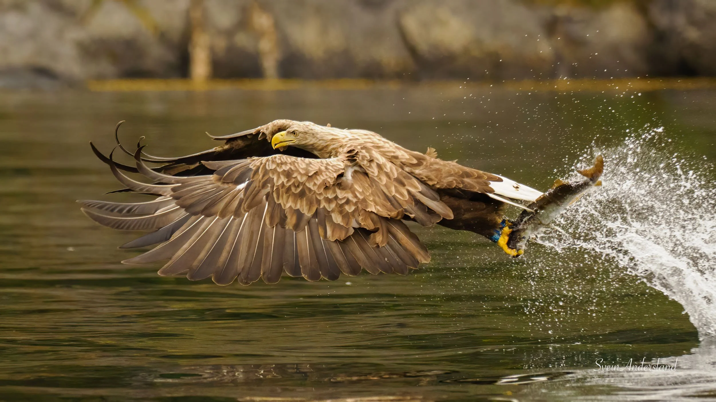 På den andre havørnturen i august var vi innom eit par reir, og fekk god fotofangst på begge plassane. Ved det første reiret vart det “berre” eit kast, sjå dei to første bildene nedanfor. Ved det andre reiret vart det eit lengre treff som inkluderte ein havørnunge. Makrellen er like “plagsom”, men teknikken med å kaste makrell på land fungerte utmerka her. Ungen var under observasjon av begge foreldra. Så ivrig var den eine forelderen, sannsynleg faren, at han kom sporenstreks straks makrellen landa i fjøresteinane. Da var båten framleis berre nokre meter frå land, utan sjanse for å fange ørna med teleoptikken. Likevel ei ny og artig oppleving av eit åtferdsmønster vi ikkje har sett før.