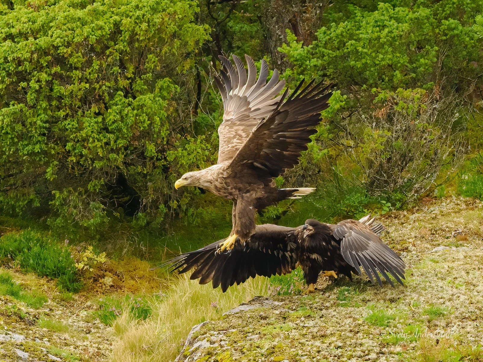 Vi låg ein god stund ved desse tre havørnene, og fekk etterkvart ei positiv kjensle av at vi spelte på lag med foreldra i opplæringa av havørnungen til å fange fisk i sjøen. Vi fekk etter kvart annan fisk enn makrell, og heiv denne uti, godt synleg for dei vaksne og havørnungen. Dei vaksne gjorde inga teikn til å hente opp fisk, og vår tolking er at dei venta på at ungen skulle gjere eit forsøk. Den eine forelderen gjorde og ei slags overflyging utan å hente makrellen på land, litt seinare kom ungen og forsynte seg av den.