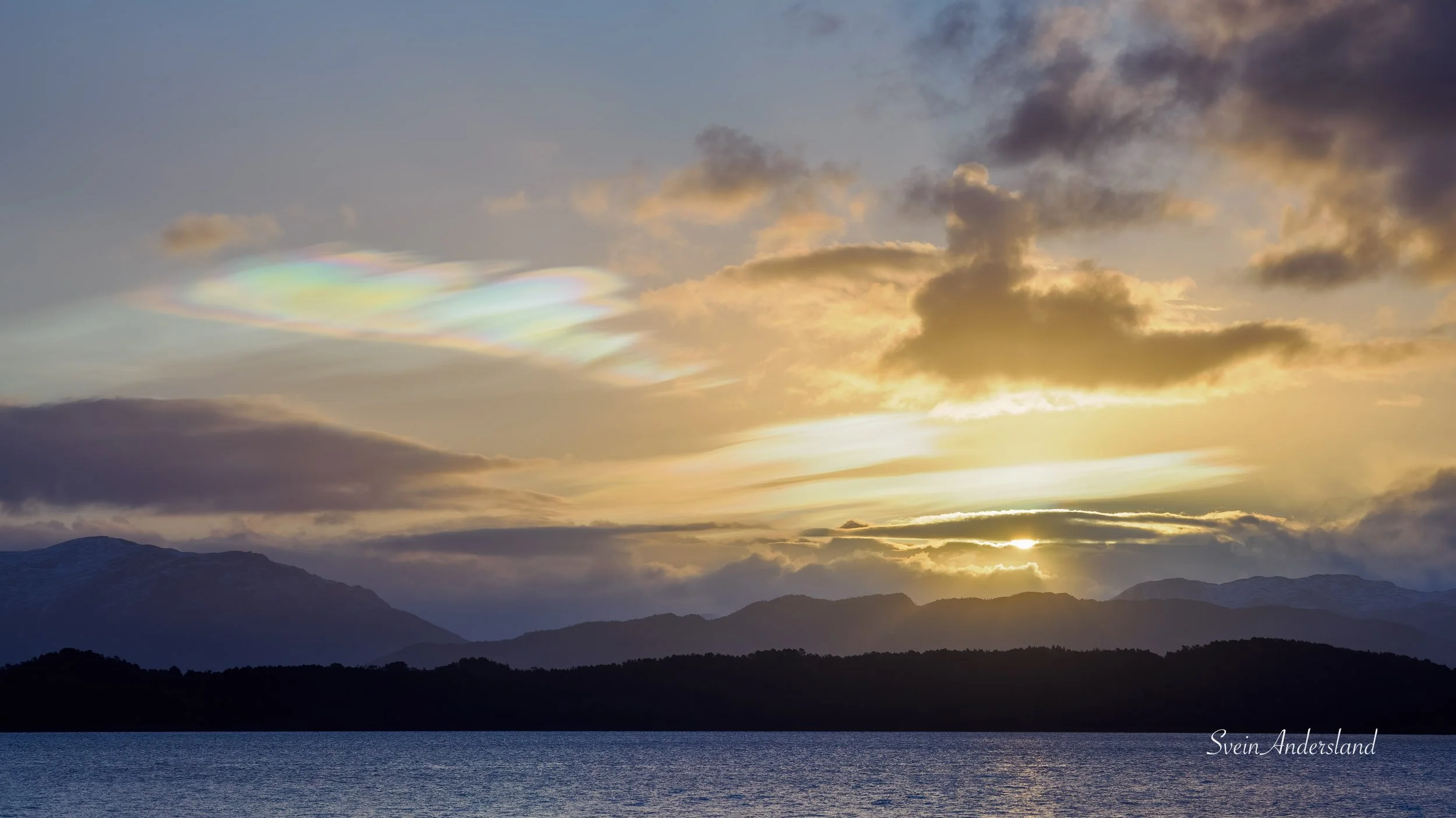 Neste gong var morgonen første juledag. Da dukka brått perlemorskyer opp innimellom andre meir gråaktige skyar. Eg fekk tatt fleire bilete frå huset og nabolaget. I tillegg køyrde eg ned på Kjøtteinen (Akerhus) og fekk eit større landskapsrom med fjord og fjell mellom sveiolandet og Borgundøy. Her fekk eg og med soloppgangen i lag med perlemorskyene. Igjen ei fin oppleving.