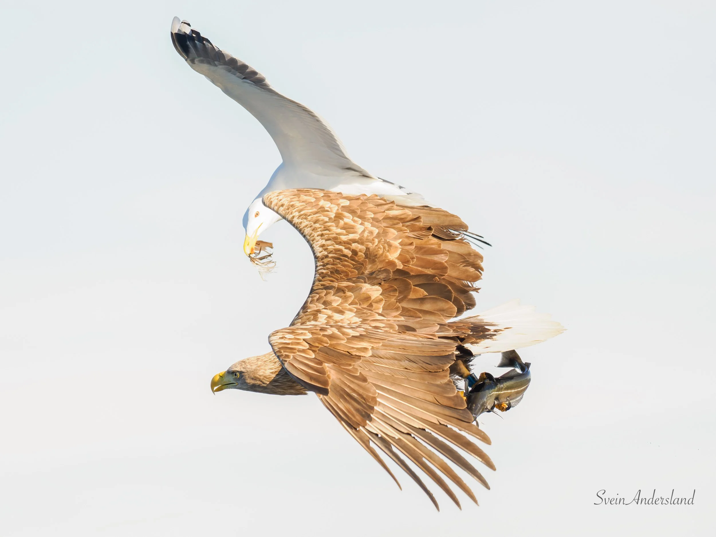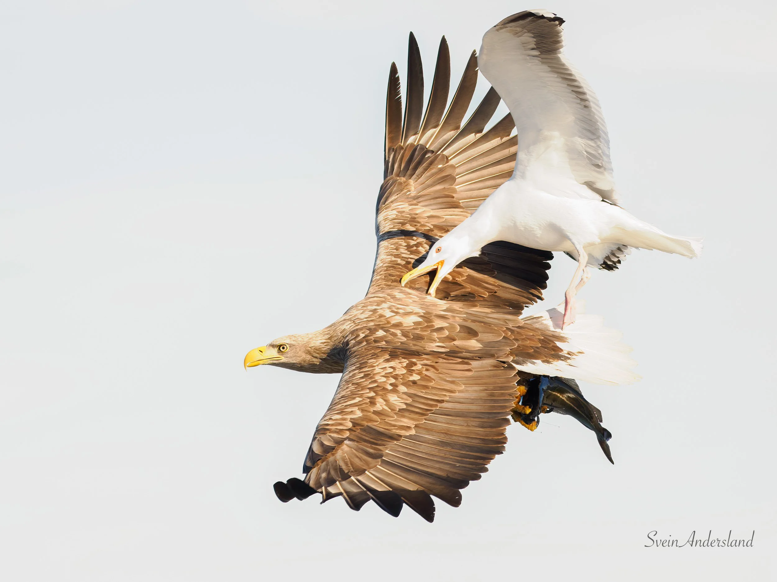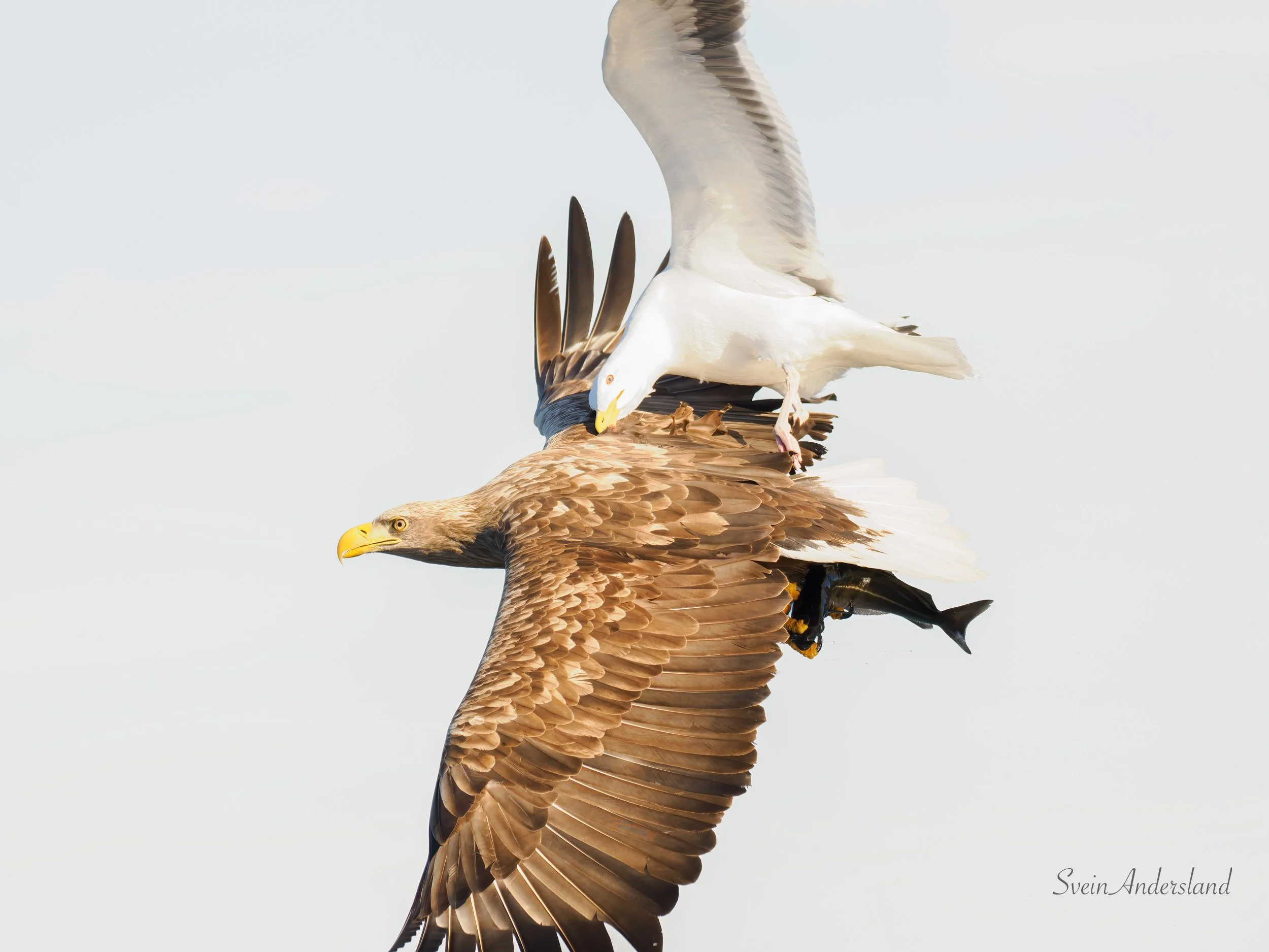Eg såg kjapt gjennom serien på skjermen bak på kameraet, og såg at svartbaken hadde noko i nebbet. Men, det var først da bildene kom på større skjerm eg såg kva eg hadde fått festa på brikka. Svartbaken har borra nebbet ned i skulderpartiet til ørna og nappa ut ei fjør! Så sig ho litt framom for liksom å vise kva ho har gjort.