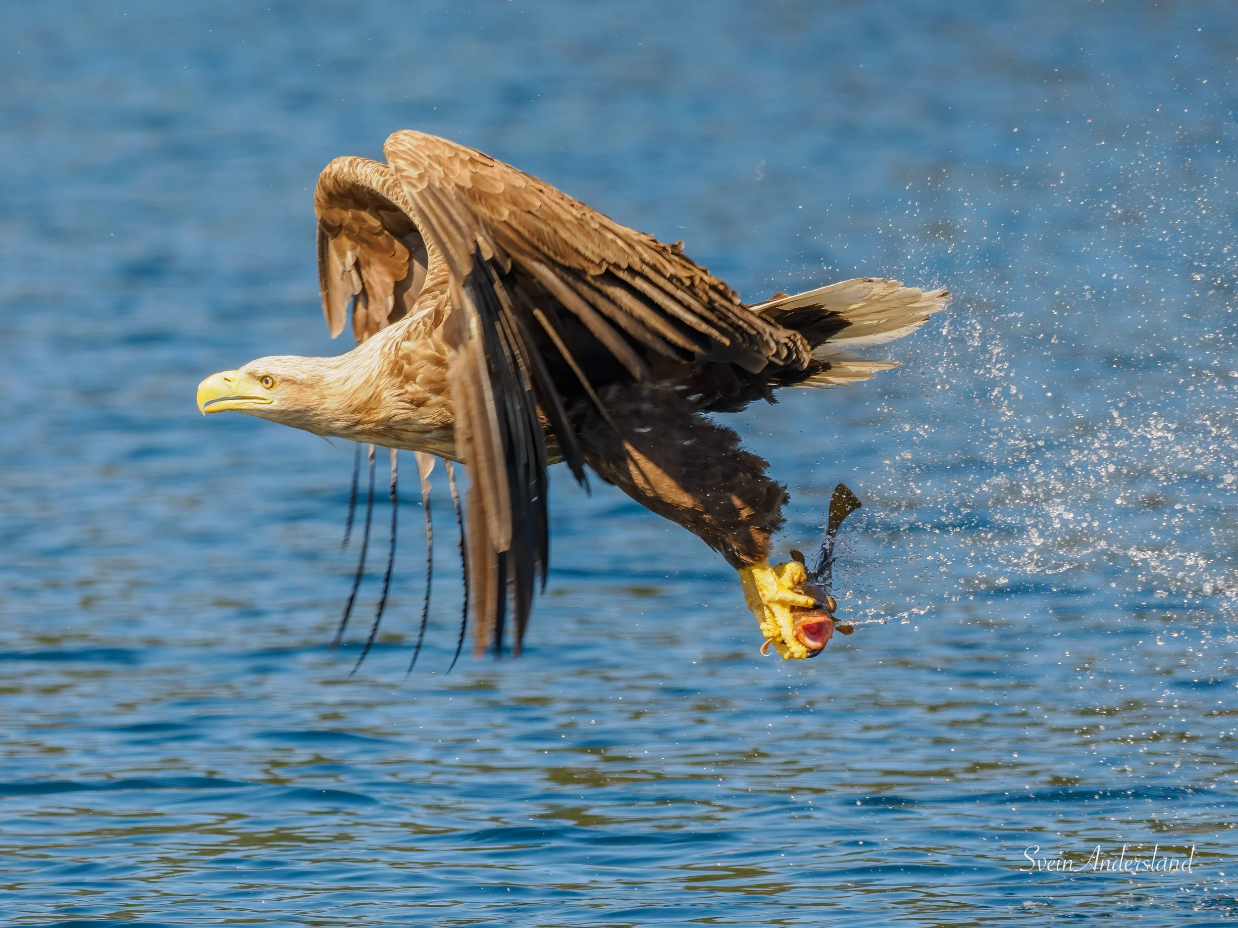 Ny søndag i mai med sol og fine forhold for havørnsafari, med innlagt ravnestopp. Denne gongen var fiskeboksen lasta med ei blanding av medbrakte frysevarer og fersk fisk. Vårt etter kvart trufaste havørnpar i år skulle vise seg å vere veldig interessert i serveringa. Havørnparet veksla på å hente fisk, anten til seg sjølv, eller til reiret. At fisk vart frakta til reiret denne gong er eit sikkert teikn på at det er ein eller fleire ungar som er klekt ut. Ein periode venta den eine ørna tålmodig i ein furutopp (den dukka plutseleg opp der), medan vi prøvde å få opp meir fisk. Da vi køyrde bort til den klare til å hive fisken ut, var den meir enn klar. To gonger var den i lufta nesten før fisken hadde landa i sjøen. Vi rakk difor nesten ikkje å få nok avstand med teleobjektivet før ørna var nede og henta opp fisk. Ny og artig oppleving. Med unge(r) i reiret vart det tilsaman seks kast denne gongen. På det sjuande var tydelegvis magene metta og vi kunne berre plukke lyren opp att og setje kursen mot båthamna att.