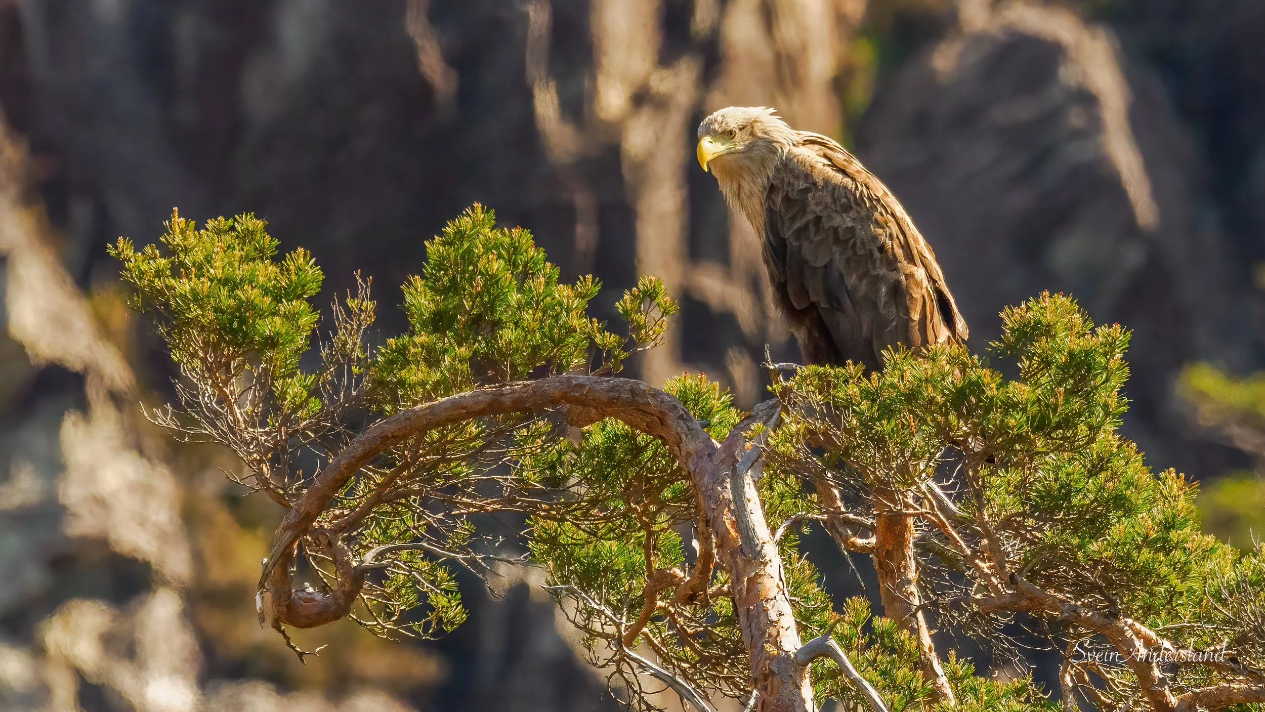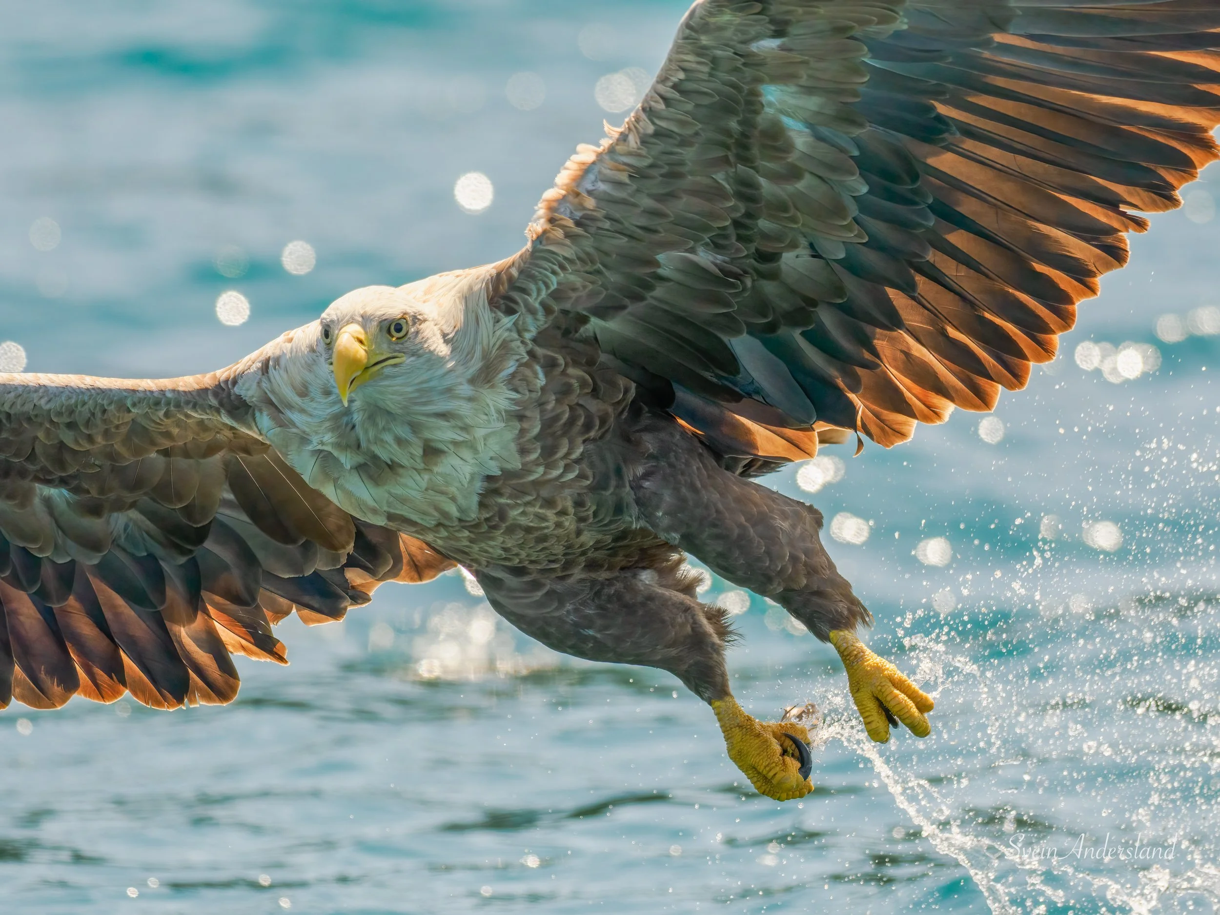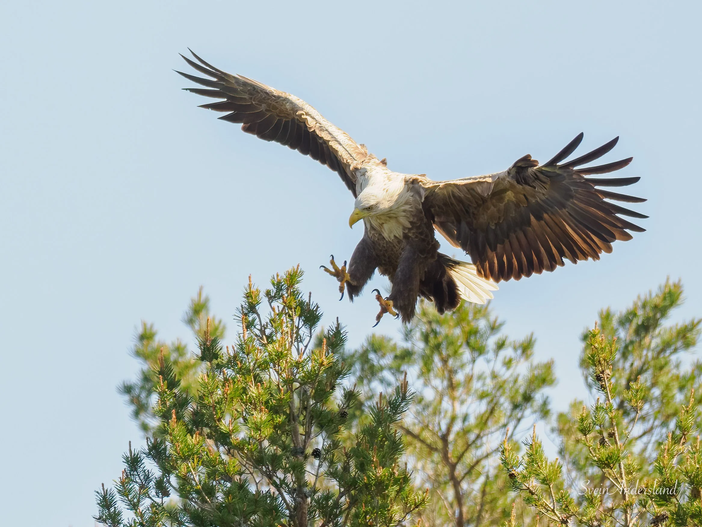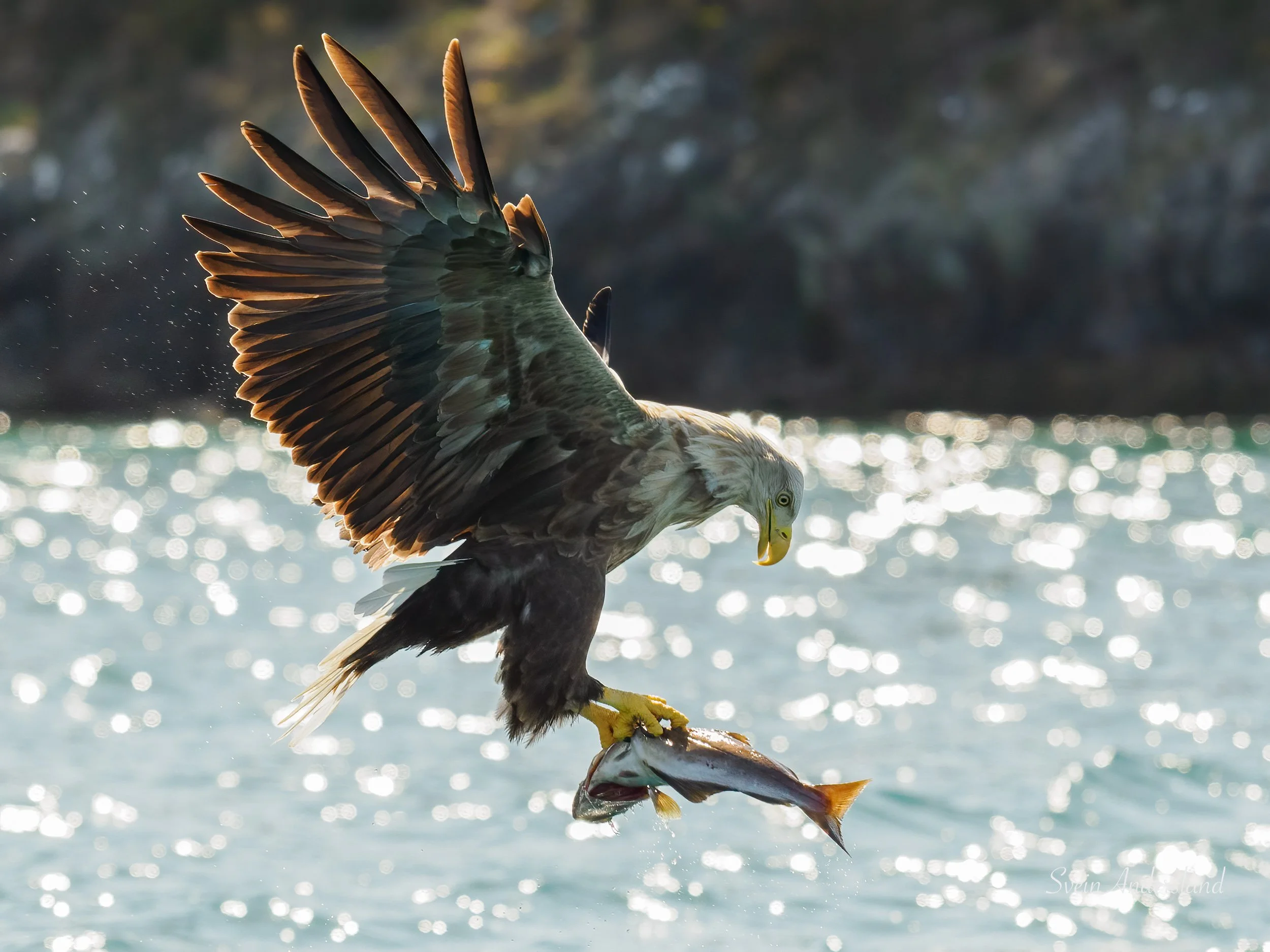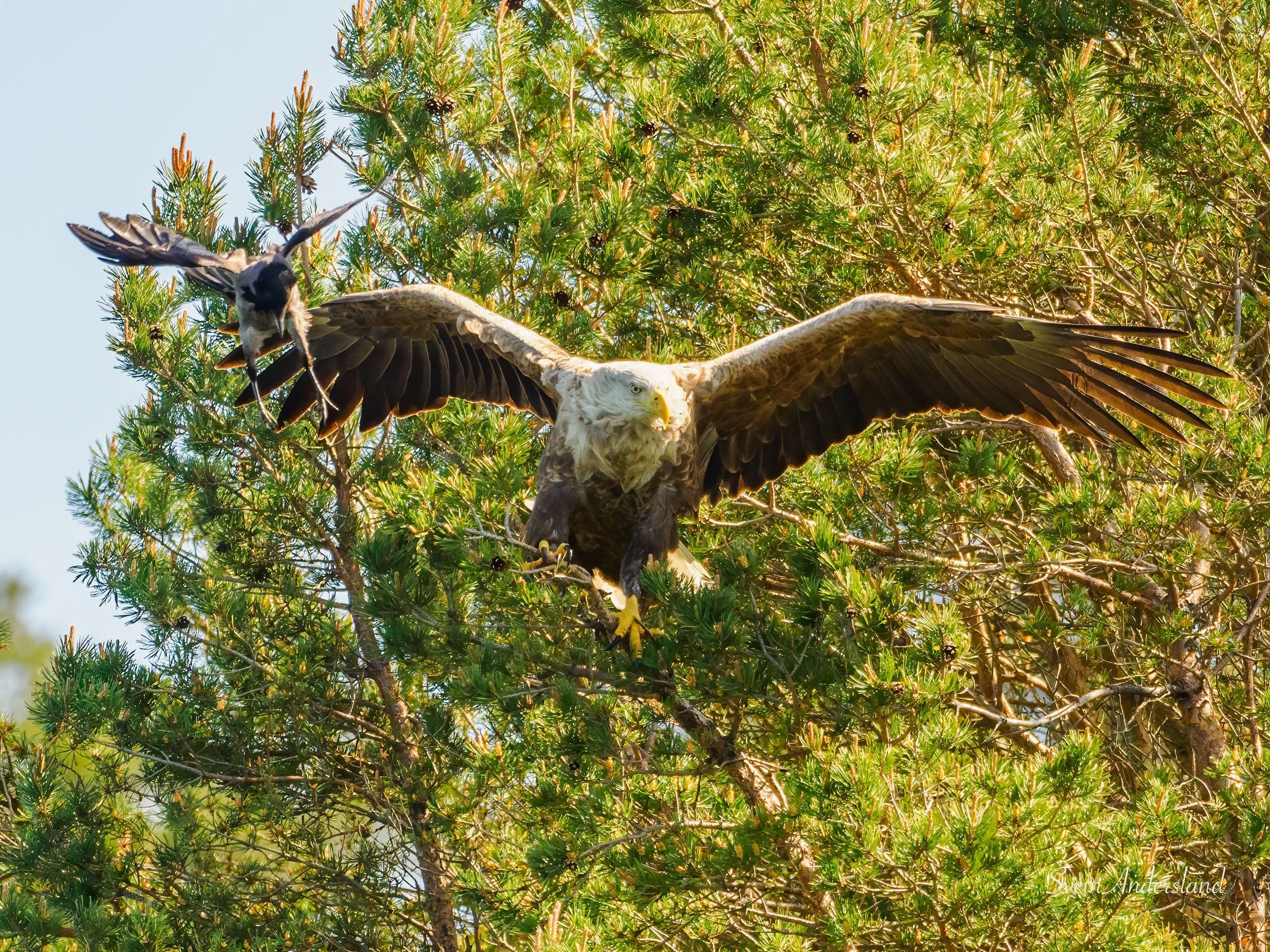 På veg til ein ny lokasjon lenger vekke vart det fiskestopp i nærleiken av vårt sårt sakna havørnpar. Der var likevel fiskelukka stor, og åtte fine paler i perfekt storleik hamna i fiskekassa. Dei skulle vise seg å vere gull verdt for ei havørn, Ottar, som i skytteltrafikk henta 10 fiskar! Da vi var tom, følgde Ottar etter oss langs land før den forstod at vi var på veg heimover. Mellom kvar fiskehenting gjekk det ikkje meir enn to minutt før han landa i næraste furutopp, meir enn klar for neste fisk. Det reiret har lagra mat for mange dagar! Ei slik ivrig og nærgåande havørn har vi ikkje opplevd før. Den var i lufta før fisken landa, og vi måtte kjapt bytte frå 300mm til telezoomen 40-150mm, da vi ikkje fekk båten langt nok vekk før havørna sette klørne i fisken. Det var skikkeleg havørnbonanza, og igjen ei ny og morosam naturoppleving i lag med våre vener havørnene.