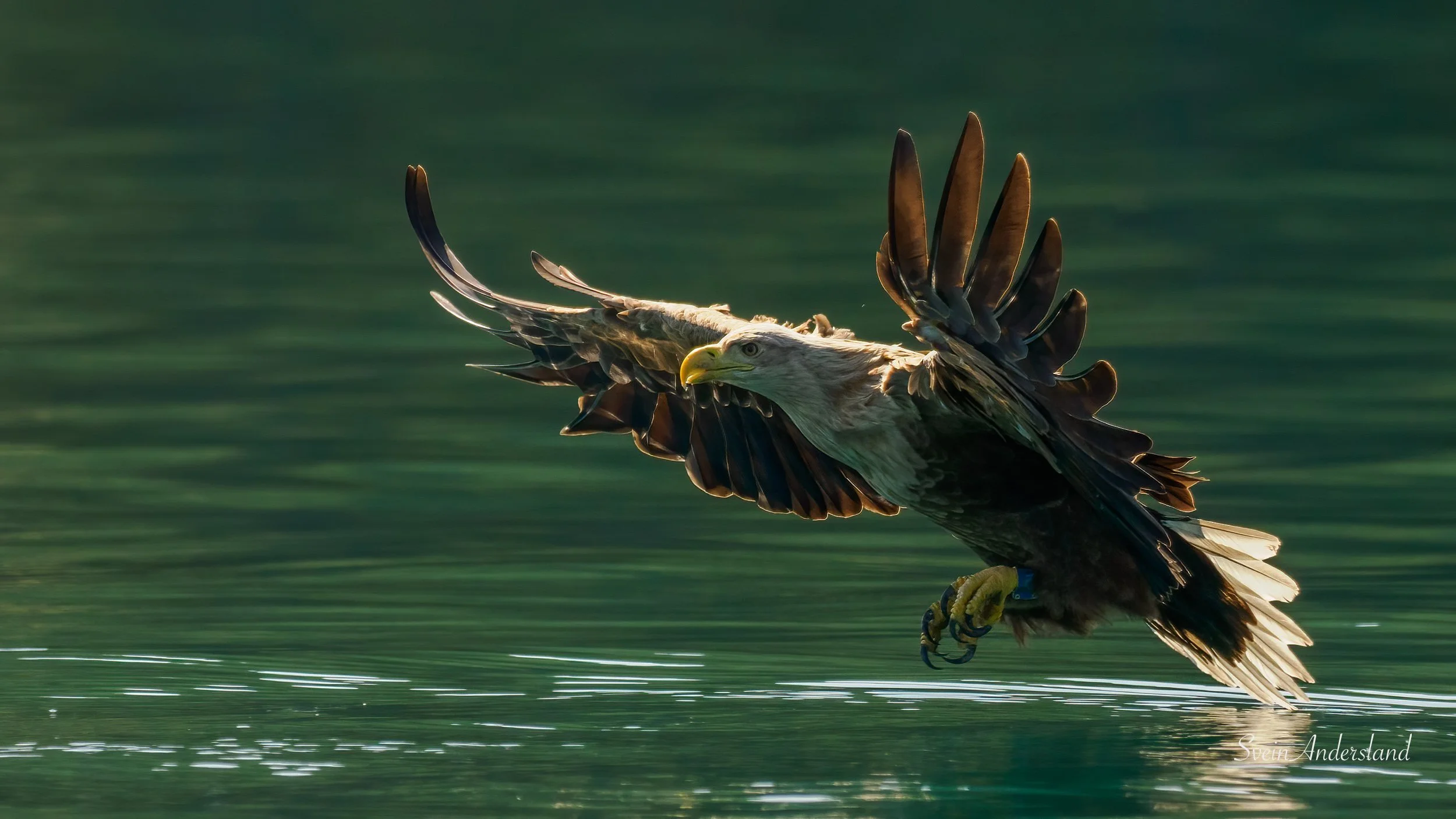Perfekt låg glideflukt med blikket festa mot fiskemålet.
