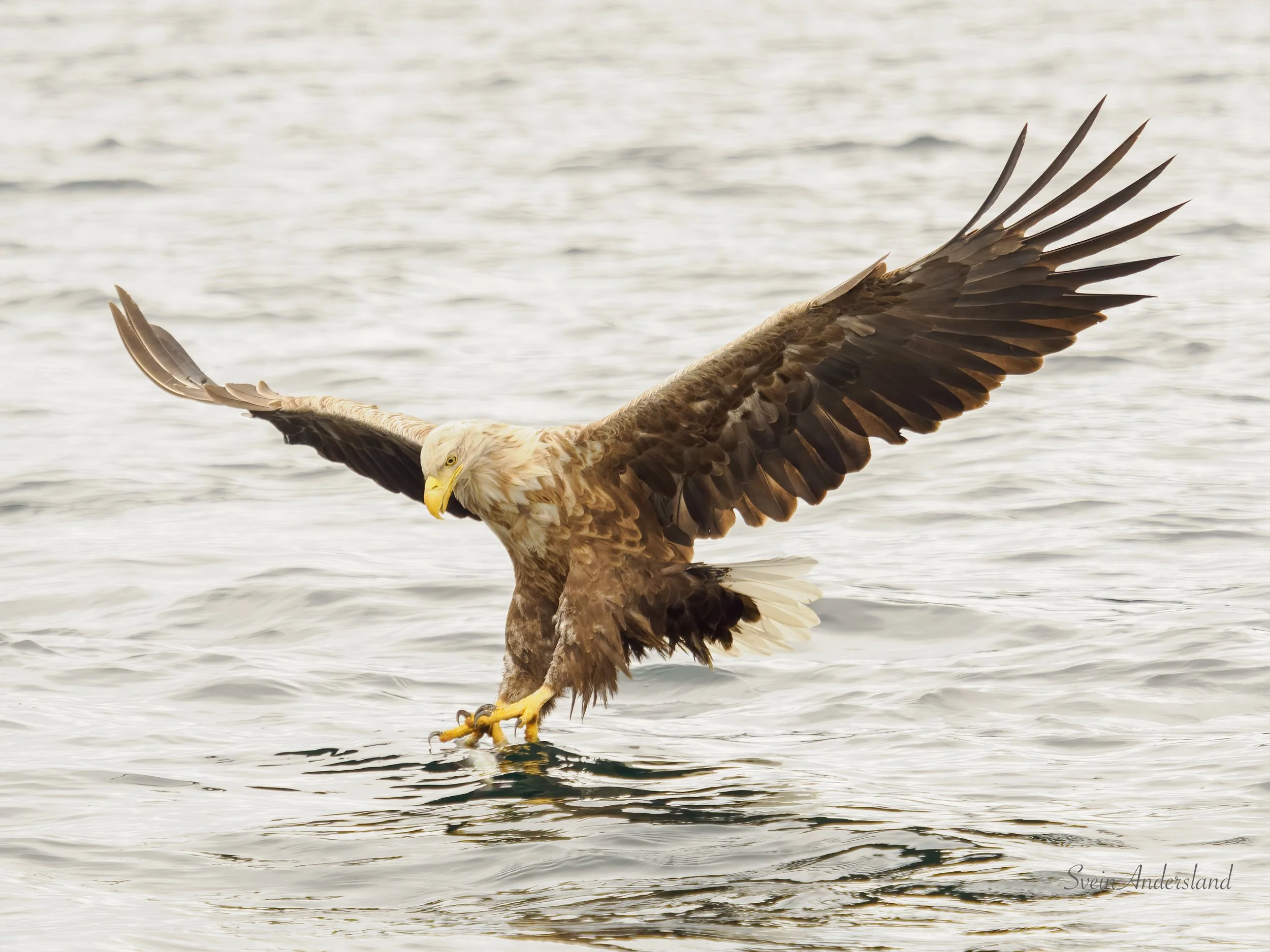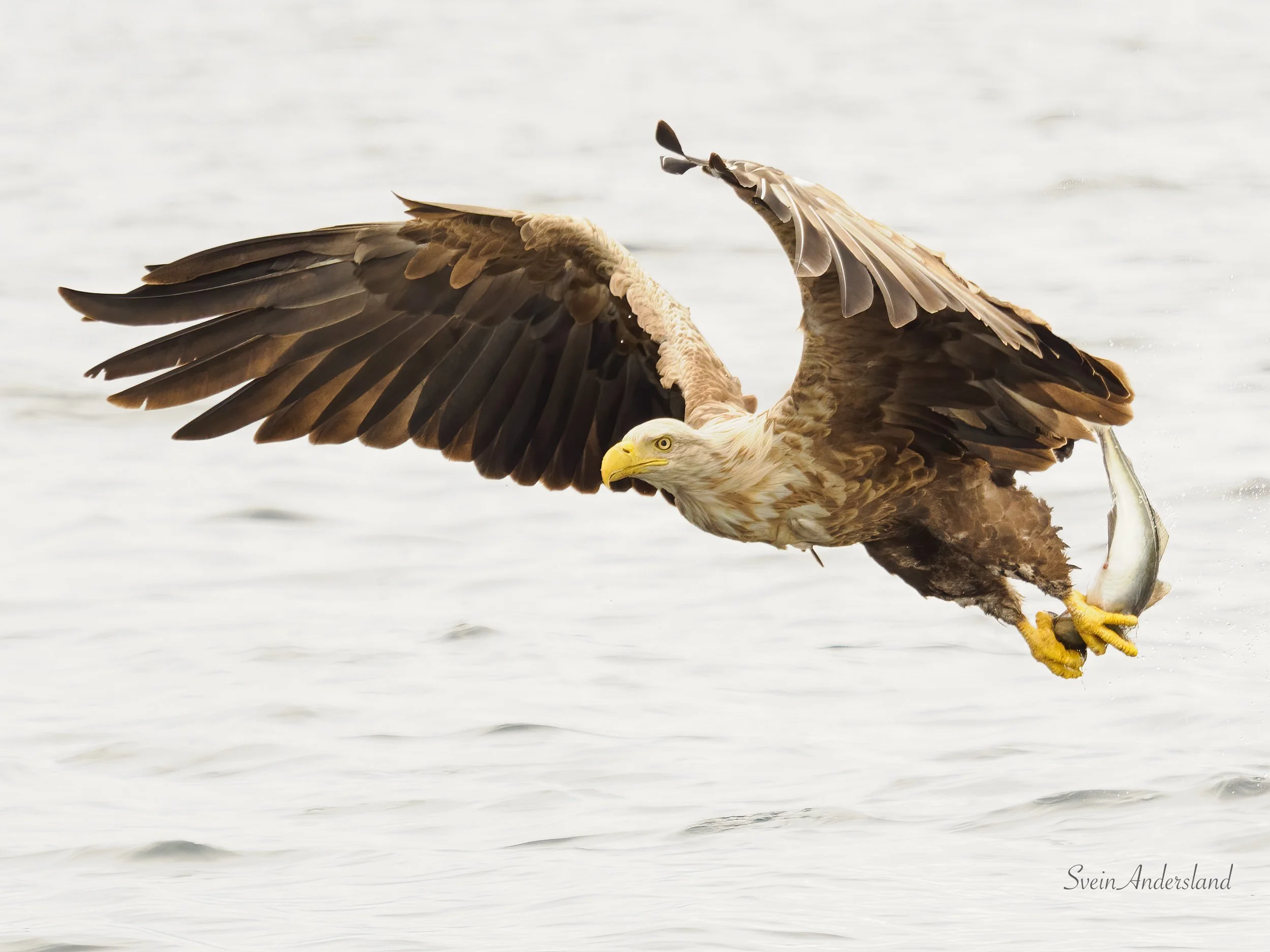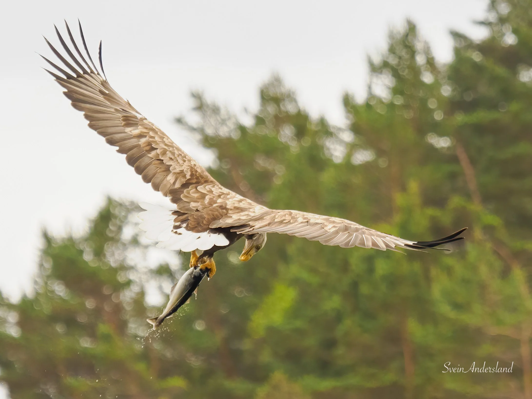 Første søndag i juli vart nok ein fin sommardag, og dagen eg fekk kontakt med ei ny havørn. Har sett etter den ein gong før, da dukka den opp utan at det vart tid til å hive ut fisk før den forsvant ut av syne. Denne gongen låg vi og fiska i nærleiken av der vi hadde tru på at den heldt til. Stor var difor gleda da den viste seg og sette seg på ei furugrein med tydeleg interesse for å hente fisk. Eg hadde fleire tinte paler i fiskekassen, pluss ein nesten tint litt større lyr. Til mi store overrasking sokk dei to første palene, og havørna viste inga teikn på å sjekke om det var mogleg å få tak i den. Lyren sjekka vi med håven om flaut før vi heiv den ut. Det gjorde den, og havørna heiv seg på vengene med ein gong lyren traff overflata. Den kom for nære for 300mm, men fekk likevel nokre brukbare bilete. Dei tre første bileta nedanfor er frå denne økta. Den frakta lyren til eit svaberg like ved, åt litt, før den fauk til det som sannsynlegvis er leirplassen. Sidan viste den seg ikkje, sjølv om vi låg lenge og fiska opp fleire paler like ved. Desse palene kom neste havørnpar tilgode, og her var det god aktivitet frå første stund. Ca fem kast vart resultatet før vi sette kursen heim att, etter fem timar oppbyggande havørnekspedisjon.