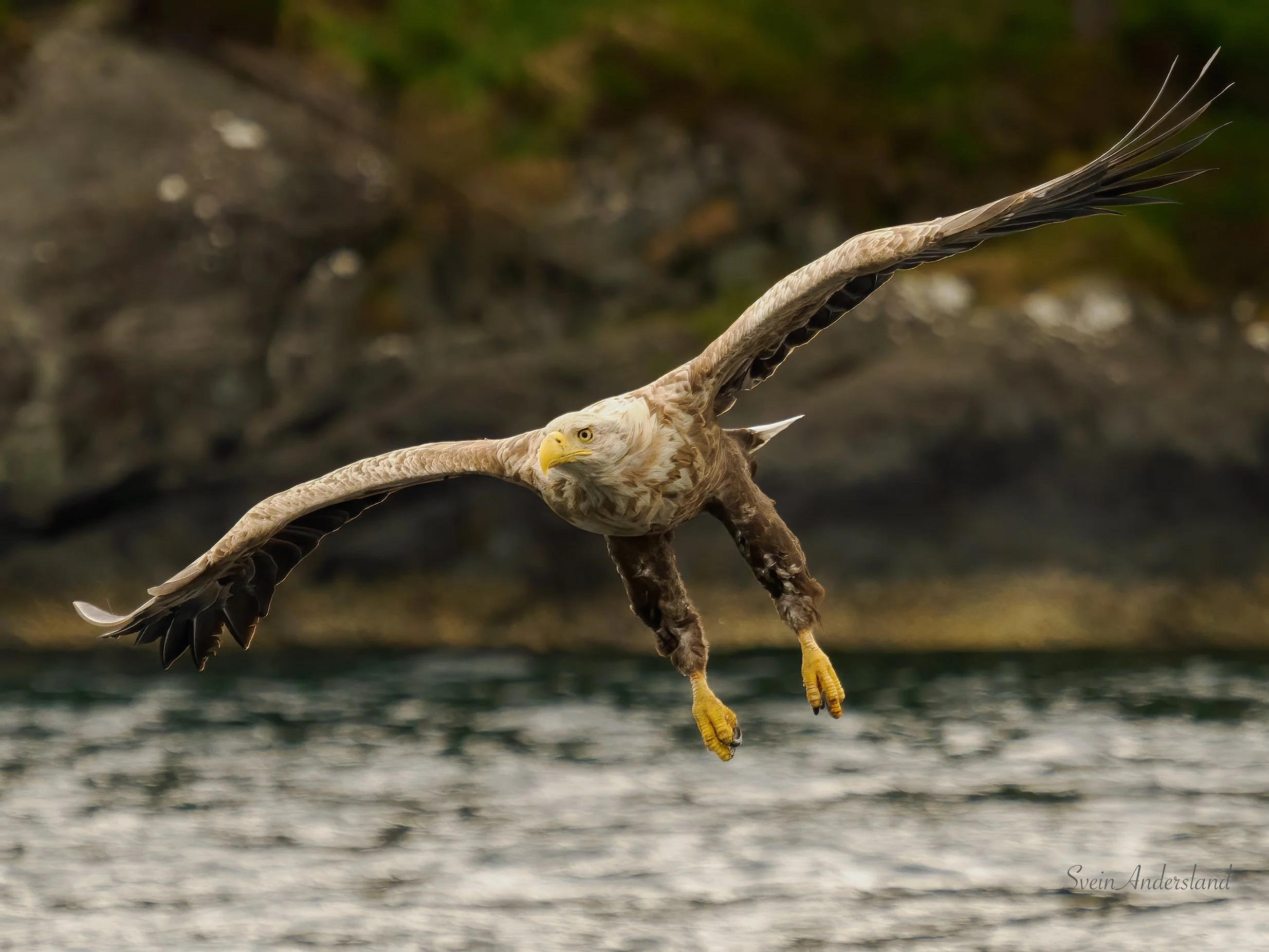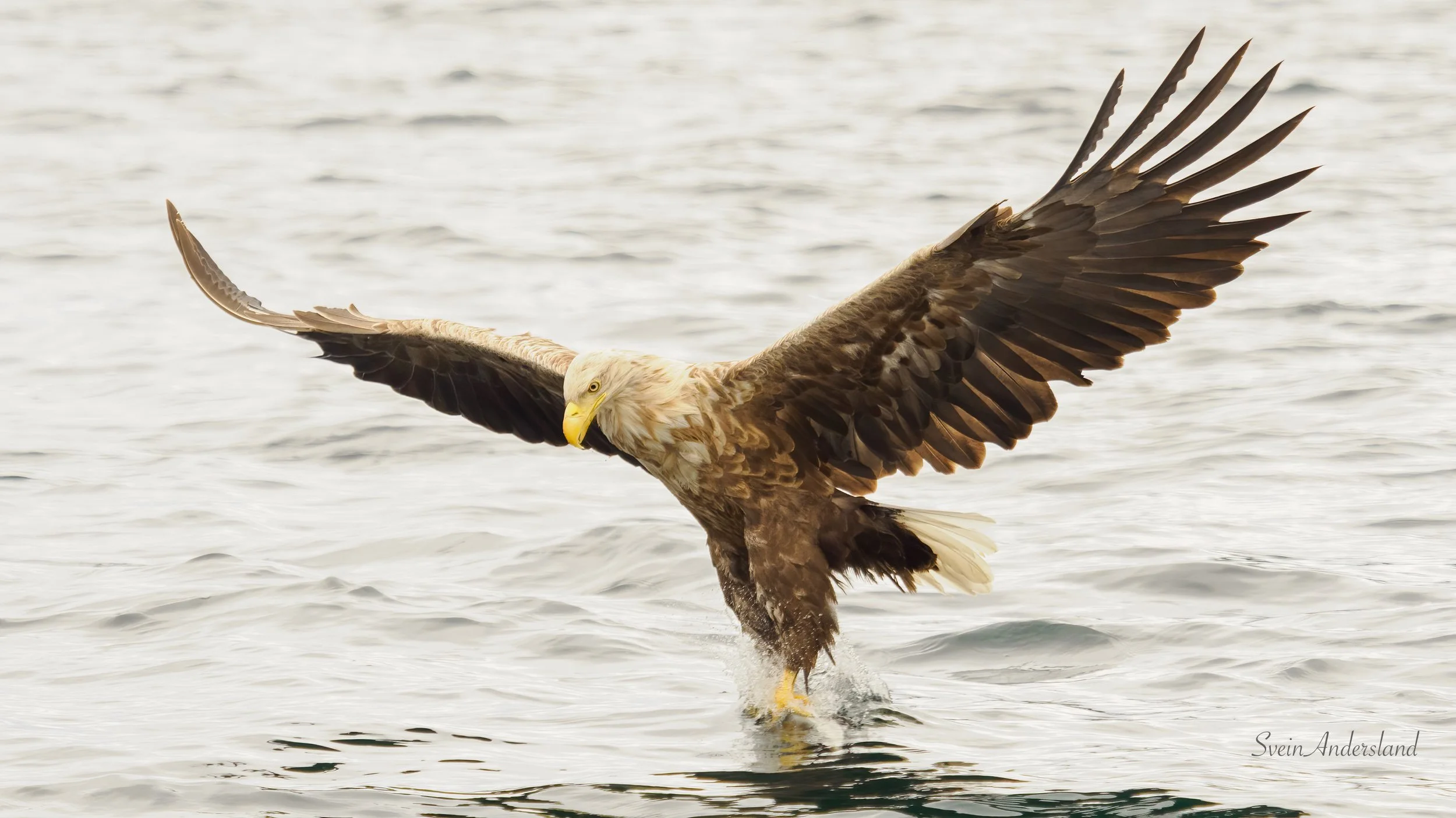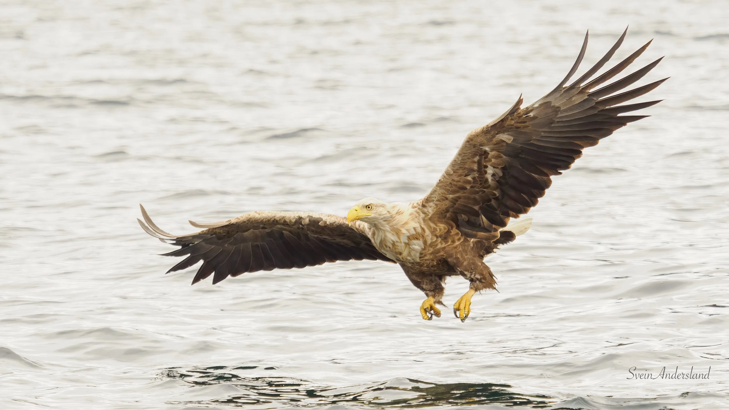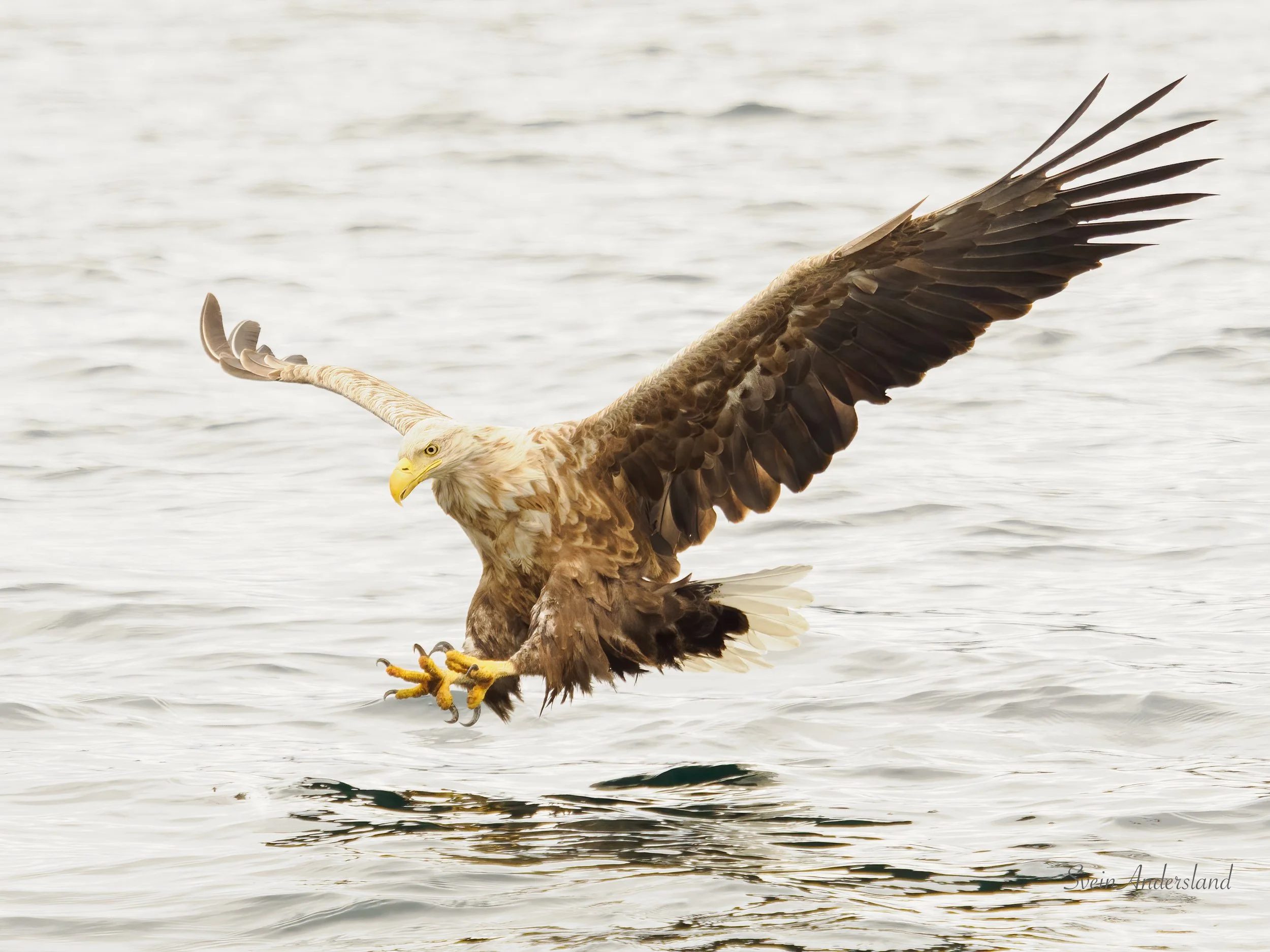Første søndag i juli vart nok ein fin sommardag, og dagen eg fekk kontakt med ei ny havørn. Har sett etter den ein gong før, da dukka den opp utan at det vart tid til å hive ut fisk før den forsvant ut av syne. Denne gongen låg vi og fiska i nærleiken av der vi hadde tru på at den heldt til. Stor var difor gleda da den viste seg og sette seg på ei furugrein med tydeleg interesse for å hente fisk. Eg hadde fleire tinte paler i fiskekassen, pluss ein nesten tint litt større lyr. Til mi store overrasking sokk dei to første palene, og havørna viste inga teikn på å sjekke om det var mogleg å få tak i den. Lyren sjekka vi med håven om flaut før vi heiv den ut. Det gjorde den, og havørna heiv seg på vengene med ein gong lyren traff overflata. Den kom for nære for 300mm, men fekk likevel nokre brukbare bilete. Dei tre første bileta nedanfor er frå denne økta. Den frakta lyren til eit svaberg like ved, åt litt, før den fauk til det som sannsynlegvis er leirplassen. Sidan viste den seg ikkje, sjølv om vi låg lenge og fiska opp fleire paler like ved. Desse palene kom neste havørnpar tilgode, og her var det god aktivitet frå første stund. Ca fem kast vart resultatet før vi sette kursen heim att, etter fem timar oppbyggande havørnekspedisjon.