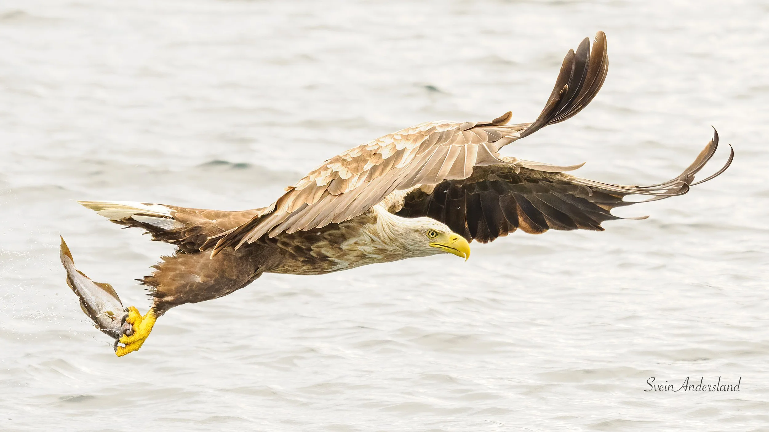 Det blir gjerne dei same type foto på desse havørnturane med båten. Havørna har stort sett same innflygingsprosedyre, så ein del av den fotografiske utfordringa er å finne nye motivariantar. Det klaffa denne gongen, ved at eg fekk tatt nokre bra bilete av havørna medan den et av fisken.