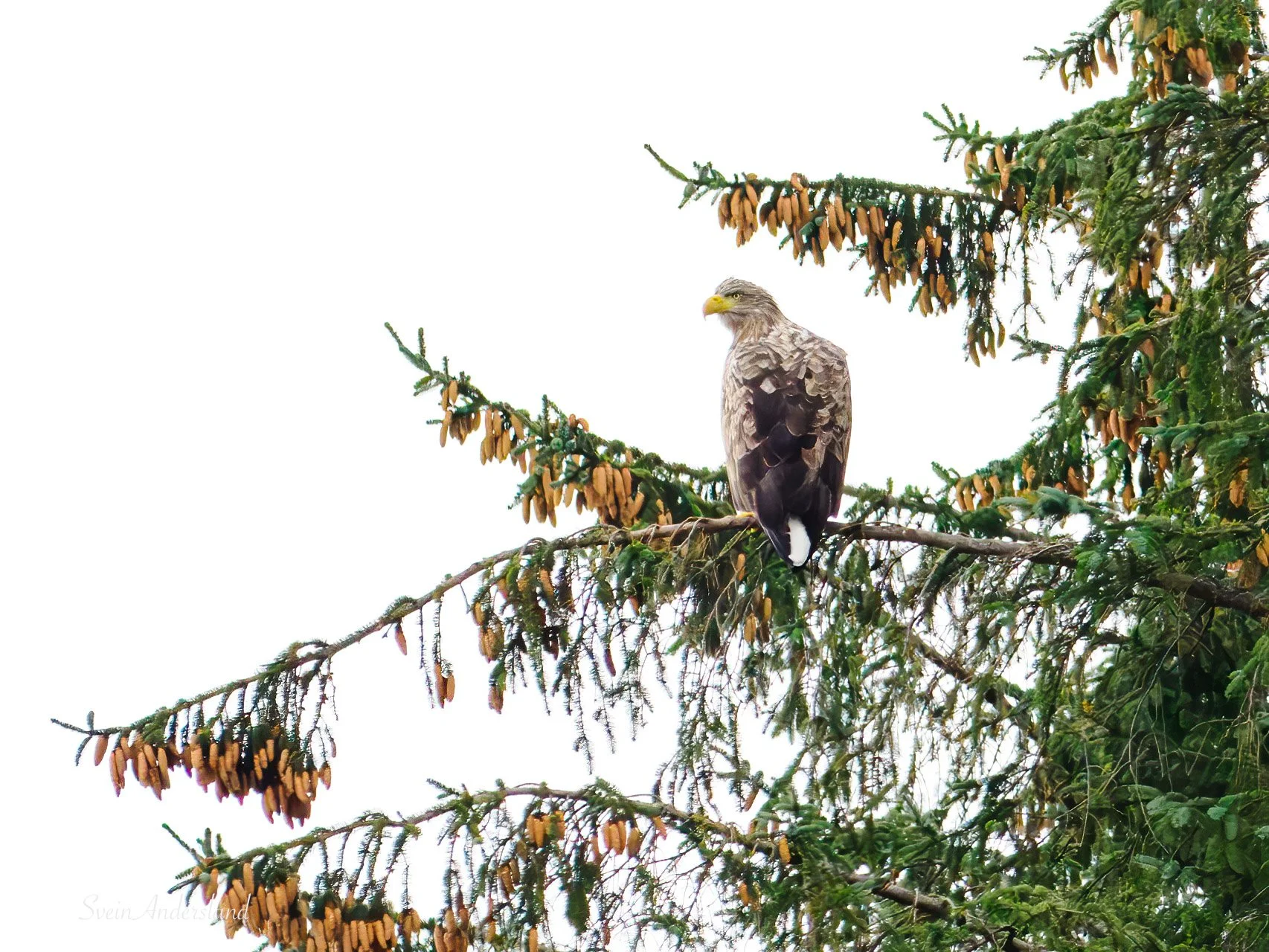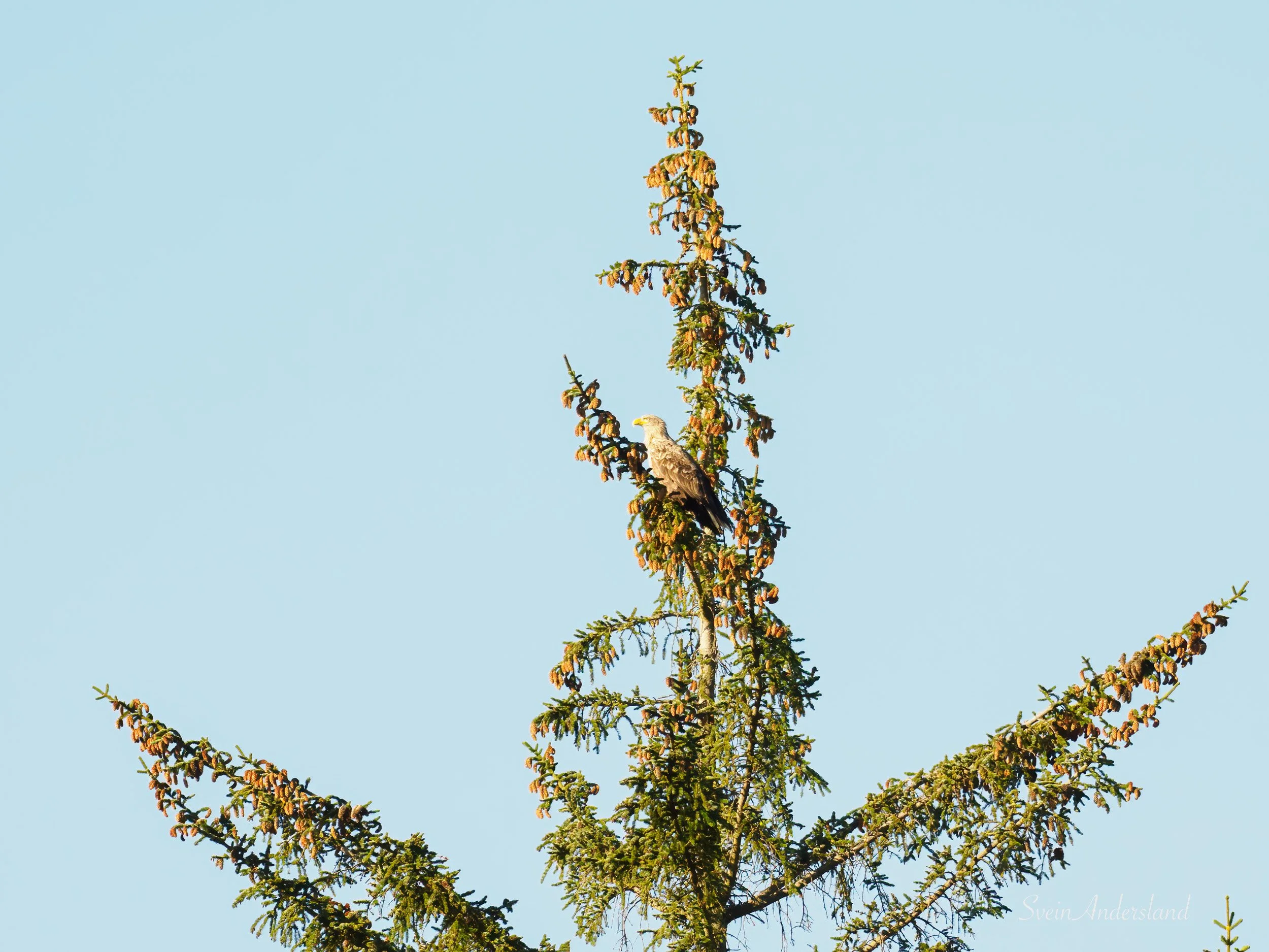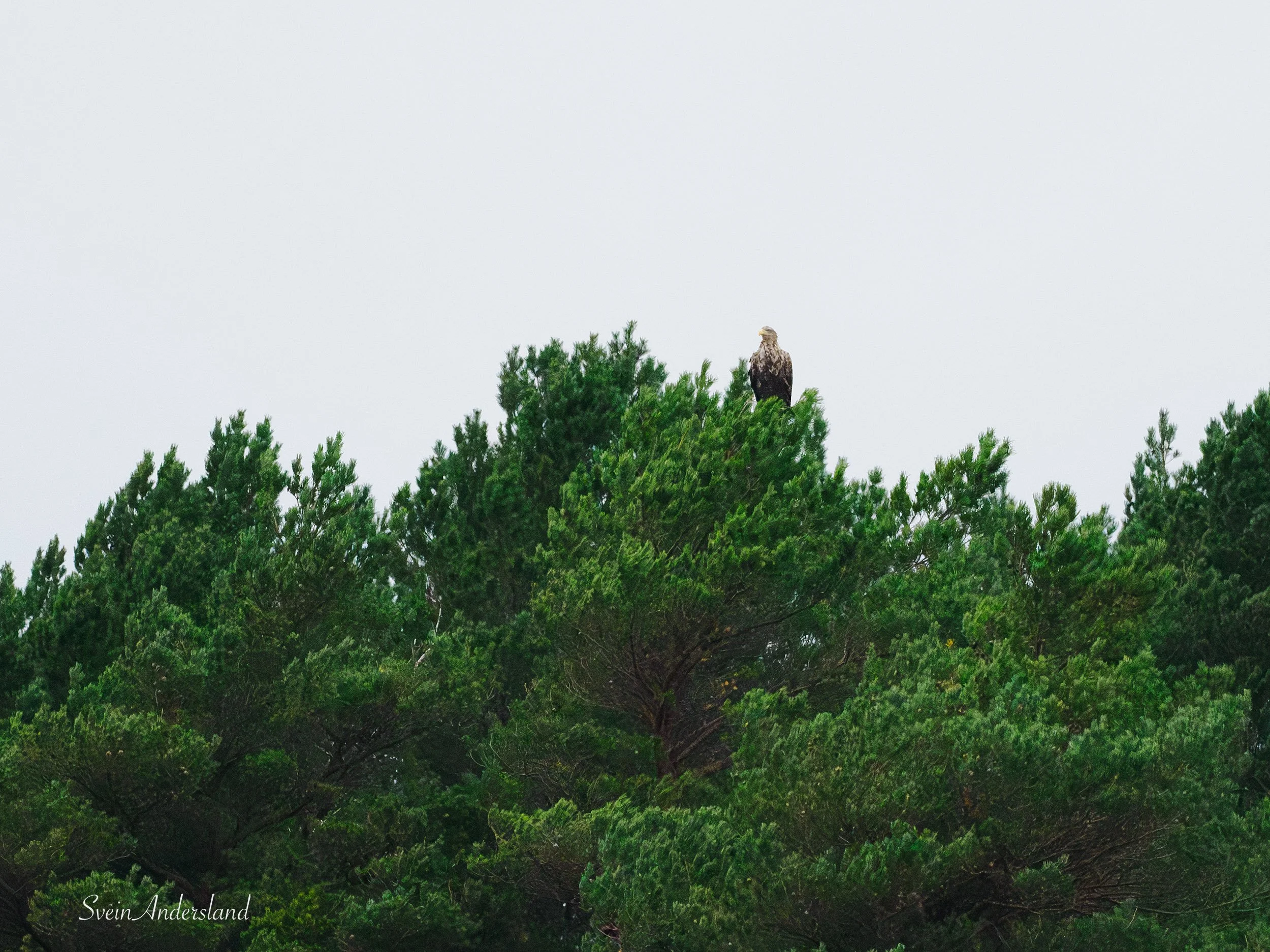 Denne dagen henta eg båten som hadde vore på treårsservice for Yamaha`en. På heimveg passerte eg ei havørn eg var usikker på om eg hadde sett før. Eg fekk tatt bilde av den på avstand, høgt oppe i eit grantre. Seinare skulle det vise seg at dette var ei ny havørn, sjå bilde lenger nede.