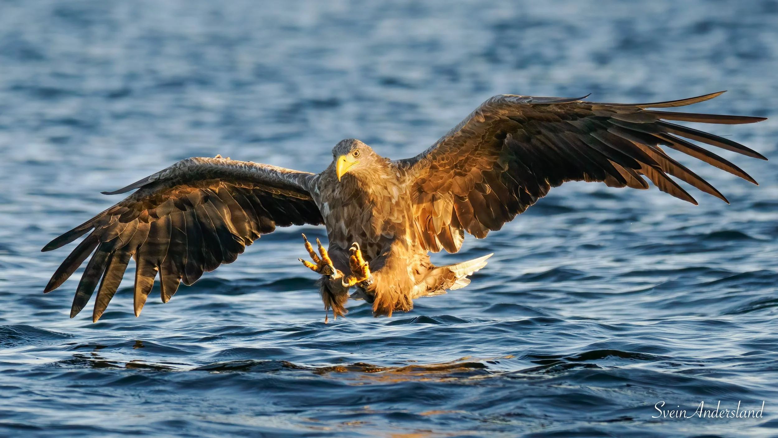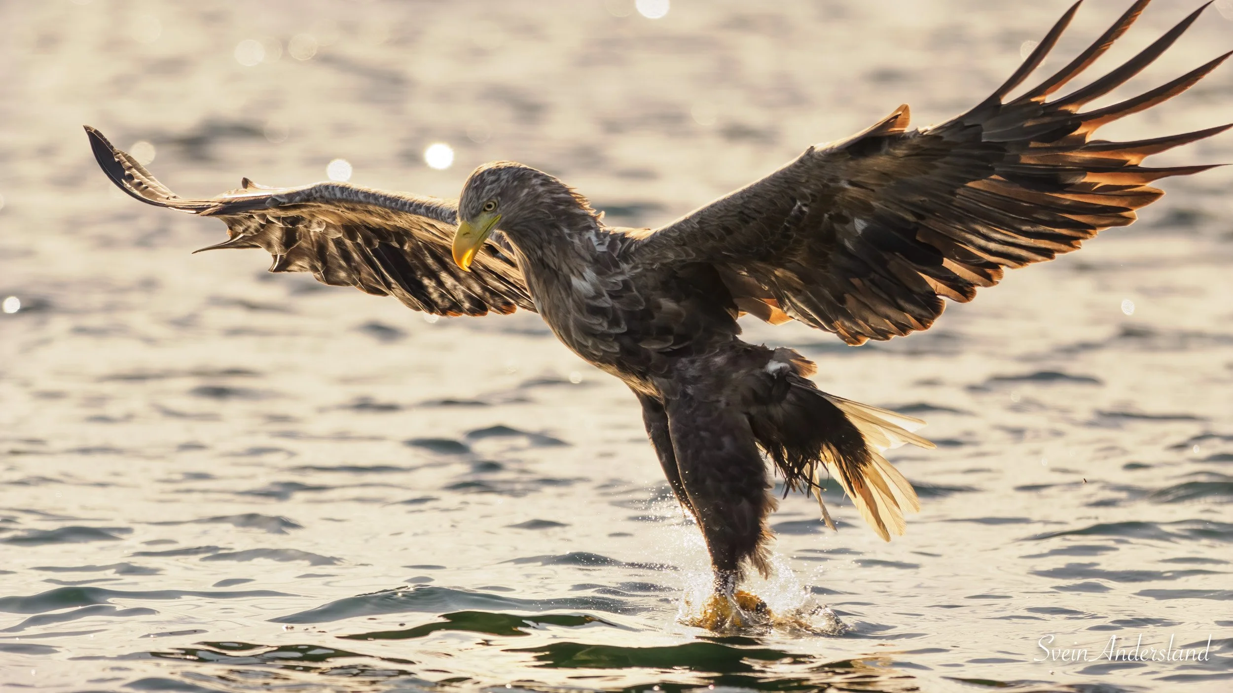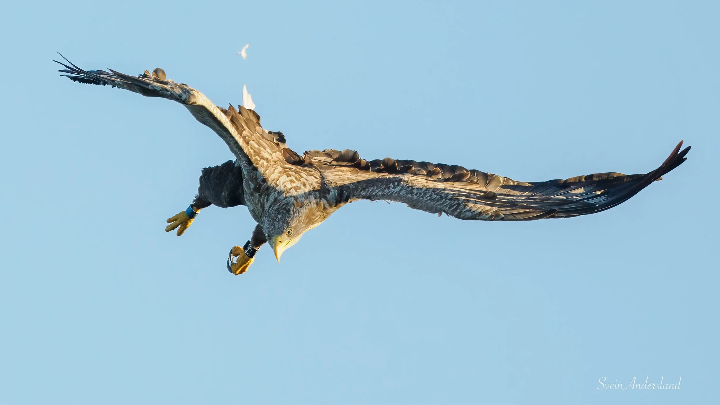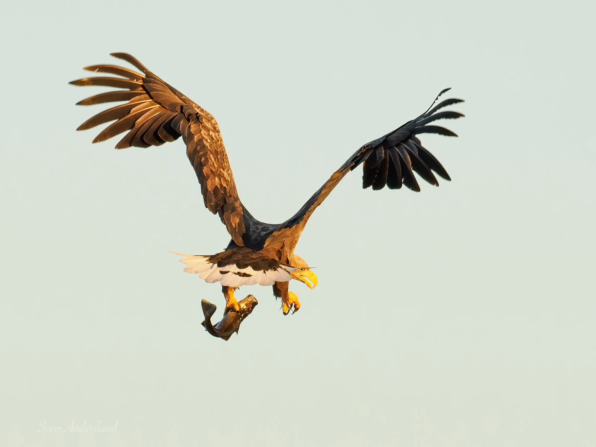 Var det ei ny havørn eg såg tidlegare på ettermiddagen? Ja, faktisk. Den dukka brått opp over båten på veg tilbake til hamna nærare solnedgang. Eg hadde meir fisk i kassen, og heiv kjapt uti ein. Ørna snudde, studerte den ei stund, før den bestemte seg for å trå til. Her snur ho seg tilbake og lurer kanskje på kven som heiv denne fisken? Eg følgde lenge med ho i kikkerten, og fekk eit bestemt inntrykk av kor ho sannsynlegvis skulle og kanskje har reir. Det er i tilfelle enda eit nytt havørnpar å følgje med på. Det er alltid like gøy å få kontakt med nye havørner.