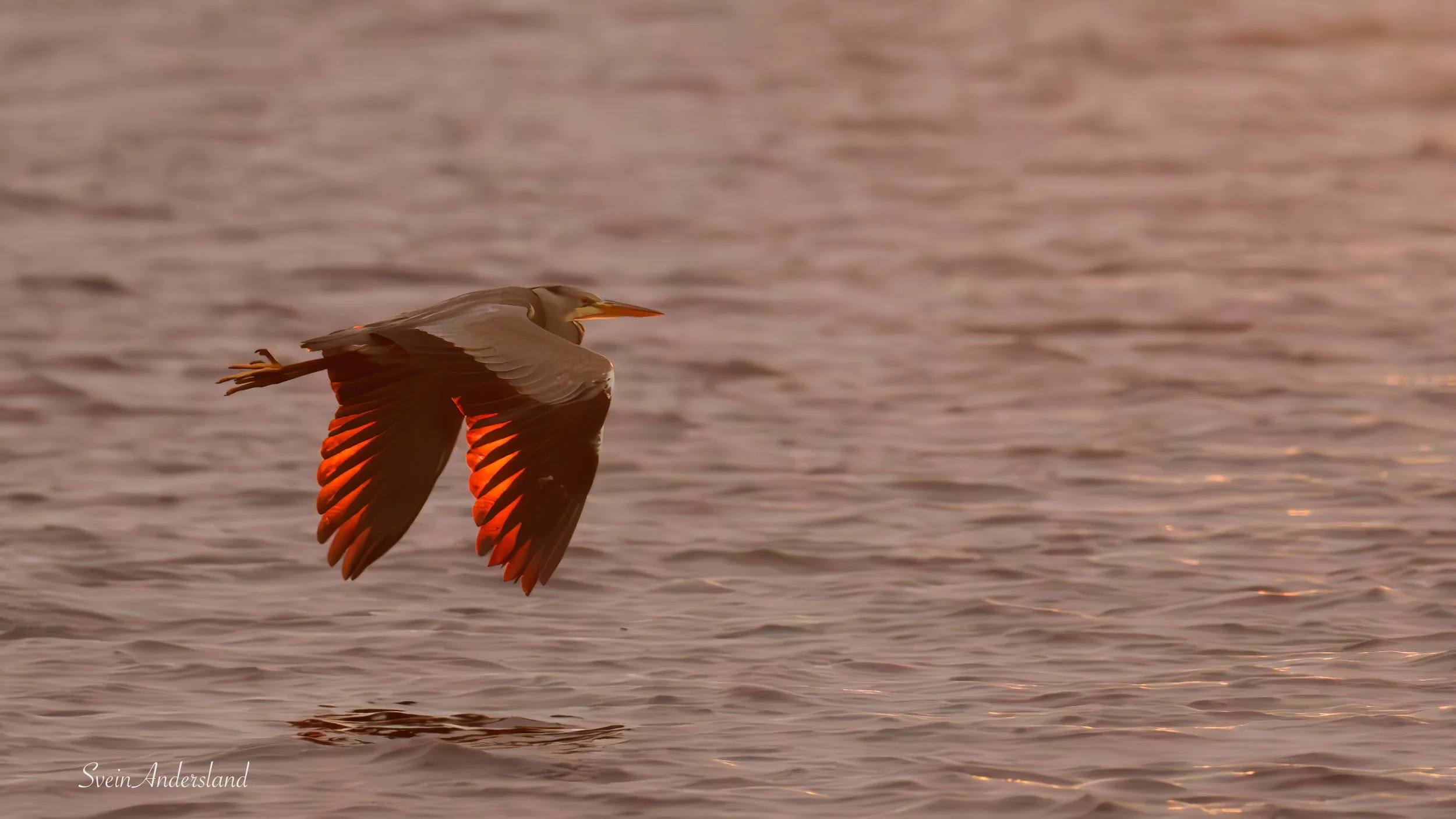 Tidleg på dagen var det ein flott soloppgang, som denne gråhegren spegla seg i. Det faste havørnparet her var dessverre ikkje heime.