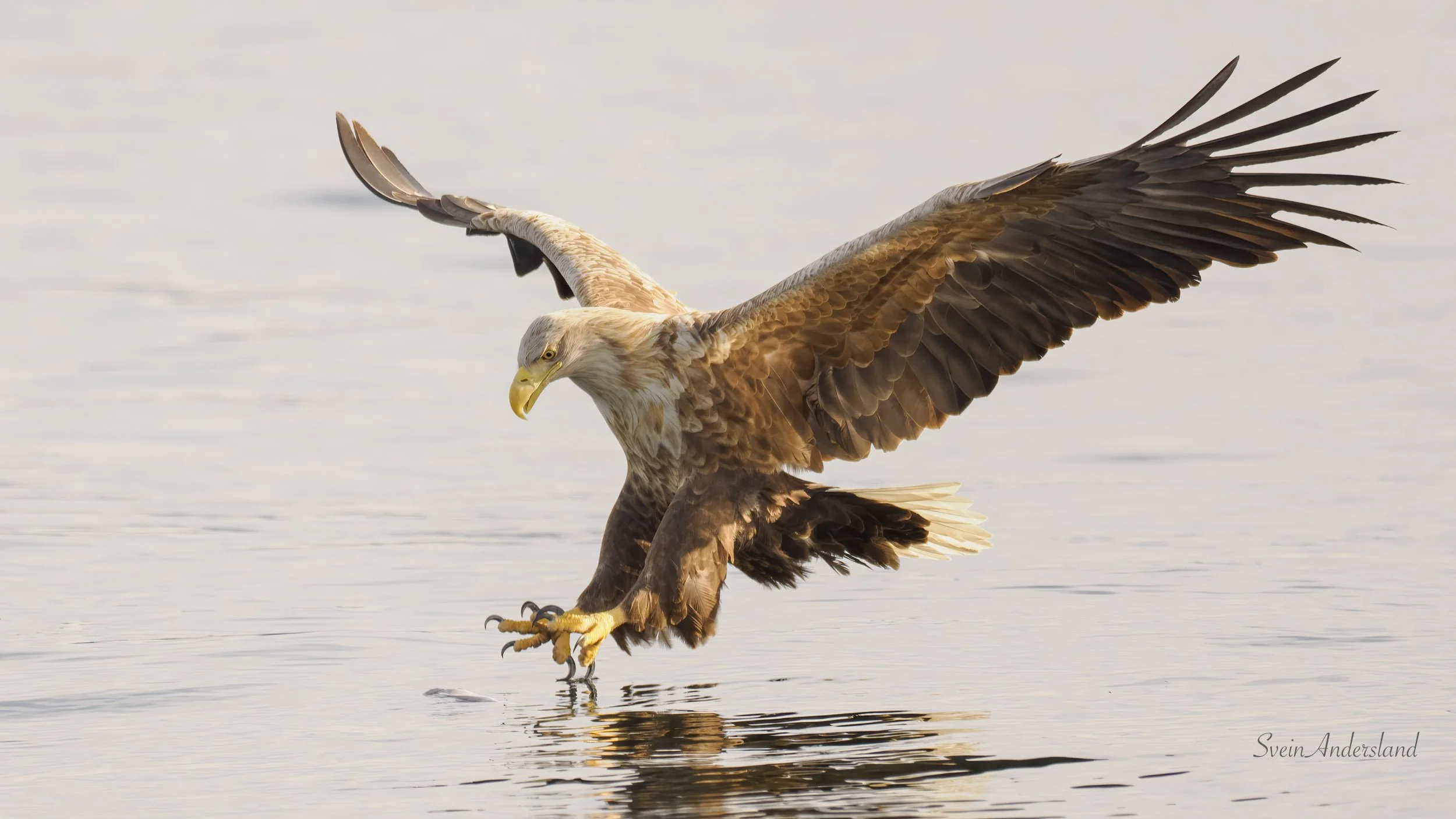 Havørnungen frå i fjor gjorde inga teikn til å fange fisk. Til slutt drog mamma Gunda vidare og ut av syne. Tydeleg at den vaksne dreiv opplæring. 1/1600s, f/5, ISO 400