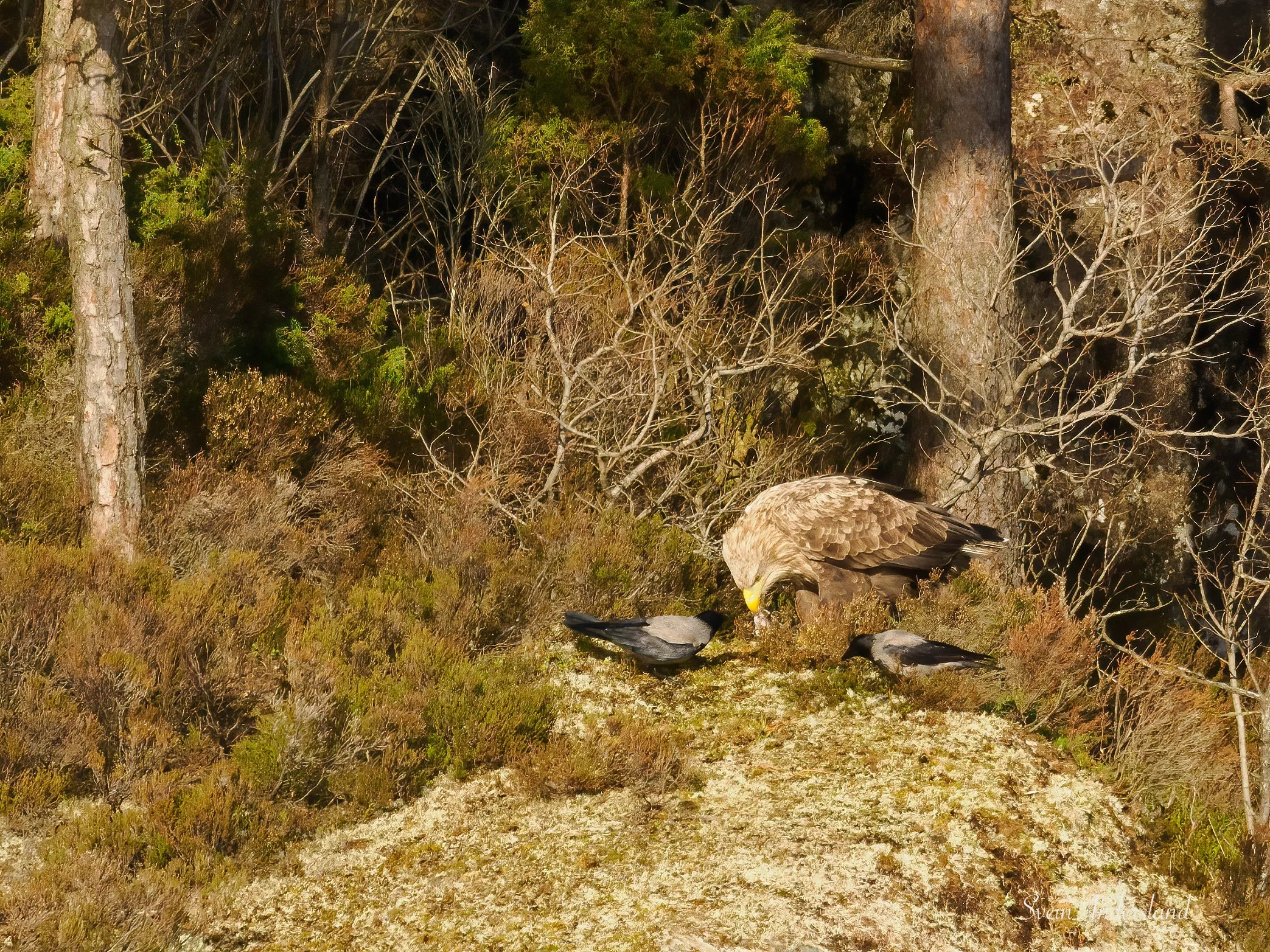 Den andre dagen i april vart det nok ein tur på sjøen. Timar på sjøen går fort, og vi rakk innom tre reir. Den eine havørna fekk fleire innpåslitne, og sikkert svoltne, kråker etter seg der den satt på land og ville ete i fred, sjå foto nedanfor. Havørna måtte flytte seg langs land fleire gonger for å få fred.