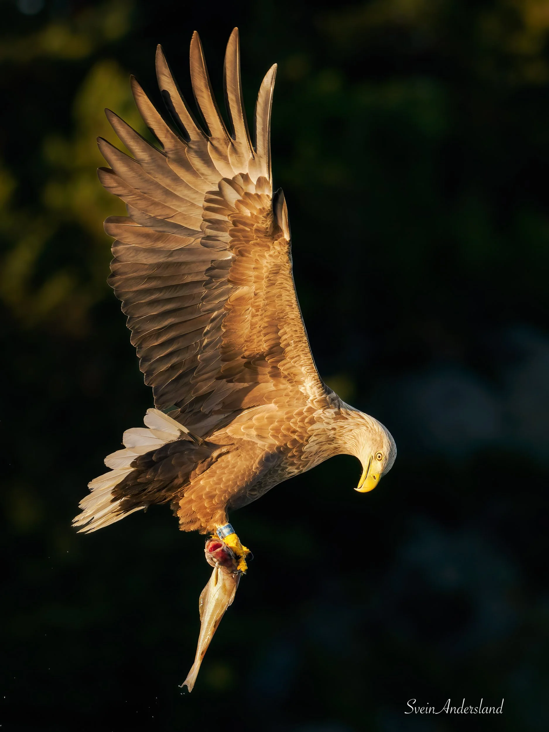 I mellomtida mista eg fokus på fisken eg heiv uti, og rekna med at den hadde sokke. Eg heiv difor uti ein til, i tilfelle Ottar likevel ville ha meir og kanskje ta den med opp til reiret. Ein svartbak tok etter kvart sjansen på å lande og prøve å ete av den. Framleis ingen reaksjon på land. I det eg startar Yamaha`en for å hente den opp, dessverre for seint da den sokk før eg kom fram, så ser eg den andre havørna, Gudrun, plukke opp den første fisken eg heiv ut. Den hadde likevel ikkje sokke, men følgd straumen ut frå land, forvirrande nok i ei anna retning enn båten rek. Gudrun bomma på første forsøk, men fekk den opp på andre med fleire måser på halen. Vi har sett fleire gonger at Gudrun har bomma på fisken. Kanskje ho ser dårleg og slit med koordineringa? Med fisken i klørne flaug ho rundt eit nes og ut av syne. Der åt ho kveldsmåltidet i fred og ro, før ho brått kom tilbake. Eg hadde håpt at ho tok maten med seg i reiret, men dessverre ikkje. I mellomtida hadde Ottar flytta seg eit stykke lenger vekk, men likevel synleg i eit høgt furutre. Så der satt dei, begge to, utan å hente meir fisk verken til seg sjølv, eller opp i reiret. Det kan tyde på at dei ikkje har klart å få fram unge i år. Det er i tilfelle ein solid nedtur frå fotografen sitt perspektiv, men ikkje så uvanleg at havørnene ikkje får fram ungar kvart år.