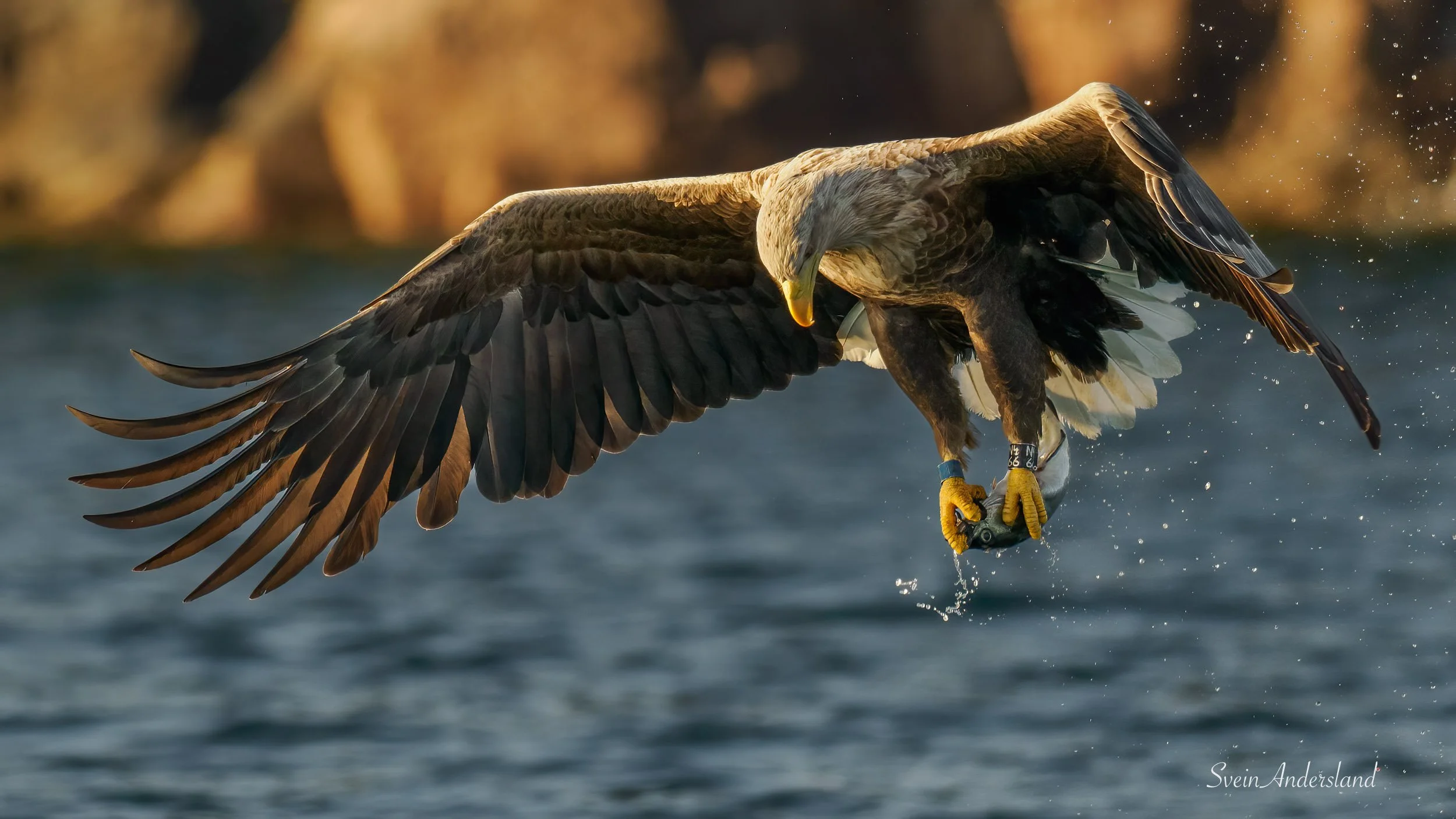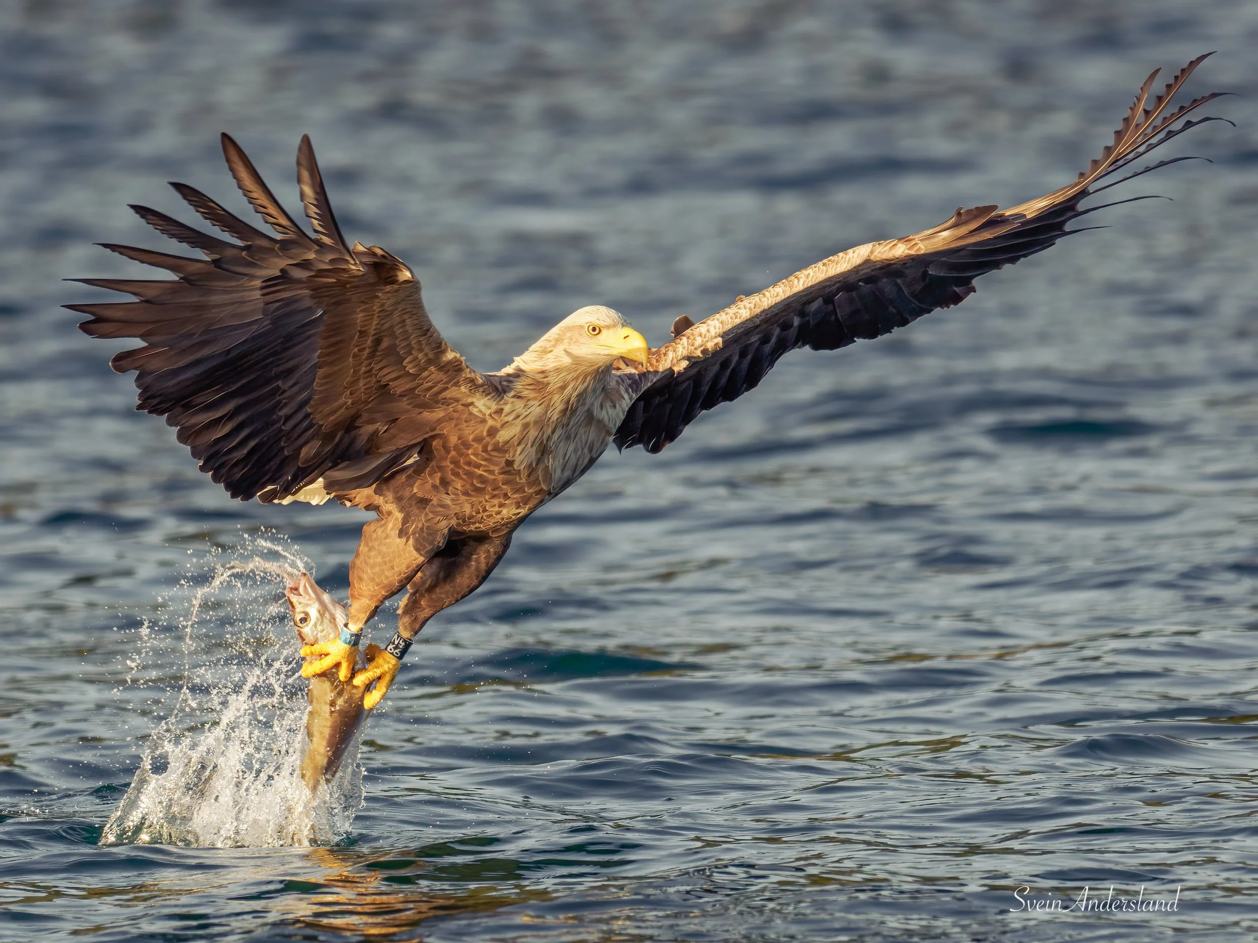 Havørna tar alltid ein kikk ned for å sjekke fangsten. Her prøver Otto i tillegg å feste venstre klør i fisken etter opptaket.