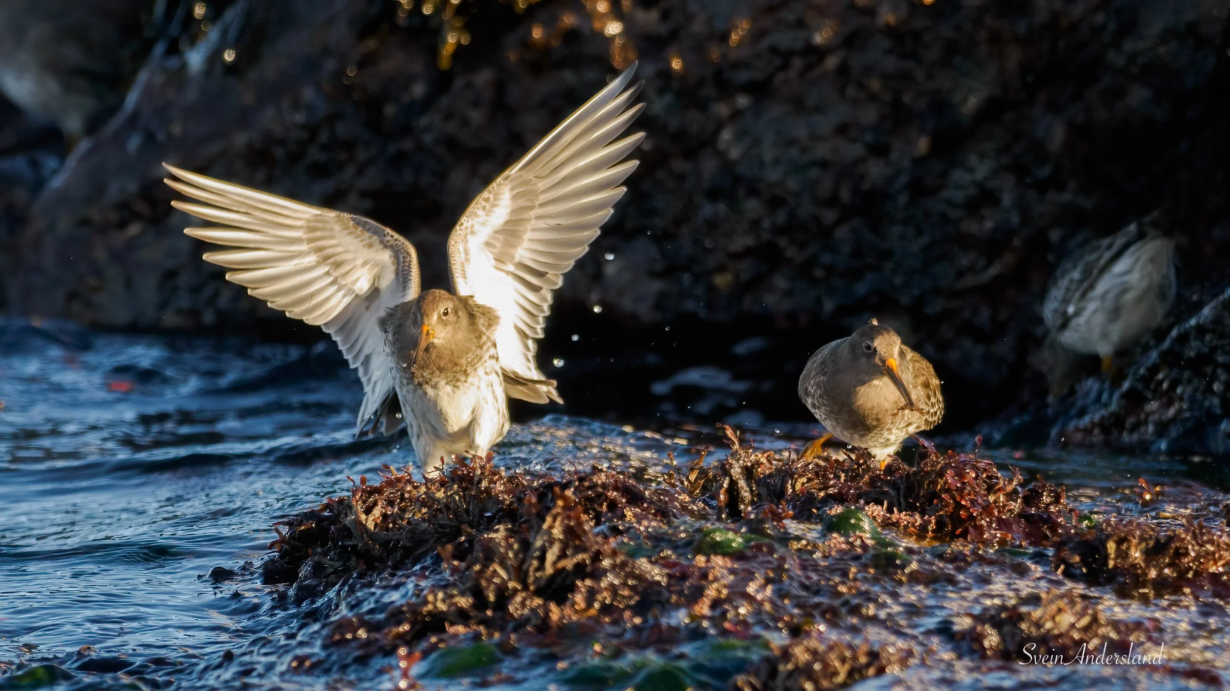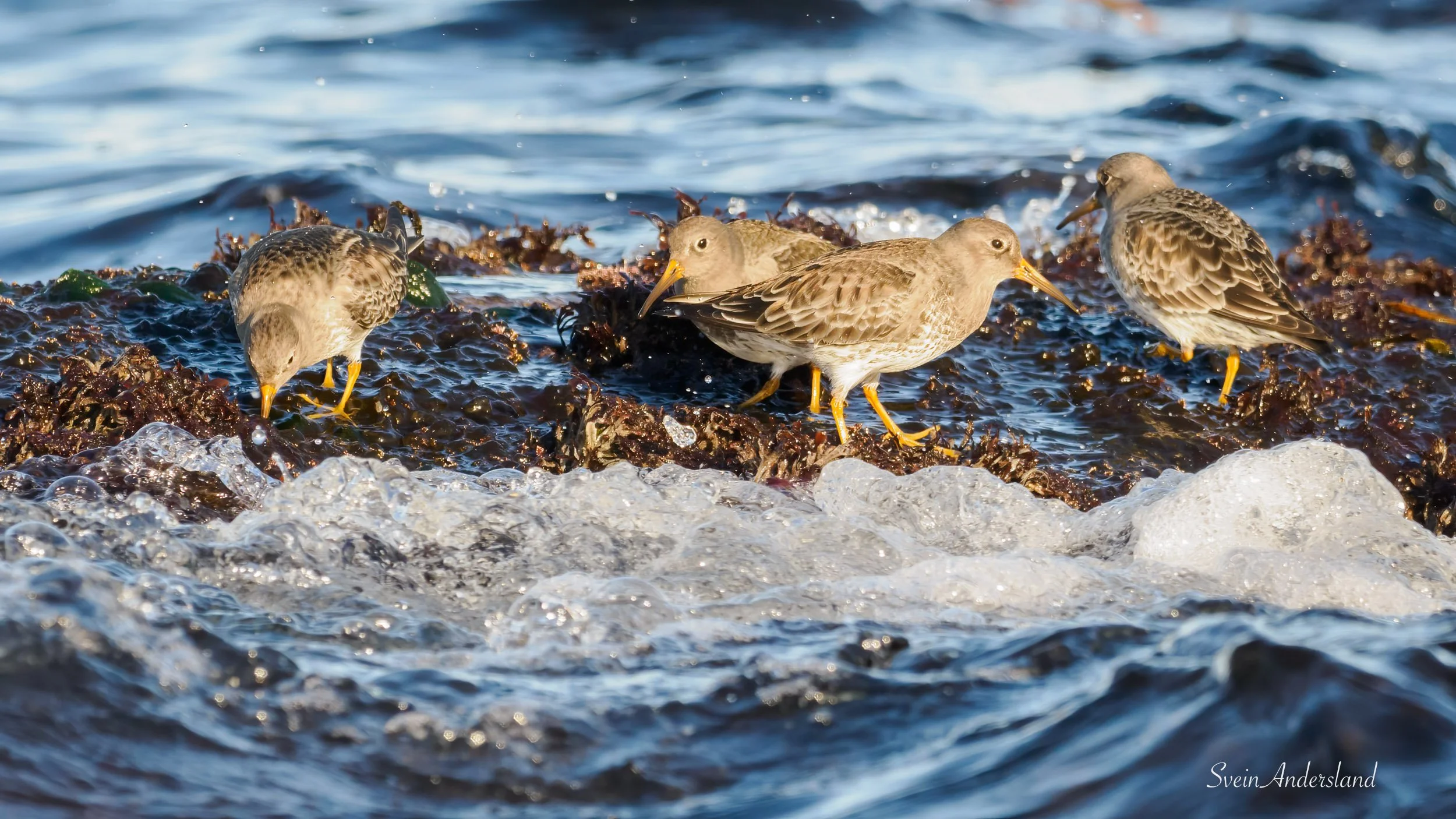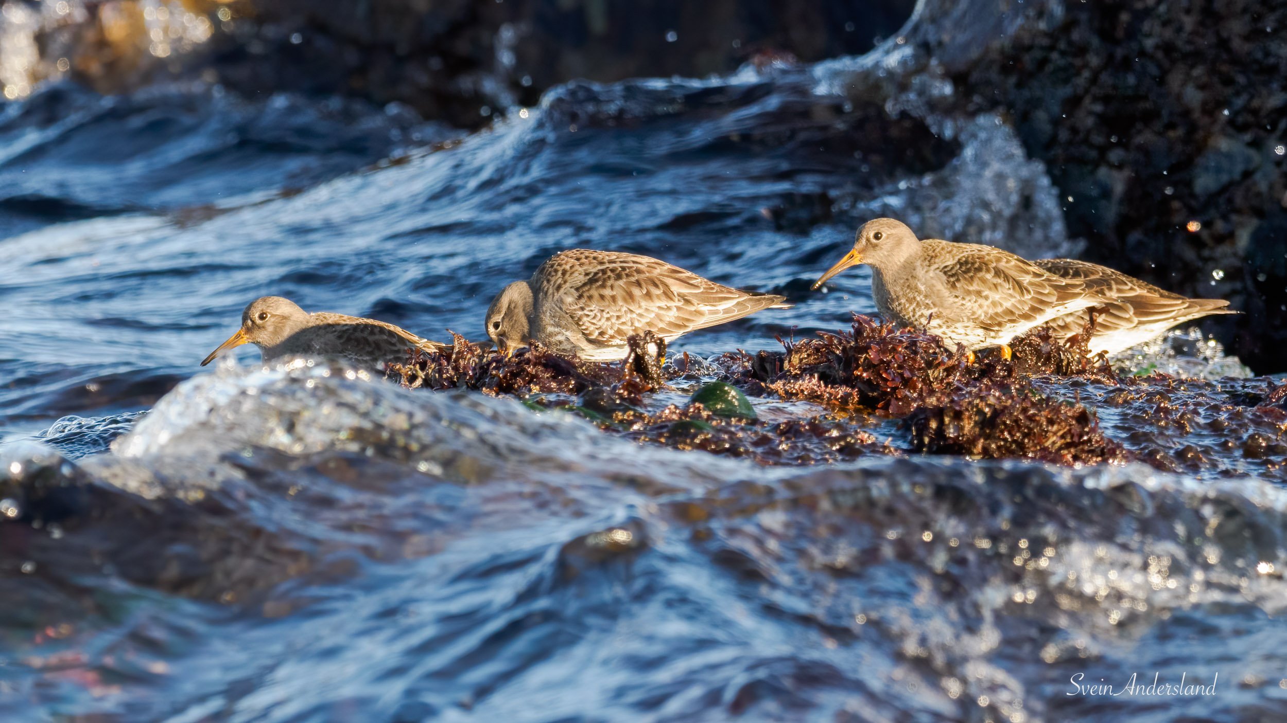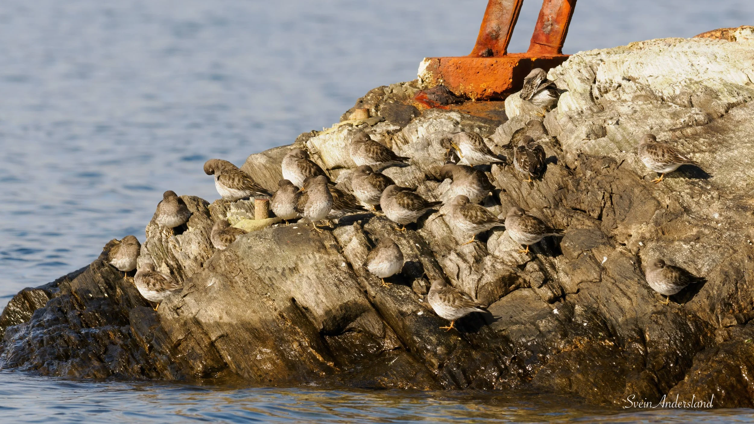 FJØREPLYTT. 24. mars låg eg og fiska ved Svollandsneset fyr utafor Utbjoa. På skjeret der fyret står såg eg nokre gråaktige klumpar som eg måtte sjekke nærare. Det viste seg å vere ein flokk på rundt 20 fjøreplyttar. Det var fjøre sjø, og dei var i full aktivitet med å finne seg mat. Lite brydde dei seg om bølgjene som slo imot dei. Dei ber namnet sitt godt, fjøreplyttane.