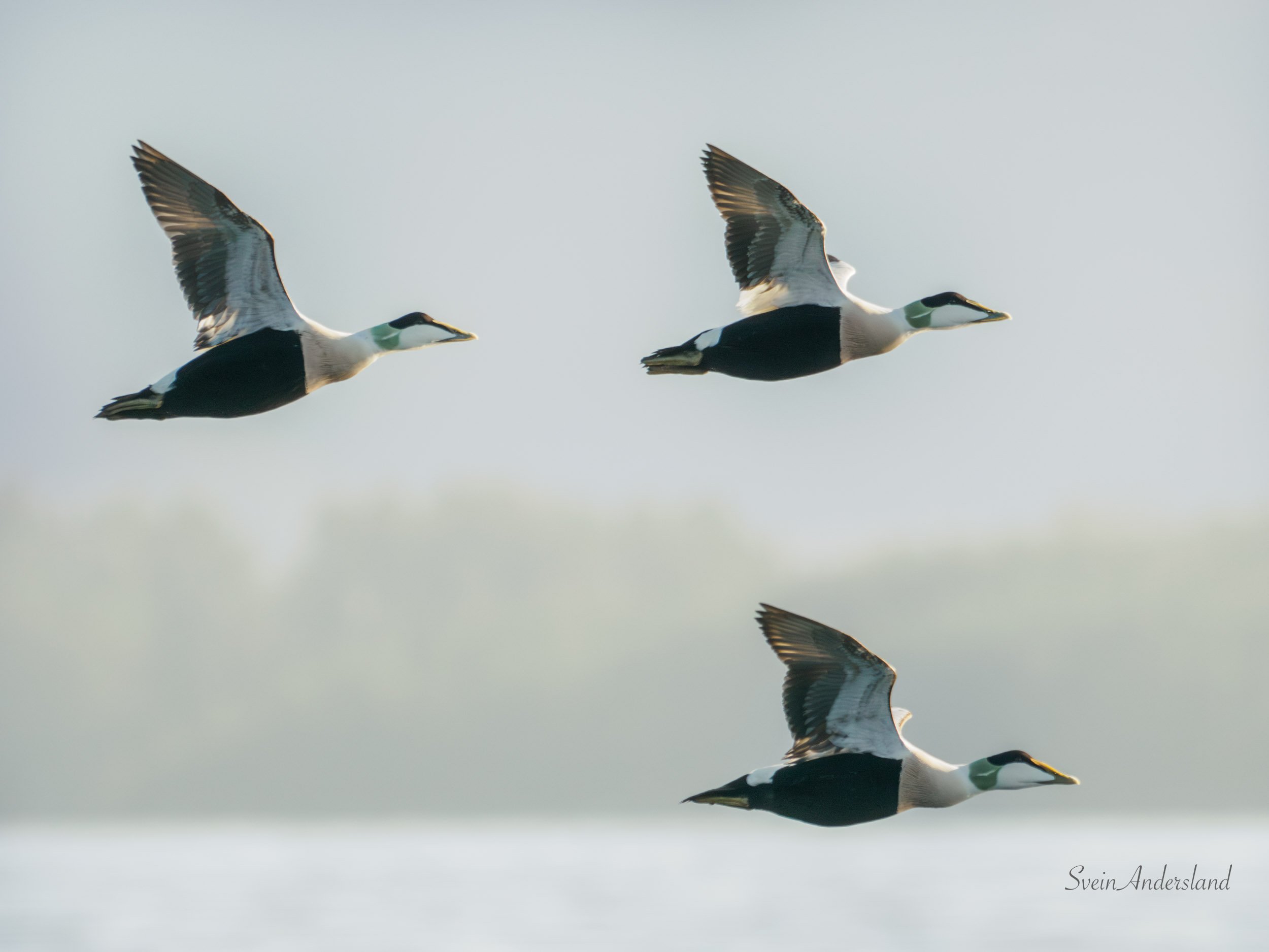 ÆRFUGL. 26. februar kom ein flokk på rundt 40 ærfugl i stor fart i ein stor boge rundt båten. Her er tre av dei.