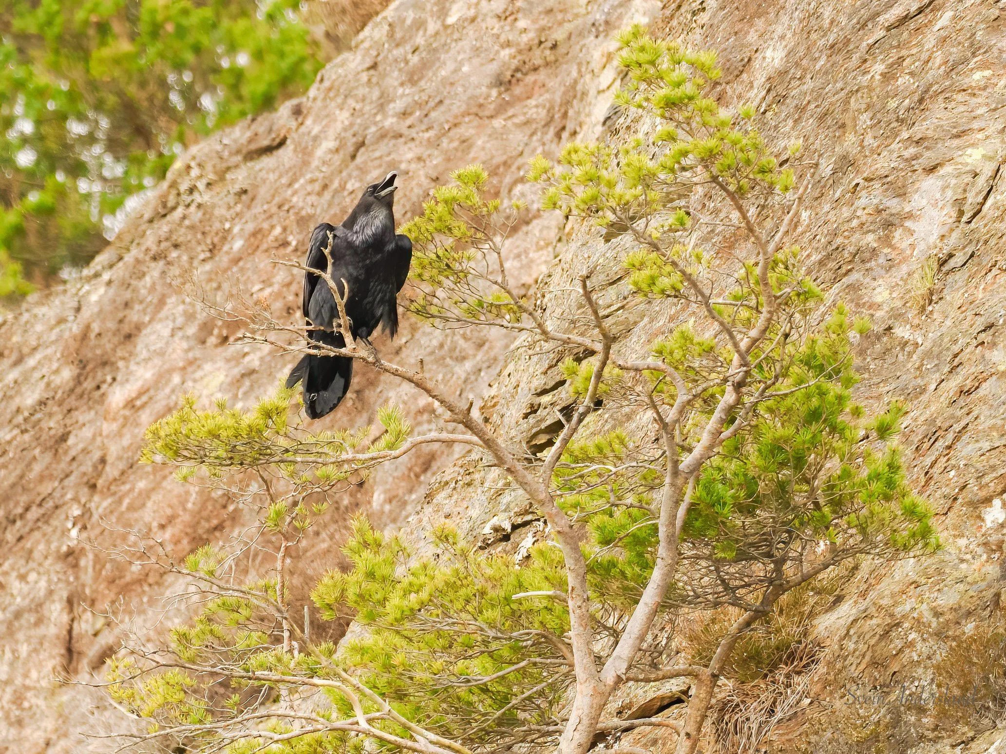 RAVN. 16. april svinga vi innom eit ravnereir for å sjekke status. Reiret såg ut til å vere blåst ned og denne einslege ravnen ga lyd frå seg.