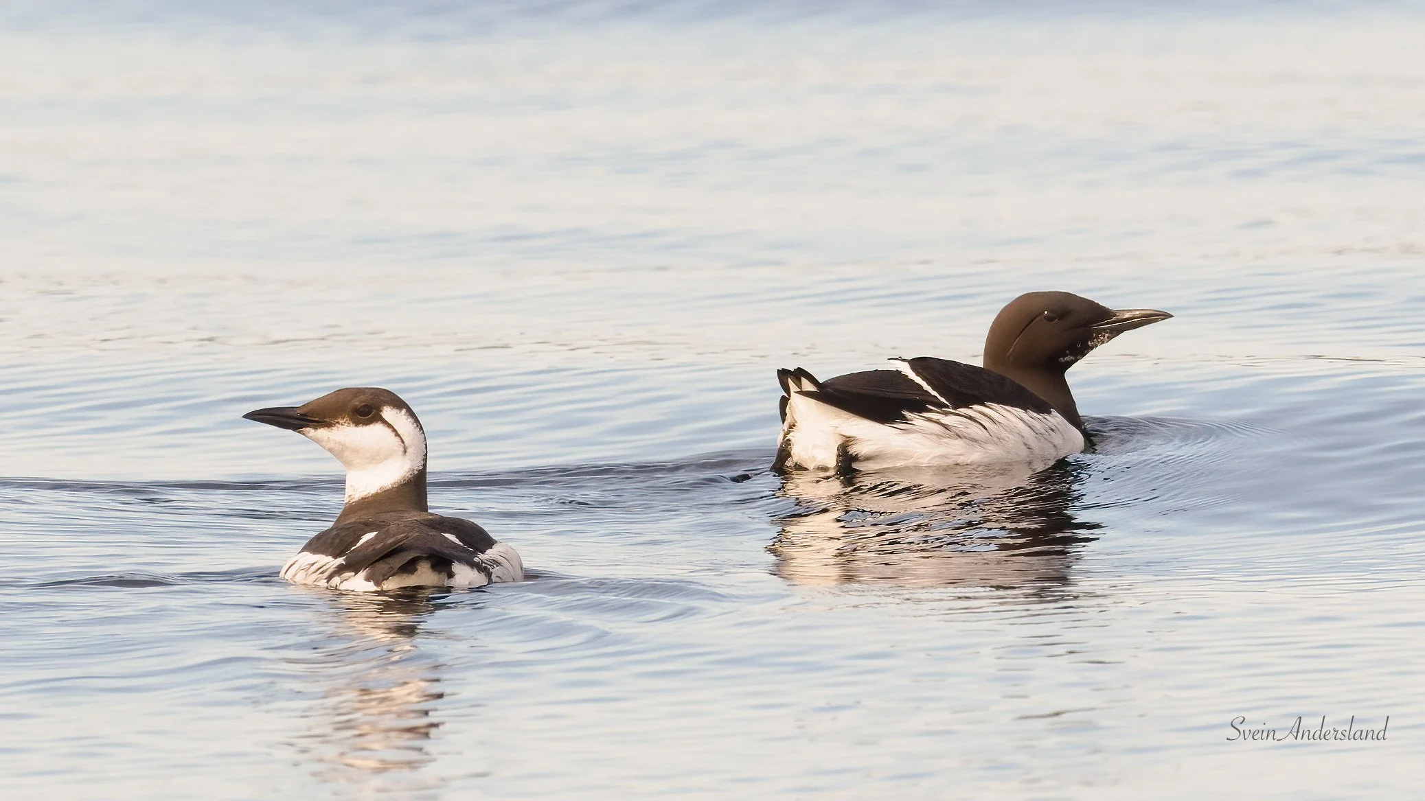 LOMVI. 1. april traff eg på dette lomviparet i Bjoafjorden. Dei tok livet med ro og brydde seg ikkje om AMT`en som seig sakte forbi.