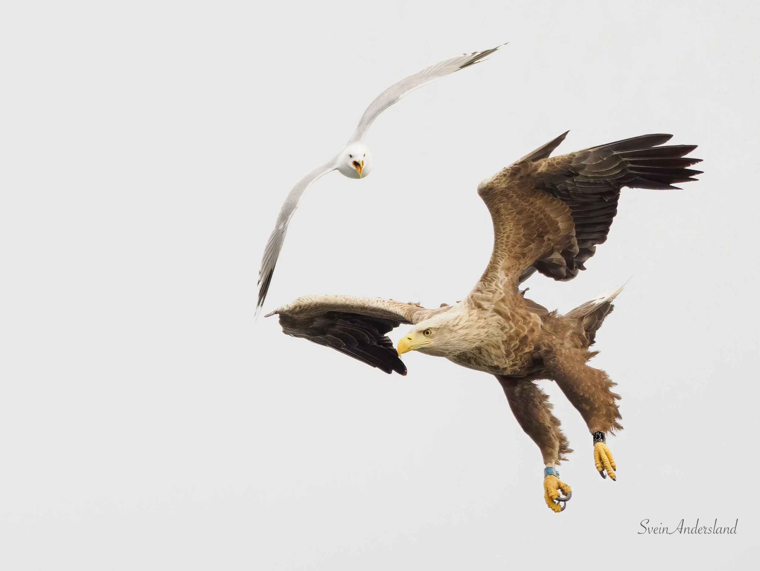 Måsen gjer det den kan for å forstyrre havørna i innflygingsrutinen sin.
