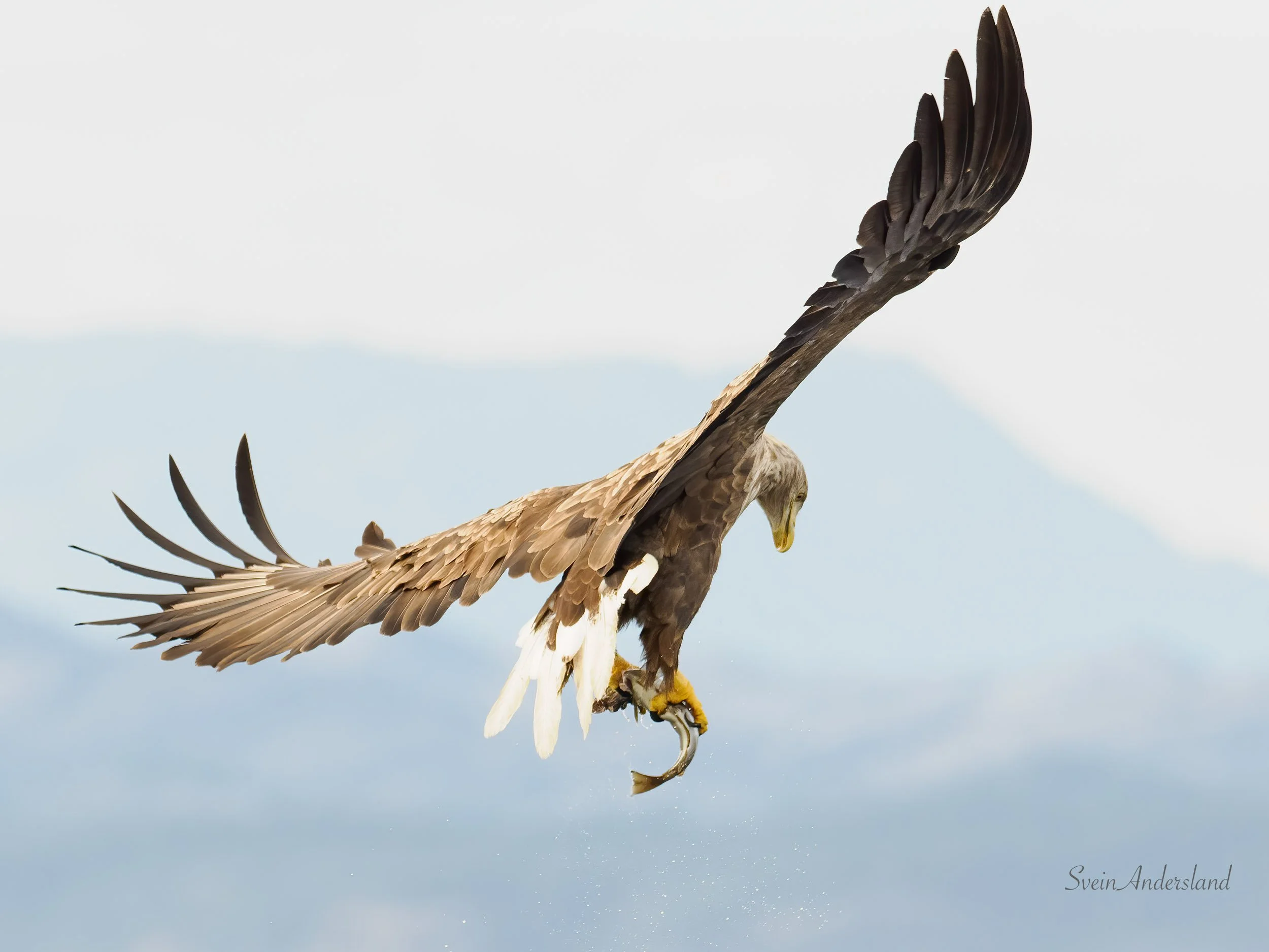 Ein ekstra trigger blir det ofte når måsen prøver å stikke av med ørnematen. Det skjedde to gonger denne kvelden. Første gongen rakk ikkje måsen å svelge fisken før Gyda var på vengene. Gyda fekk seg likevel ei overrasking da ho rett etter opptaket ser ned på klørne og konstaterer at ho berre har fått med seg hovudet til palen, som vart reve av idet ho letta. Sjølv såg eg ikkje det før i redigeringa på skjermen. Sjå fotoserie nedanfor. Neste måse som prøvde seg fekk knapt løfta fisken opp før den ser at Gyda igjen er på vengene.