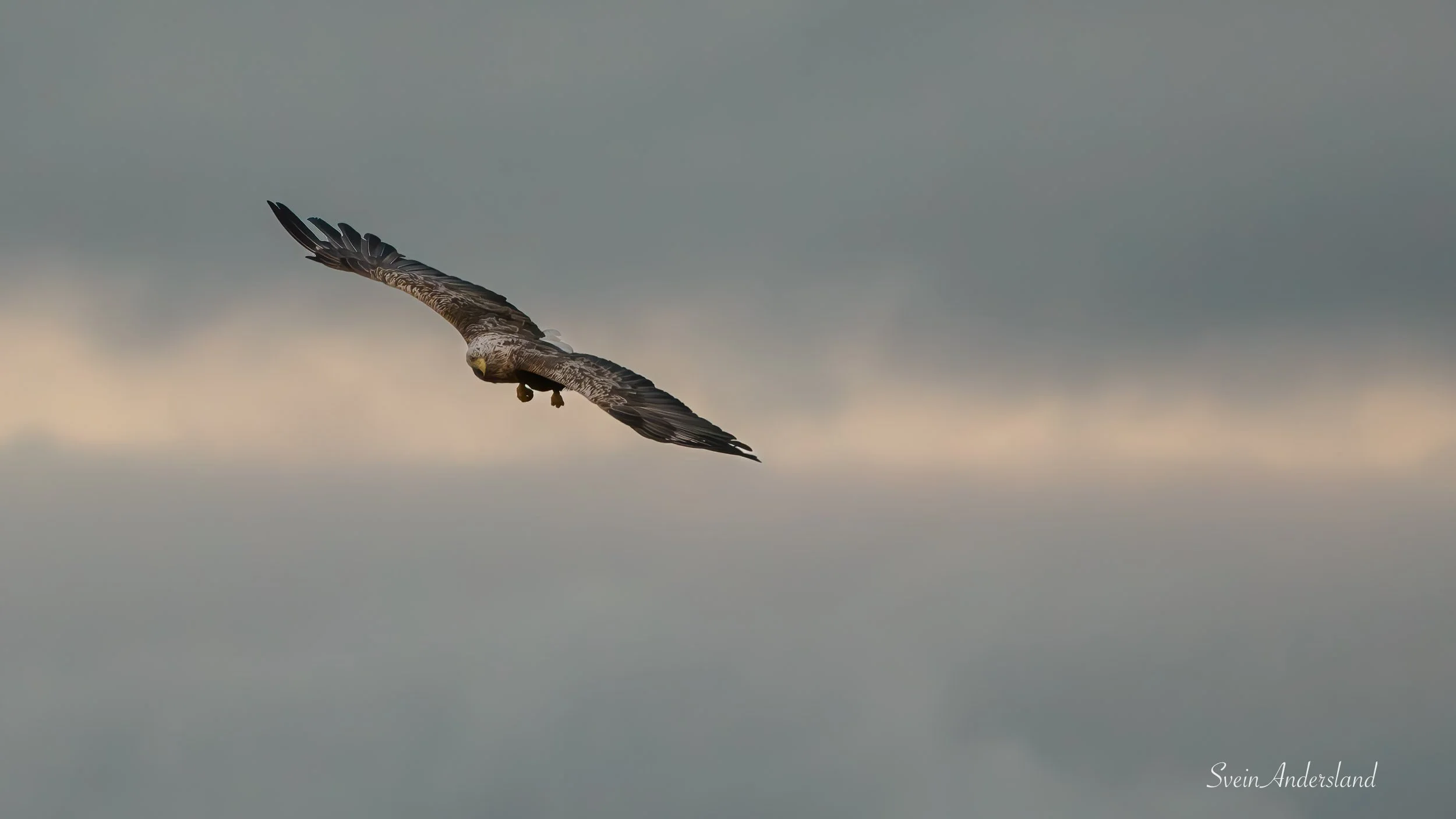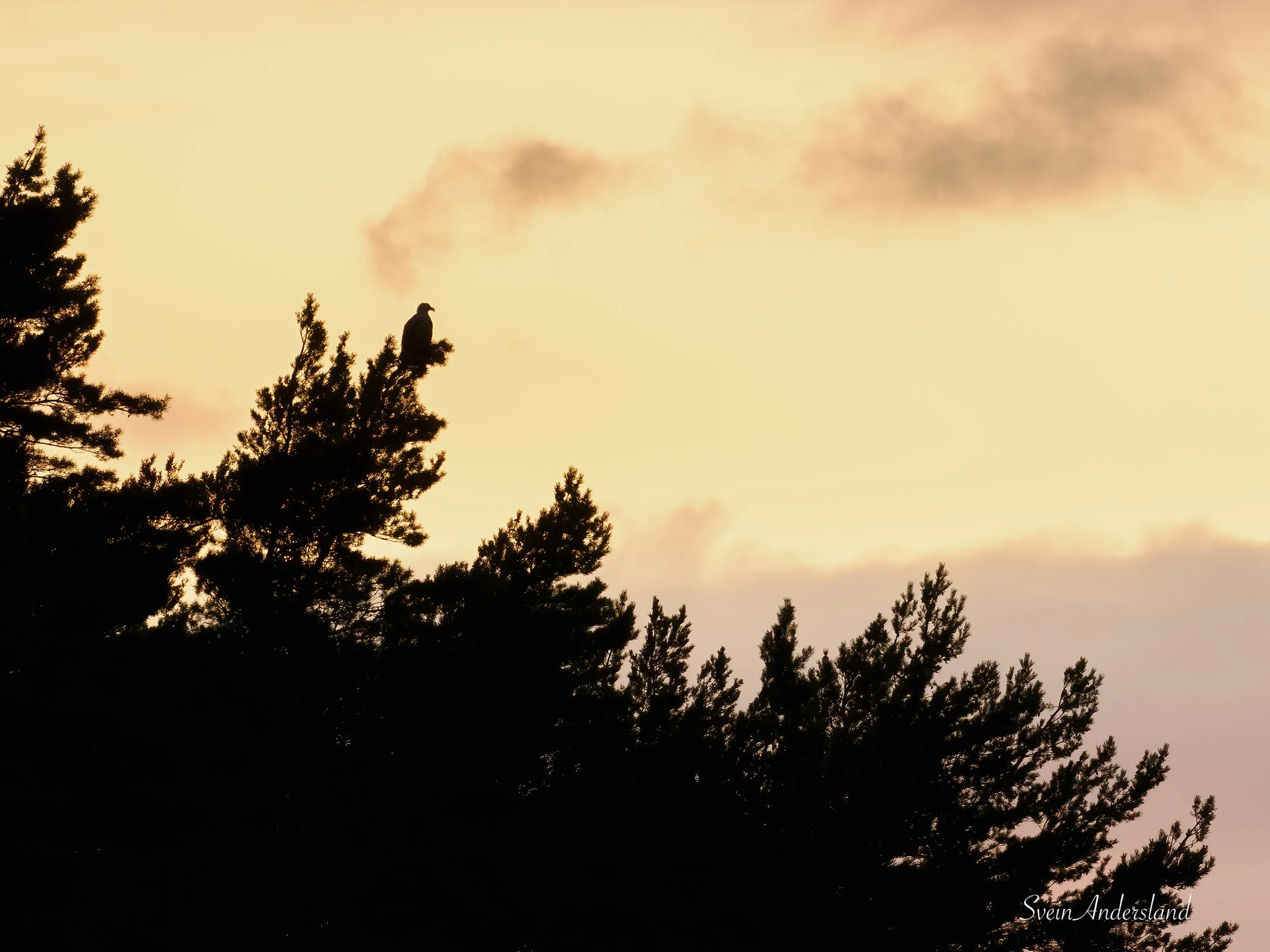 Før eg startar motoren att, snur eg meg og ser ei havørn i siluett mot solnedgangslyset i vest. Det vart det siste bildet for kvelden.