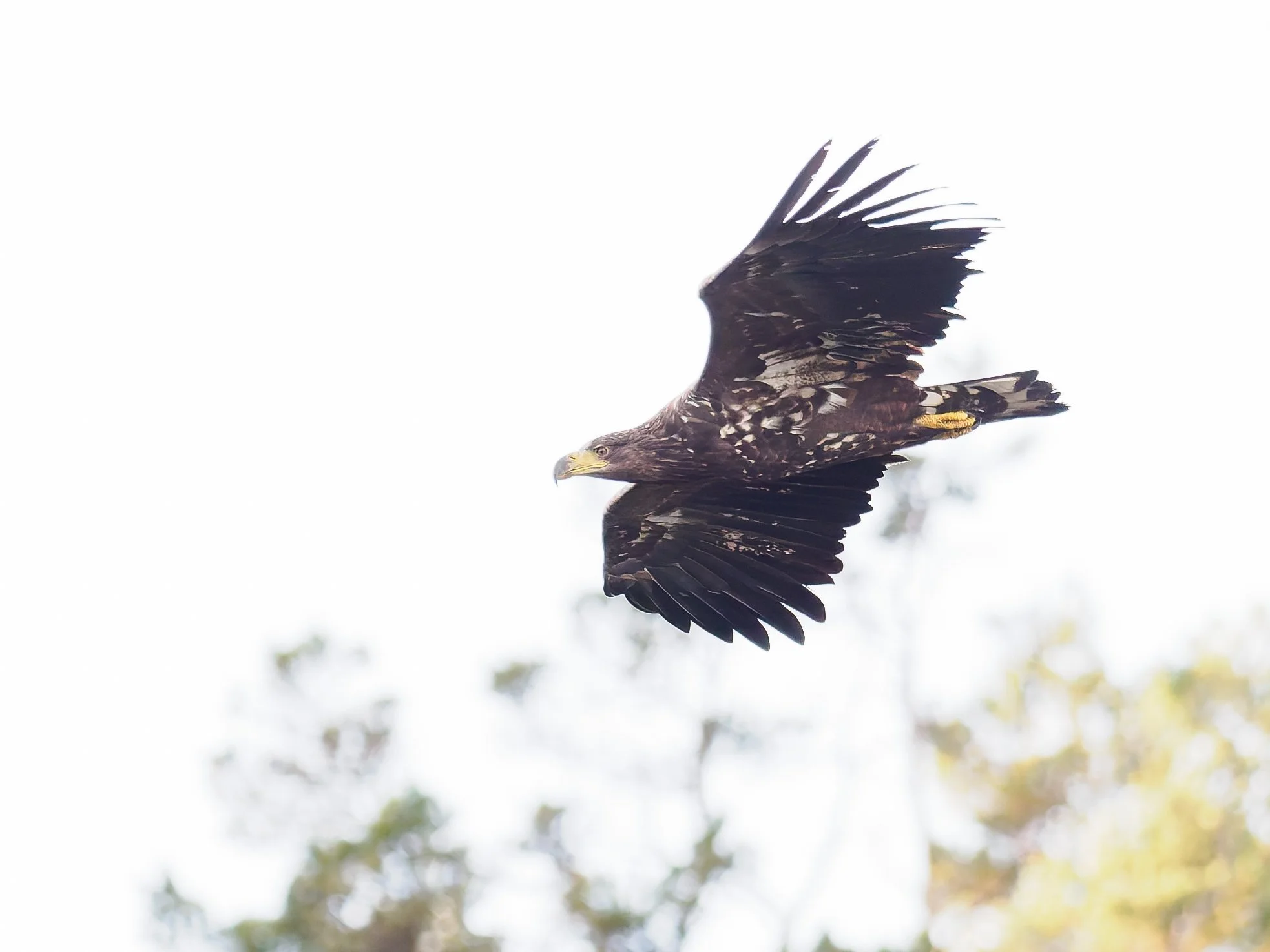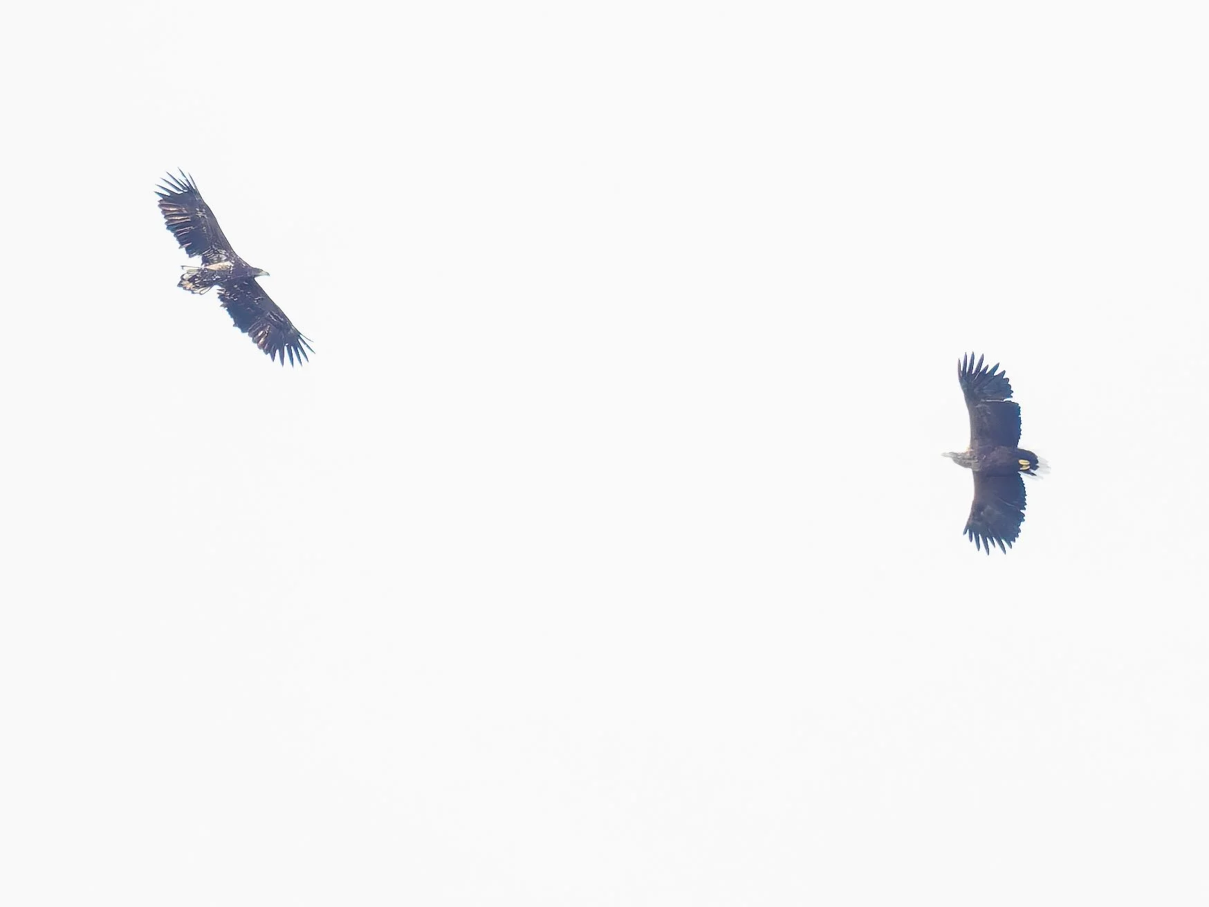 Ettermiddagsturen gjekk innom tre havørnpar, men med litt dempa forventningar om å treffe nokon heime. Nivået på forventningane slo dessverre til, med unntak av hos Gudrun og Ottar. Ved reirplassen var det inga havørner å sjå, så vi gjekk etter ei stund sakte sørover langs land. Da dukka brått ein ungfugl opp bak båten, flygande langs land i vår fartsretning, sjå første bilete nedanfor. Like etter steig den oppover og slo seg etter kvart i lag med ei vaksen havørn, sjå bilete nummer to nedanfor. Vi heiv uti ein fisk, men den vakte inga havørninteresse og begge fuglane trekte seg høgare og lengre vekk frå oss. Eg tok likevel nokre foto av dei, noko som gav eit uventa svar i gjennomgangen på mac`en heime. Der og da tenkte vi at dette var to ukjente havørner som streifa innom dette området. Foran skjermen drog eg overraskande nok kjensel på Gudrun som har eit “hakk” i venstre vinge. Samanlikning med bildearkivet frå juni gjer meg ganske sikker på at det var Gudrun som flaug i lag med den ukjente ungen. Gudrun og Ottar hekka ikkje i 2024 og 2025. Eit spørsmål var difor om dette var ungen vi observerte i 2023, som er det året eg oppdaga dette paret.