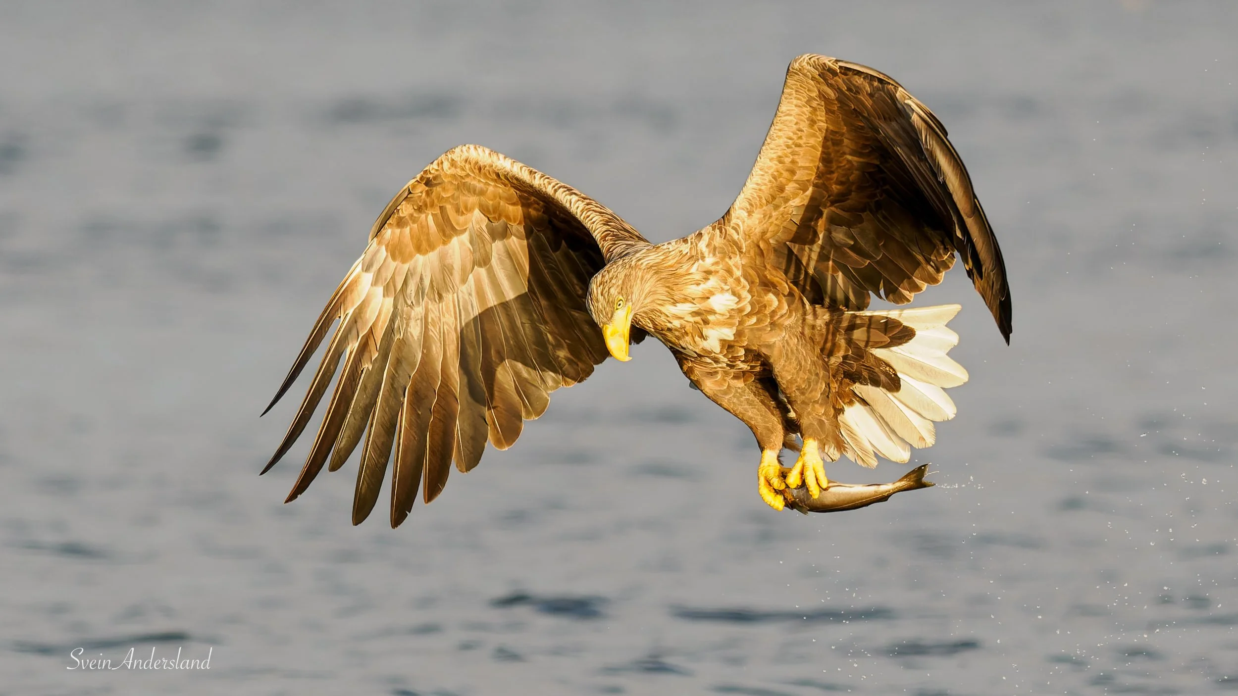 Fotoserien nedanfor viser Gunda når ho lettar for å hente fisken i sjøen. Kameraet går med 25 b/s og fangar mange fine positurar i starten av flukta hennar.