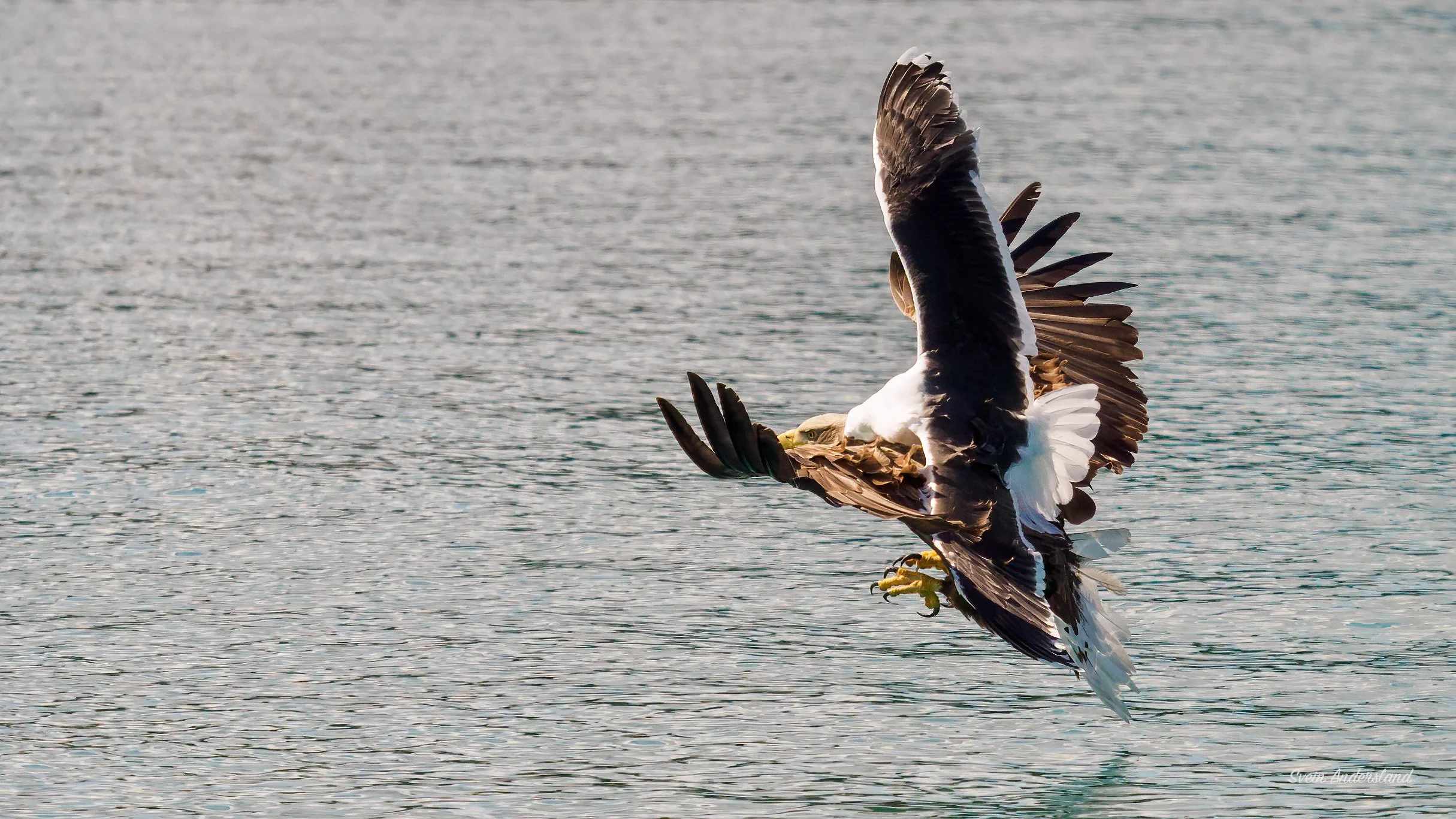 I søkaren sjekkar ein om fuglegjenkjenninga har markert ørna med ei kvit ramme. Havørna vil kome glidande med roleg tempo fram til den bestemmer seg for å gå ned og hente fisken. I denne fasen kan eg ta nokre bilete, men passe på å ikkje fylle bufferminnet i kameraet for mykje når det går unna med 25 b/s.