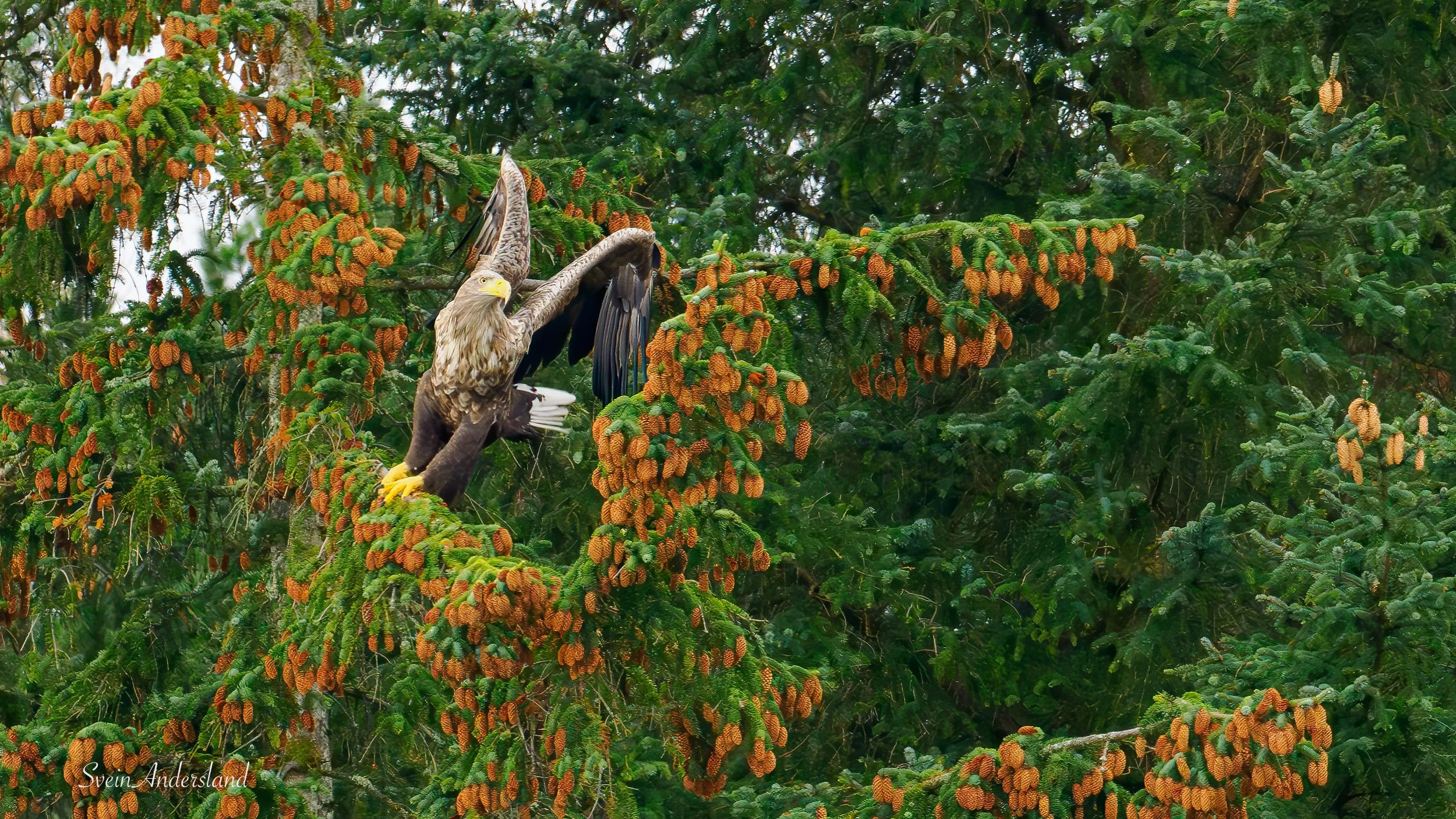 Ottar landar i øvste furutoppen, klar for neste fiskekast.