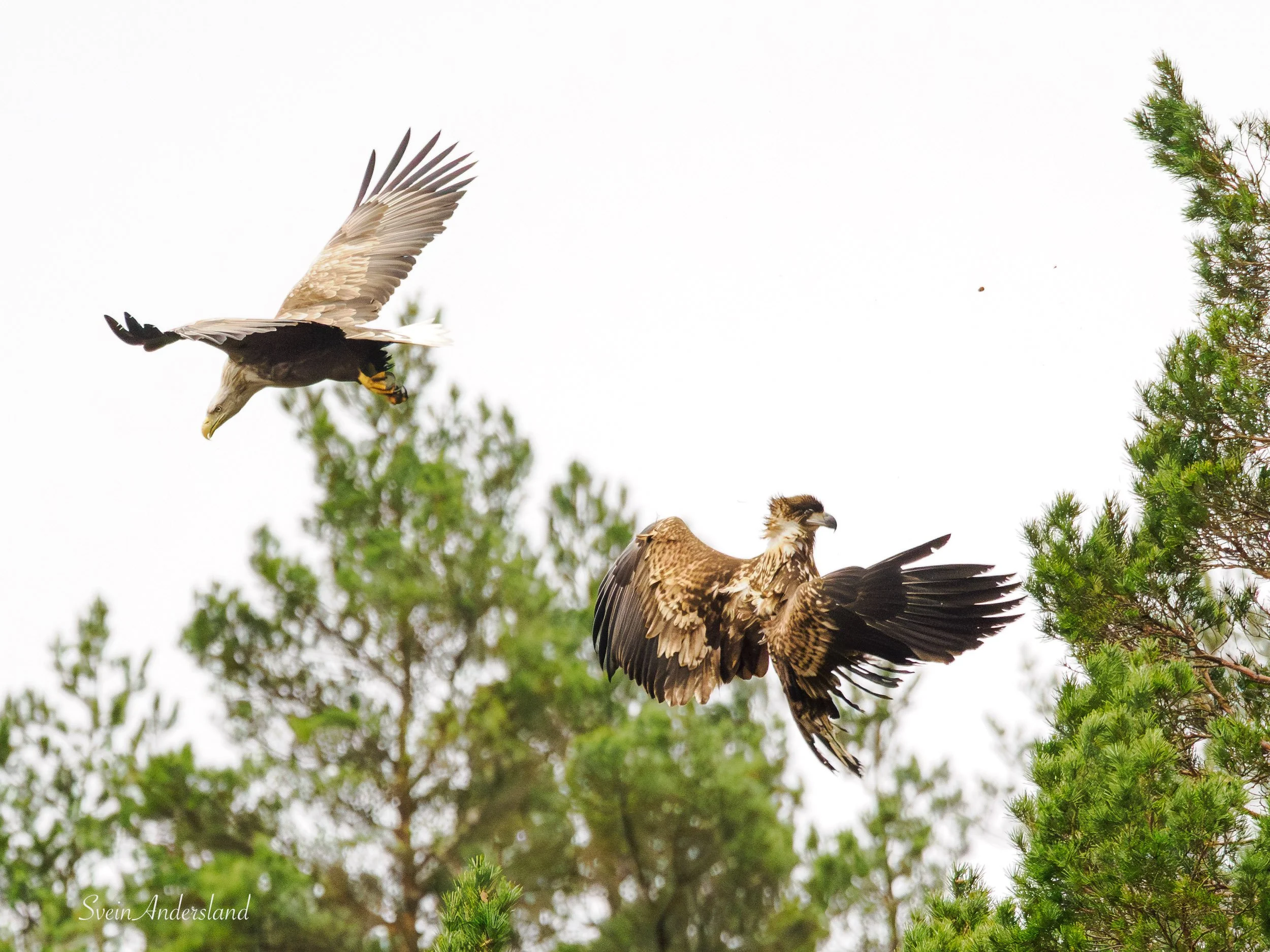 Det er liv i ørneleiren når ungane er i lufta. Her prøver Tor å kome seg unna den skrikande ungen. Motivet oppstår i brøkdelen av eit sekund, men autofokusen på OM-1 er heldigvis lynrask.