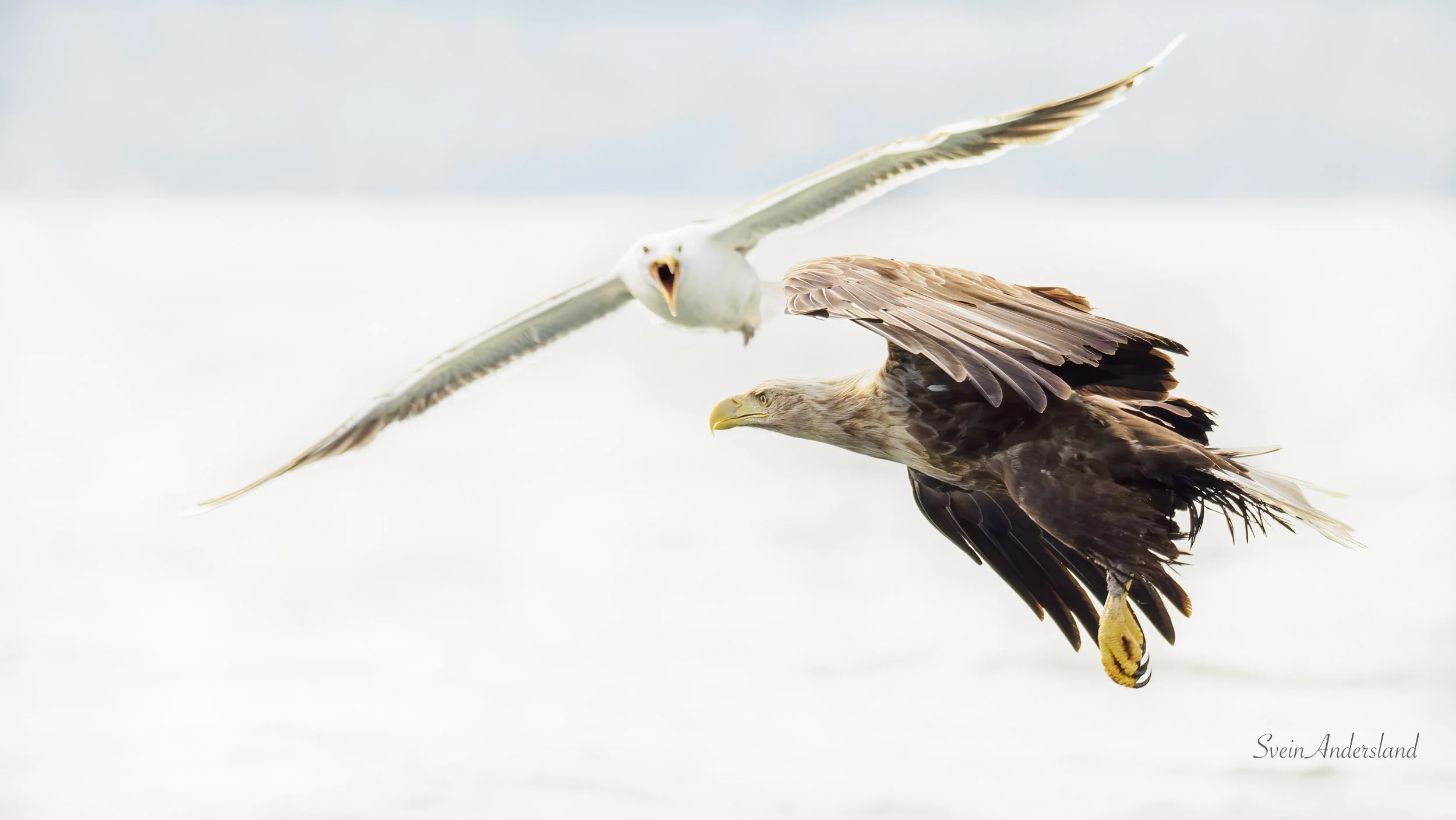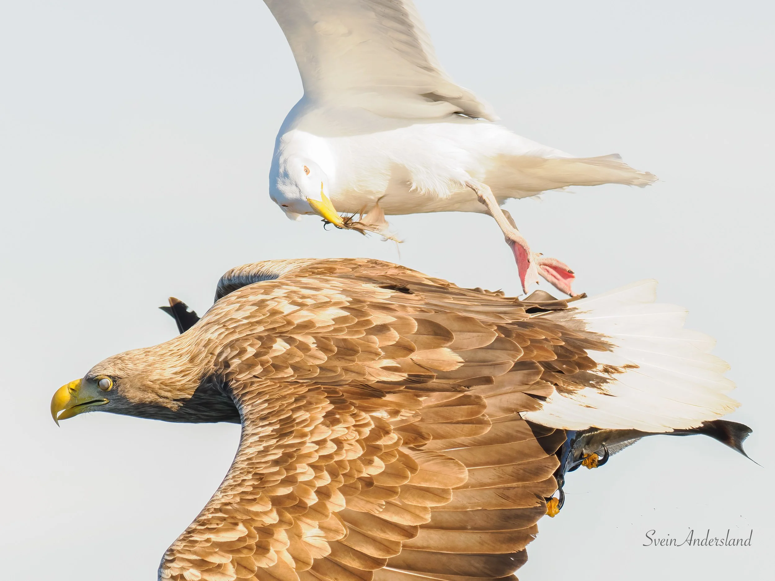 Havørna jager svartbaken som har stukke av med ein pale. Ferda gjekk langt utover fjorden, men denne gongen lukkast det ikkje å tvinge svartbaken til å gulpe opp att palen.