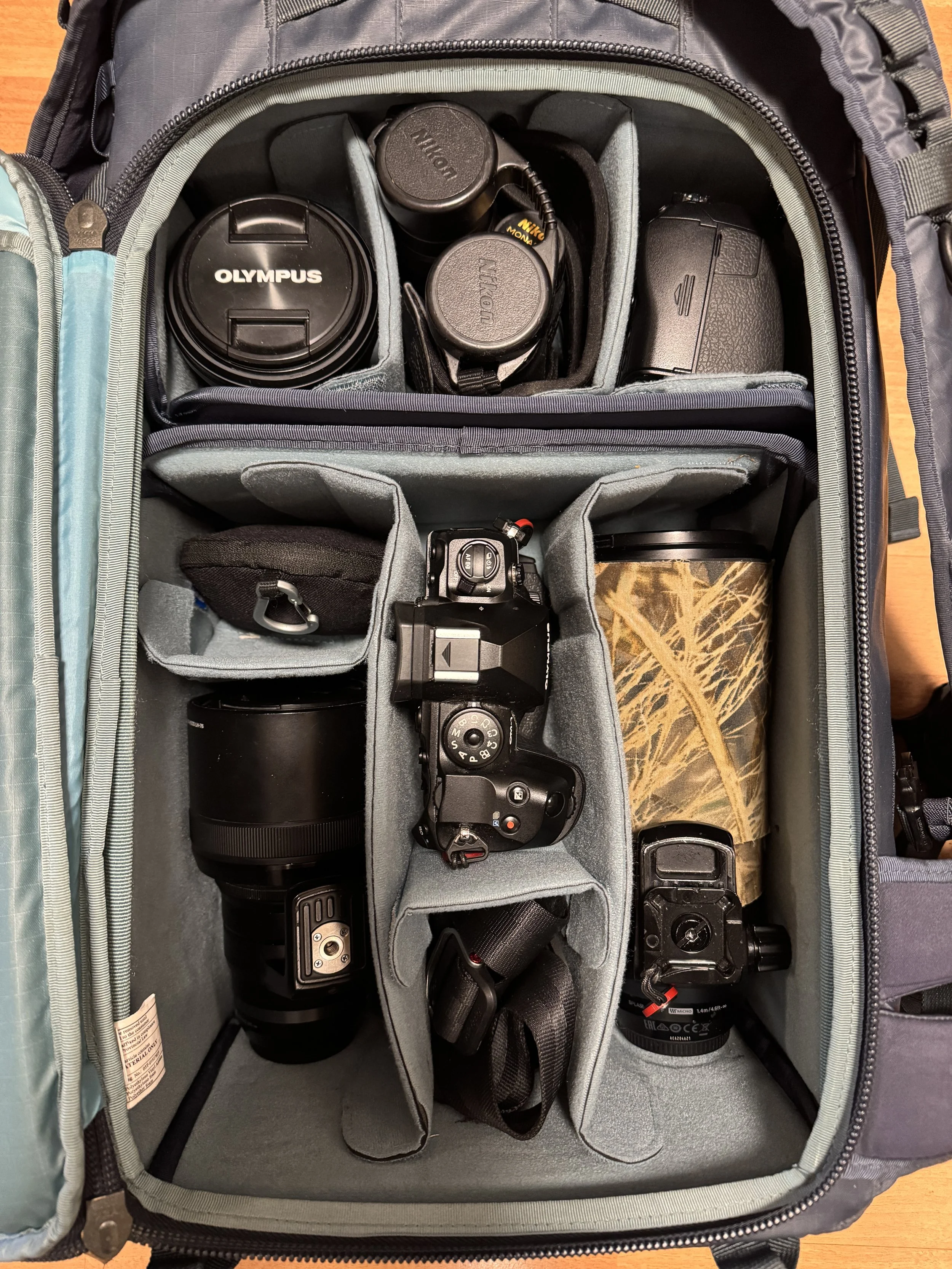 Min Shimoda fotosekk pakka for havørntur. Her er det gjort plass til det andre reservekameraet Olympus OM-D E-M1 II.