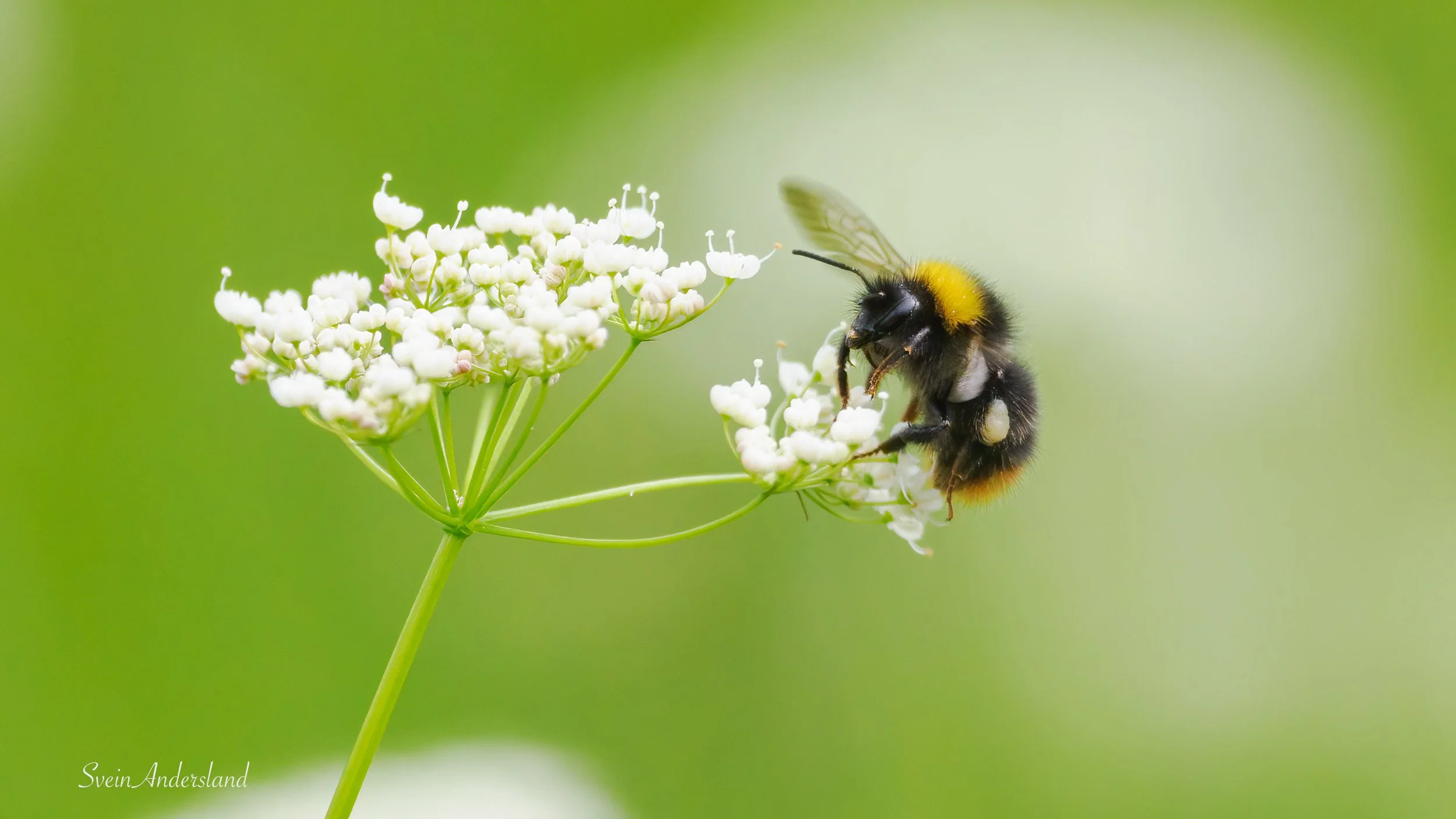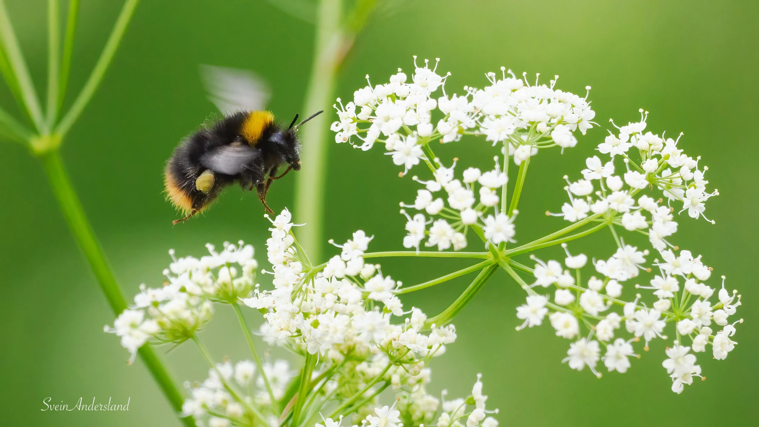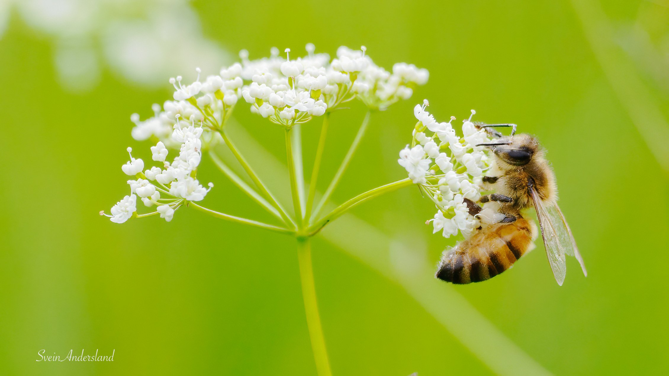 Stølen var dekt av hundekjeks, alle dei kvite plantene du ser på oversiktsbildet tatt med telefonen nedanfor. Der oppdaga eg etter kvart humler og honningbier som var travelt opptekne med å fange pollen. 300mm min har ei god nærgrense på 1,4 meter. Med lang brennvidde fungerer den da som eit makroobjektiv. Fordelen er blant anna at eg kan stå på avstand å fotografere, og lettare følgje med på kor desse travle insekta landar.