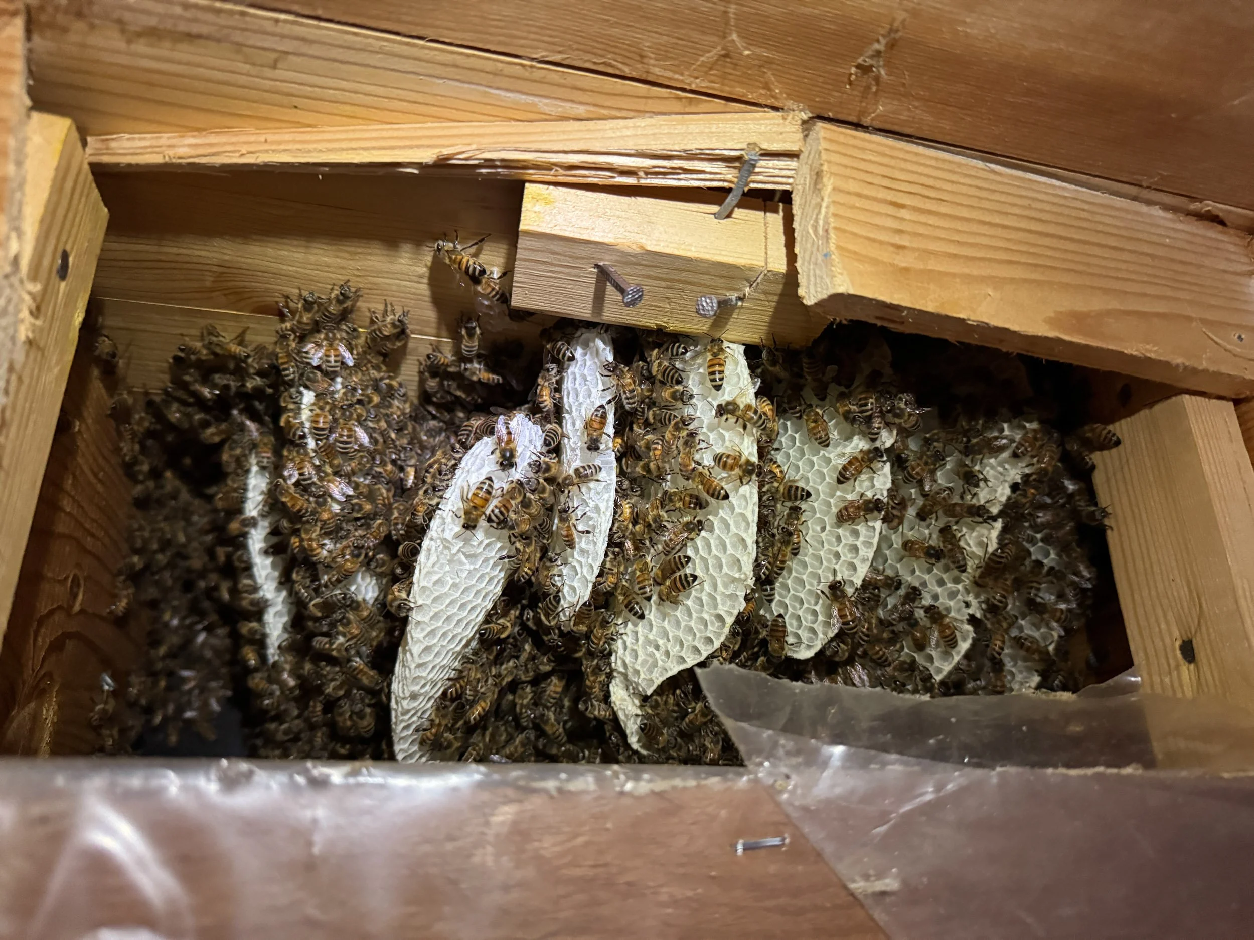 Biene var ganske rolege, og mest opptekne av å byggje rekkene med bivoks. På eit par av rekkene var det allereie lagt larvar. Birøktaren kunne fortelje at når dronninga startar med egglegginga, så legg ho mellom 1000-1500 egg per døgn, i ein månad. Når ein månad har gått, så startar dei første egga å klekke. I løpet av den neste månaden ville det da ha summa minimum 30 000 honningbier inn og ut av hytta. Da hadde hyttesommaren blitt avlyst. Heldigvis gjekk det ikkje sånn, men uthentinga av biene var i siste liten.