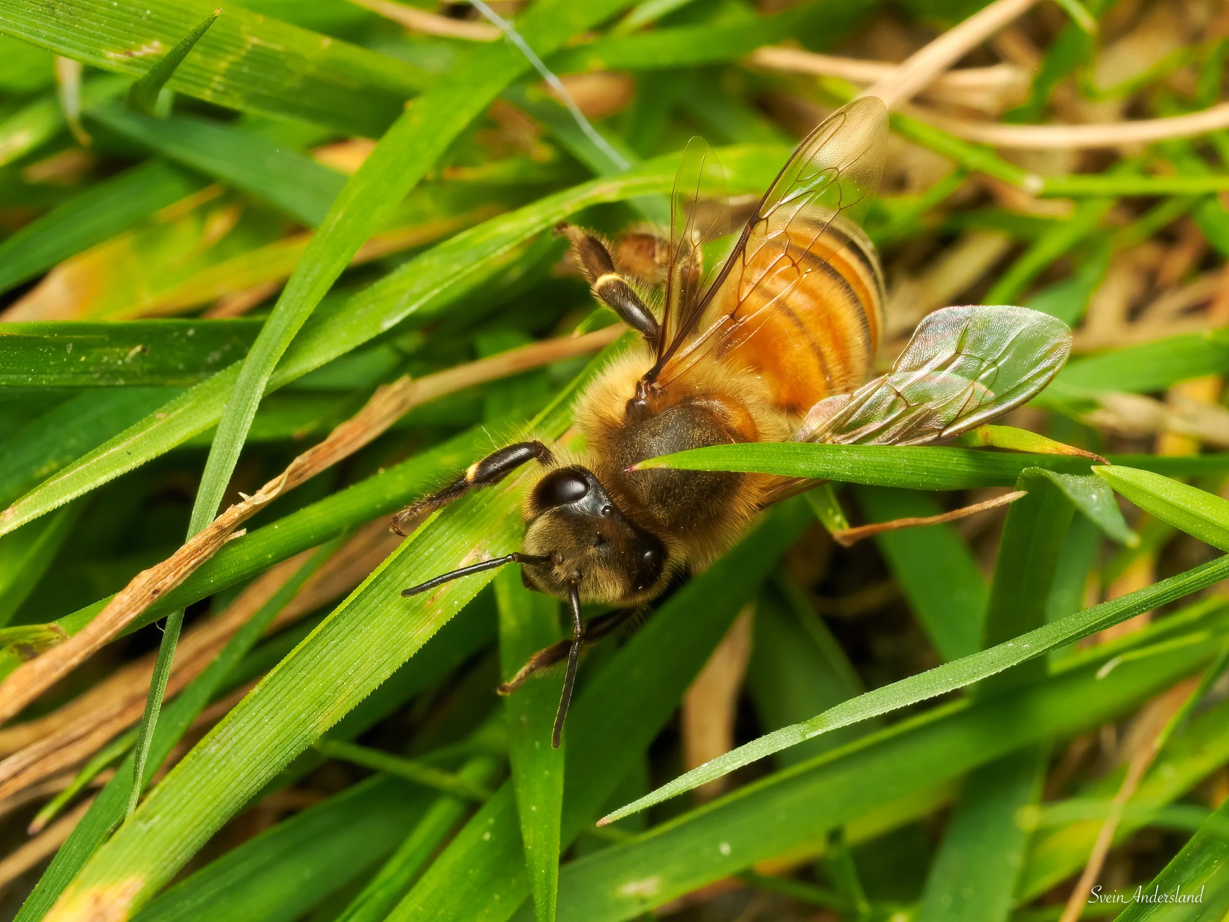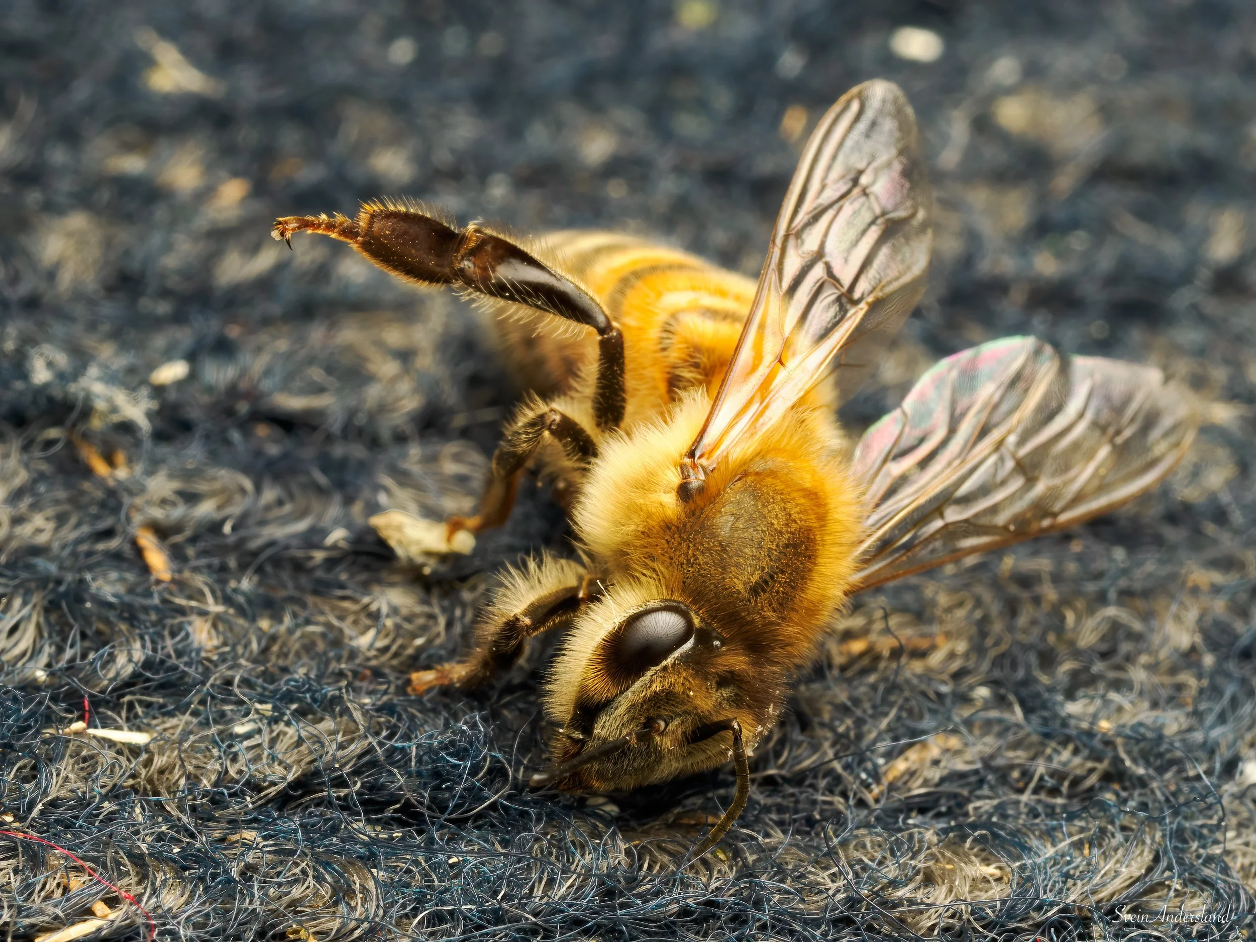 Eit par dagar seinare låg biene strødd på golv og i vinduskarm. I løpet av to-tre dagar til kom det ei og anna bie ut frå arnestaden i veggen. Dei ramla ned på golvet før dei daua. Nokre klarte å krype ut inngangsdøra og nokre meter til på steinhellene før dei kreperte. Det ga eit høve til å teste ut den nye blitsen og diffuseren. Nedanfor er tre utvalde foto og eit bonusfoto til slutt.