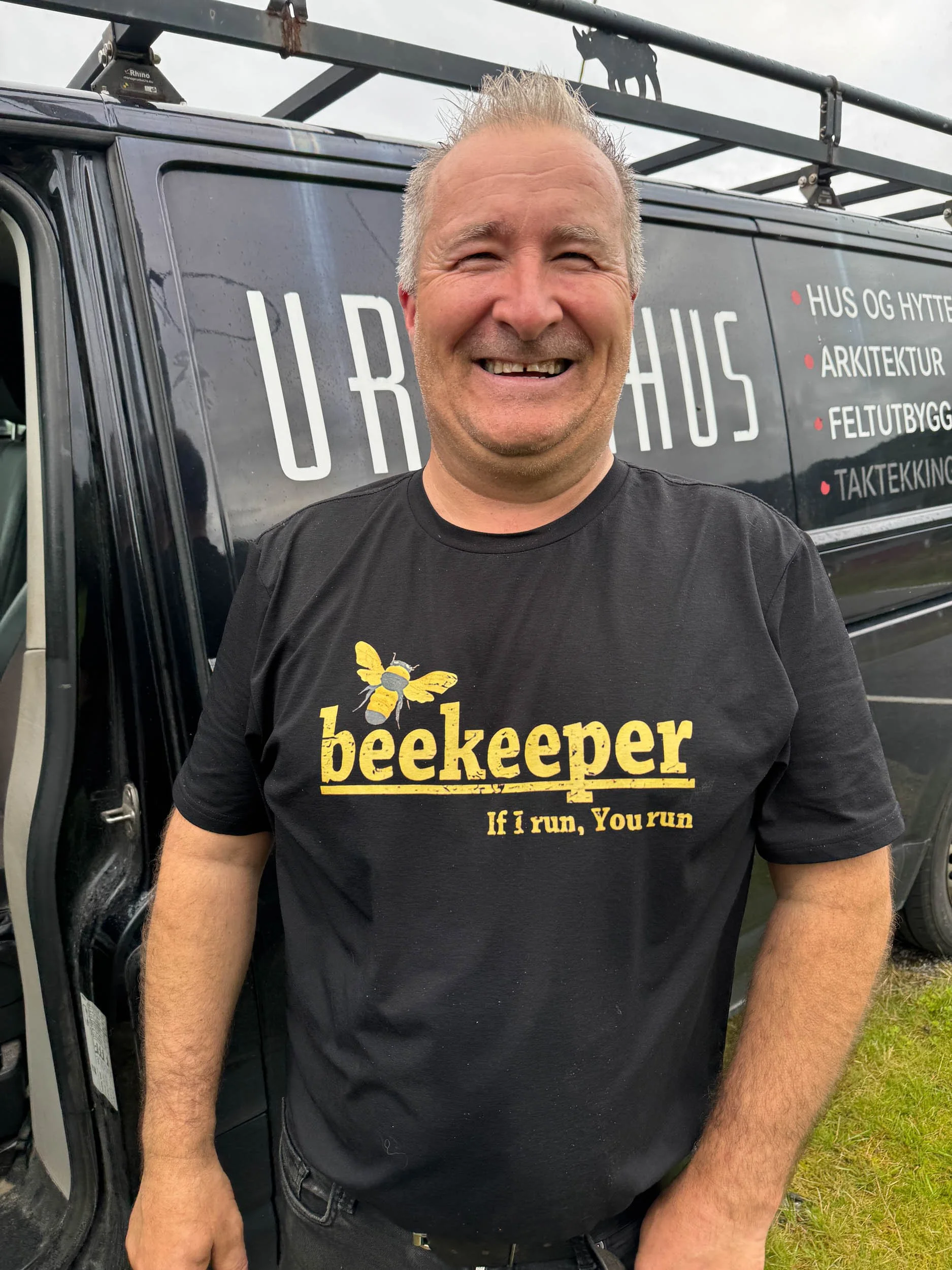 På slutten av juni vart det oppdaga ein større bieinvasjon på hytta, like før sommarferien skulle starte. Birøktarekspertise vart kontakta, og ei god veke seinare var prosessen i gang med å lokalisere kor langt inn i hytta biene hadde sverma. Plankar hadde først blitt tatt ned utandørs, utan å kunne finne arnestaden. Det var difor spennande da vi skar laus eit par prøvepunkt langs ei bjelke i gangen innafor inngangsdøra. På forsøk nummer to vart det blink, og birøktaren kunne starte jobben med å støvsuge ut biene. Støvsugaren er skånsom og tar ikkje livet av biene. Frå oppsamlingskummen vart biene flytta over i ein bikube utandørs.