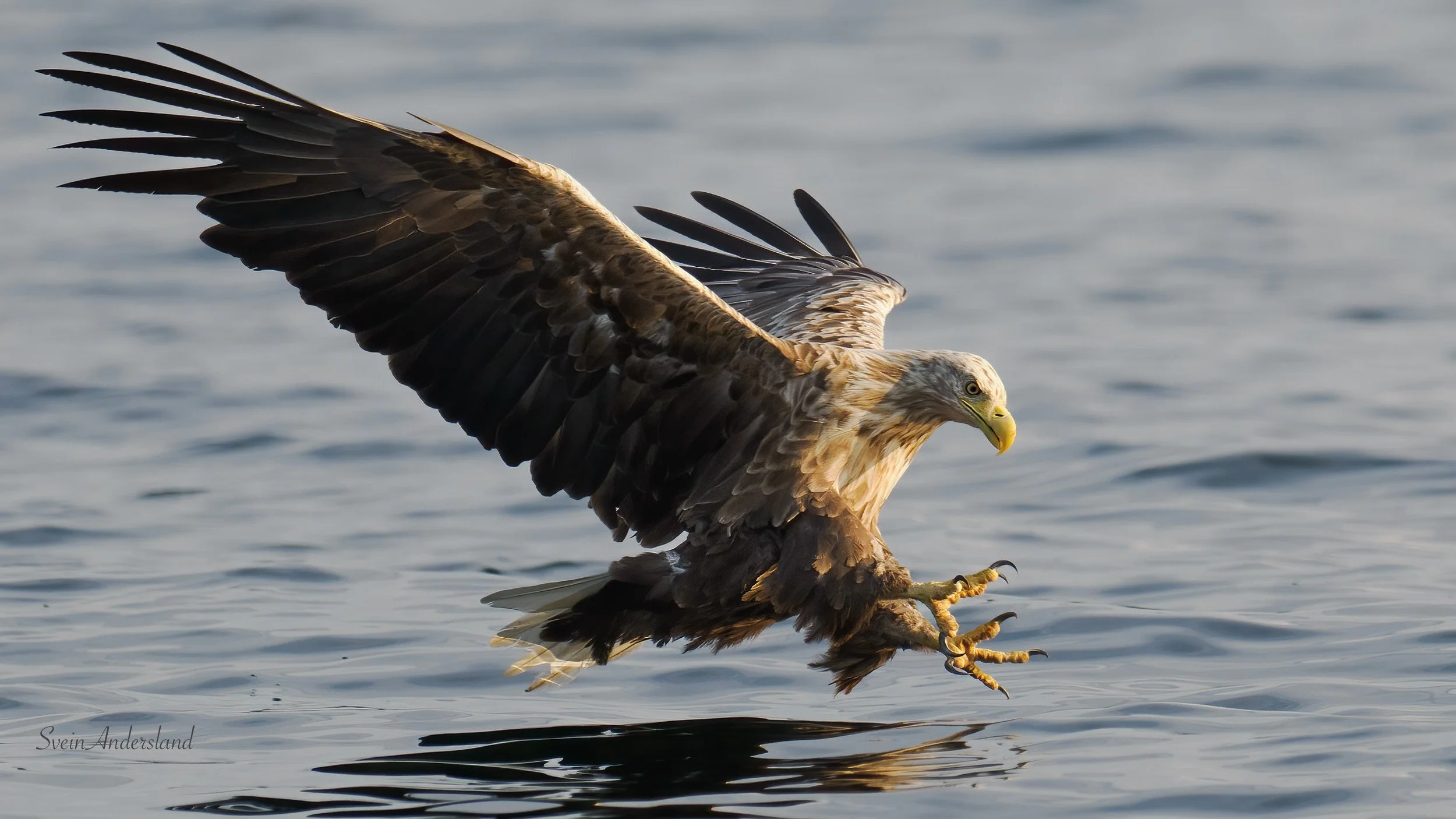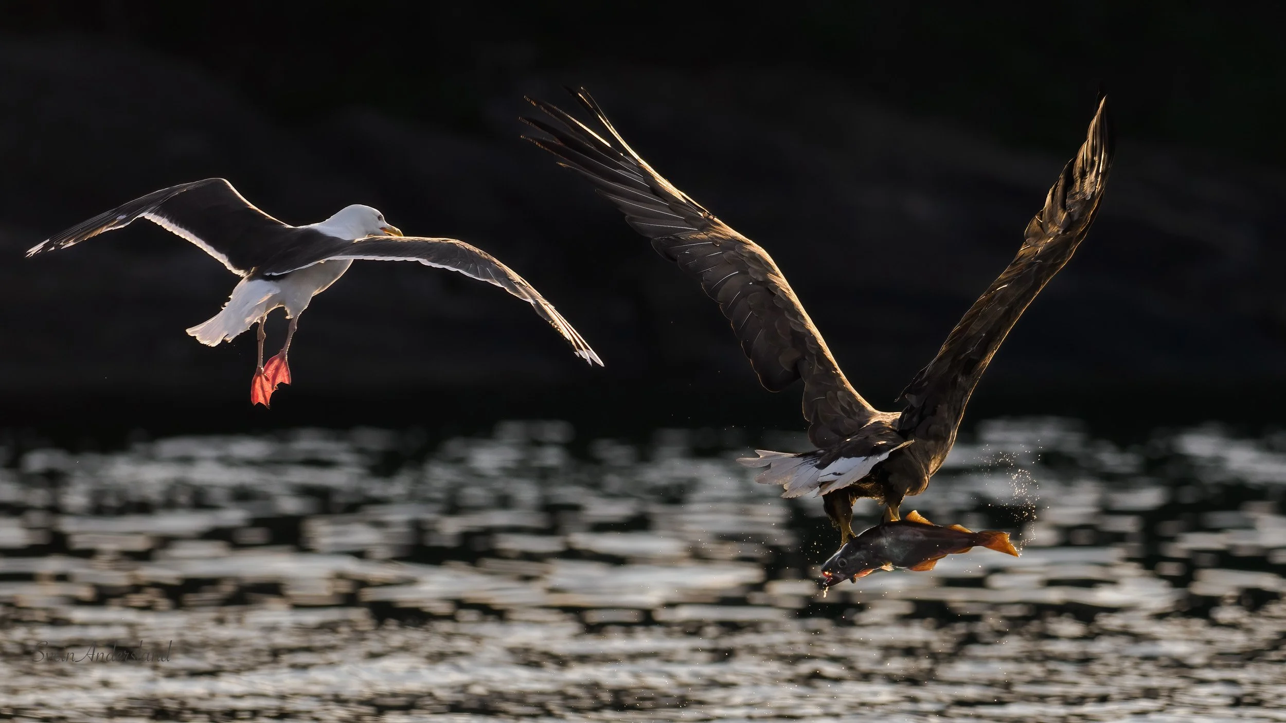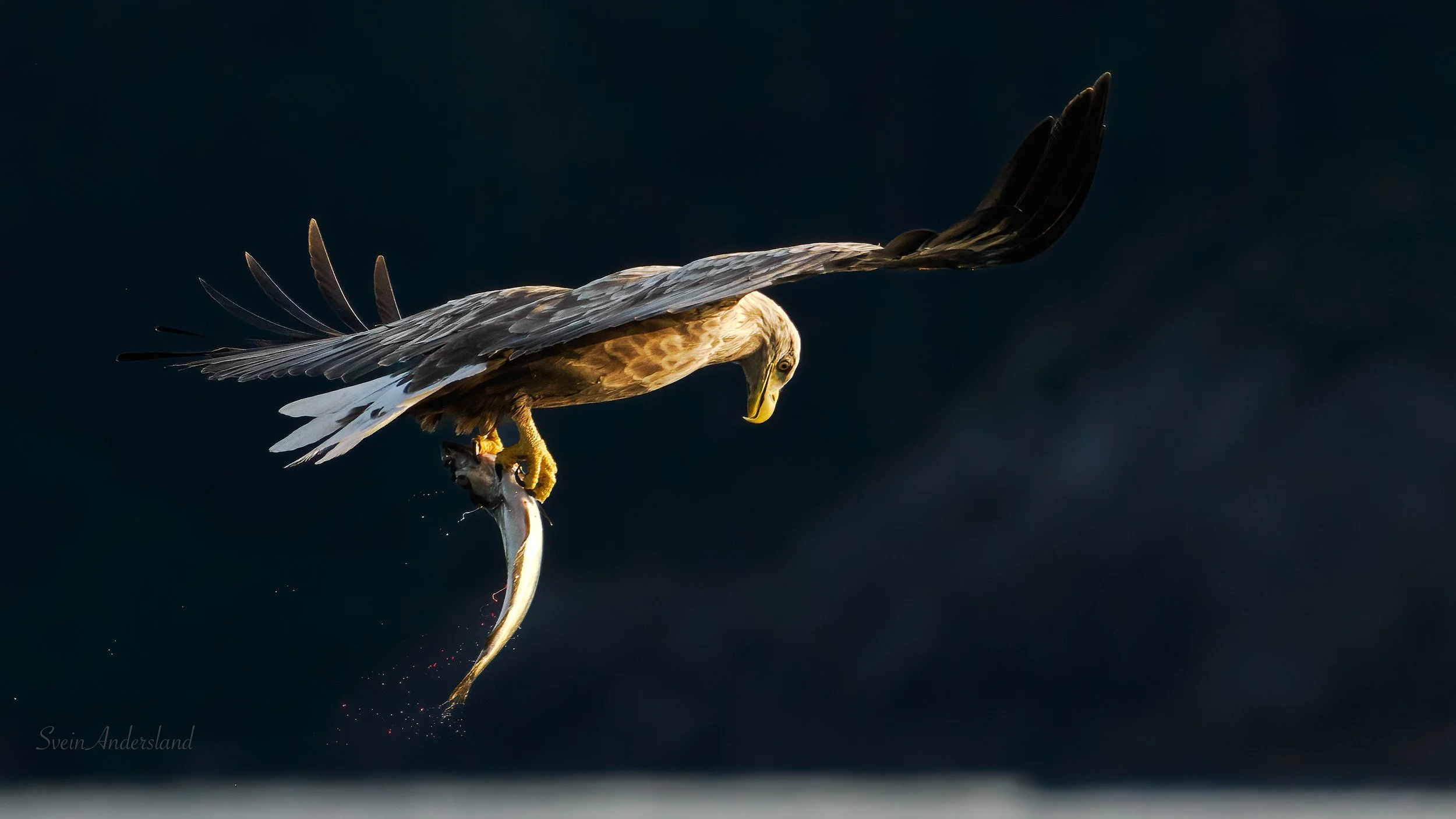 Vel framme ved ørnereiret, kunne eg raskt observere Gyda sitjande i eit tre ikkje langt frå reiret. Så gjekk det ikkje mange sekund før ho var i lufta på veg mot meg. Eg var ikkje heilt klar med kameraet, og ho sette difor kursen mot næraste land. På første kastet kom begge to flygande ut. Eg følgde først Tor, men så skifta eg til Gyda da eg brått oppdaga at ho kom i full fart og var den som stupte ned og henta første fisken. Den gjekk rett opp i reiret. På dei neste to kasta var det igjen Gyda som kom. Den eine var nok litt over to kilo, og vart slept inn til land før Gyda etter ein liten pause fortsatte til reiret.