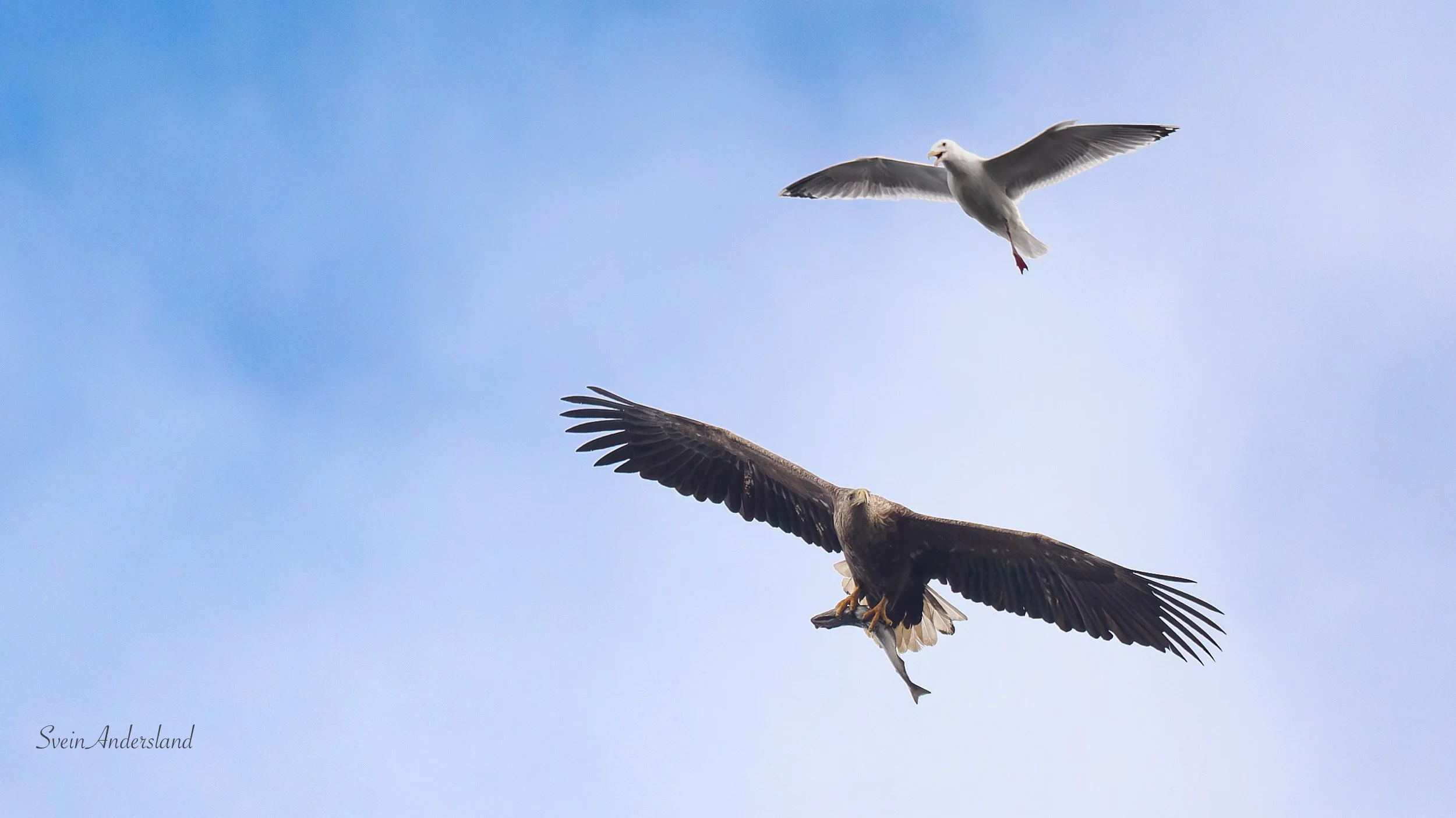 På den litt lengre flygeturen med fersk pale var det fleire måsar som prøvde å forstyrre hoørna. Havørna er mindre manøvreringsdyktig og flyg litt saktare med fisk i klørne. Det gjer det nok lettare for måsane og andre fuglar å plage ho.