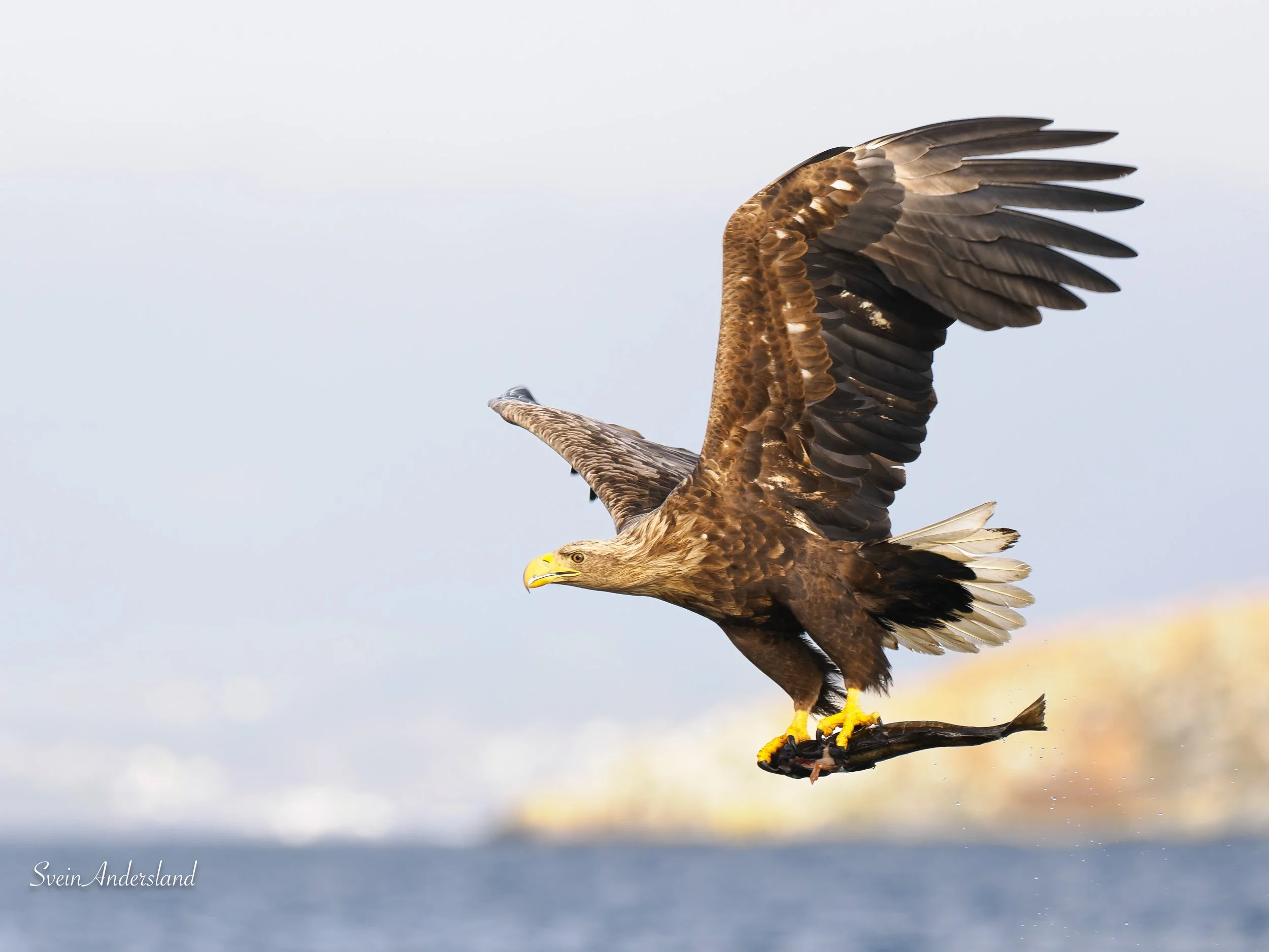 Observasjonen og fotograferinga av musvåken kom imellom to fiskekast. Hoa trekte seg først gongen, som vist over. Eg såg ikkje igjen fisken og tenkte den kanskje hadde søkt. Likevel litt usannsynleg, sidan dette var ein av fire ferske paler eg fekk etter dei to første kasta ved fiskeplassen. Etter musvåken, såg eg foran båten at ei av havørnene nærma seg. Eg heiv da uti ein ny fersk pale. Brått stoppa havørna opp, og gjekk raskt ned og henta opp den første fisken eg heiv uti. Palen hadde da ikkje gått til botnen, men følgd straumen i motsett retning av vinden. Den første fisken hadde altså ikkje søkke. Dette er noko ein tid om annan opplever. Det vart da å hente fram håven og hente opp att den andre fisken, med fleire skuffa måsar som resultat.