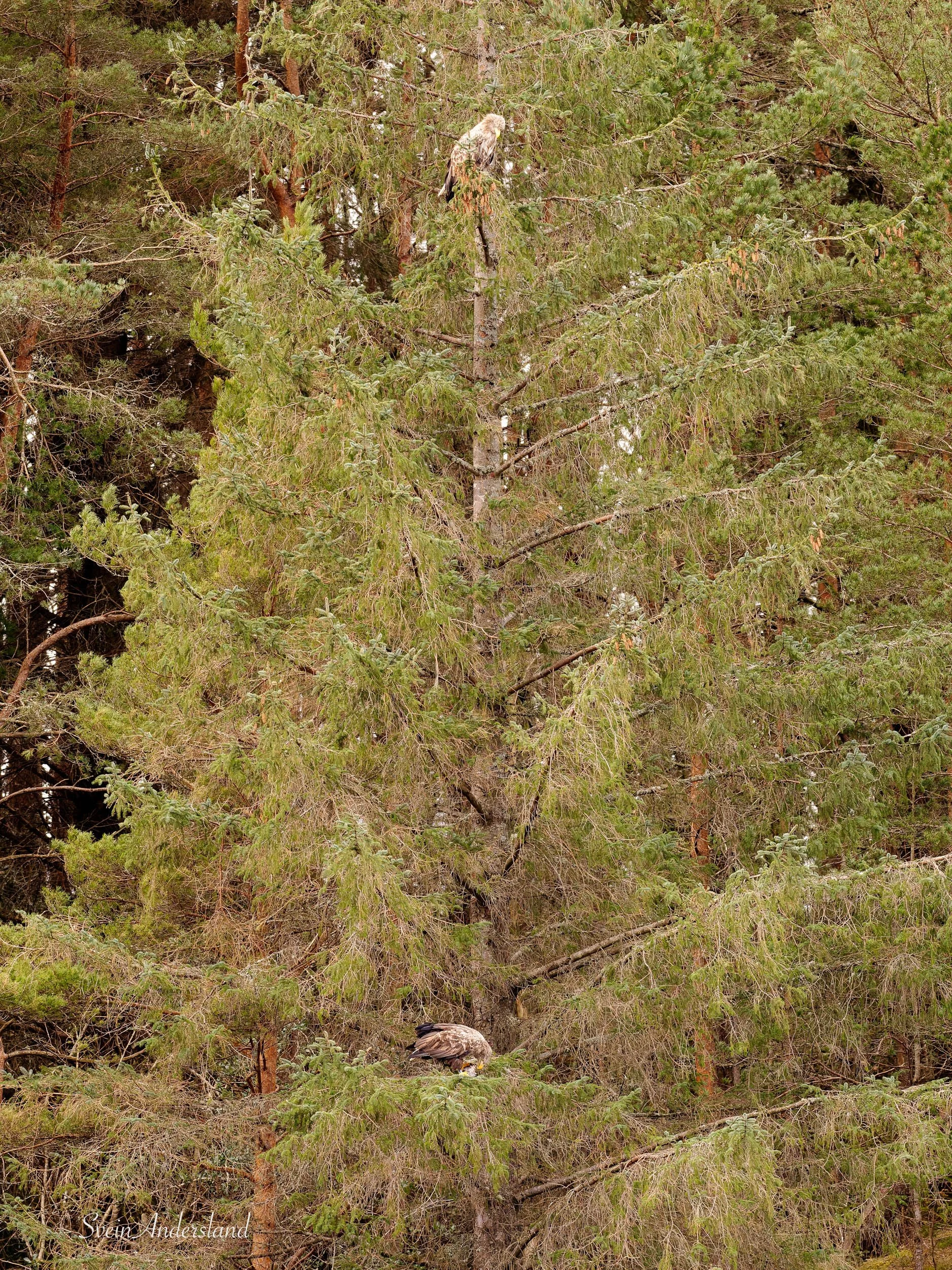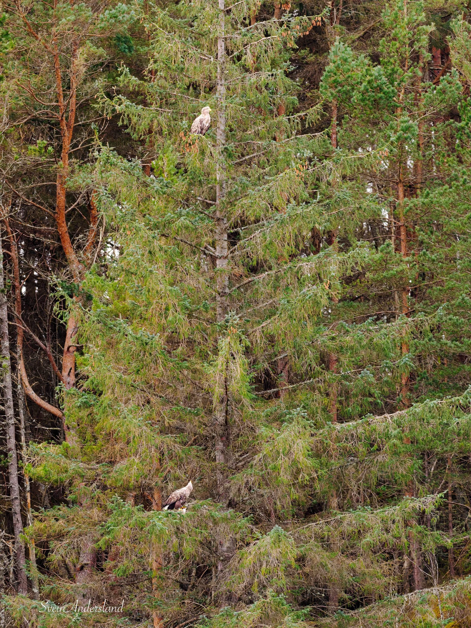 1) Gunda sette seg først øvst i denne grana. Etter ei stund kom Otto med sin andre fiskefangst og sette seg i nedre del av grana. Her kikkar Gunda ned på maken sin.