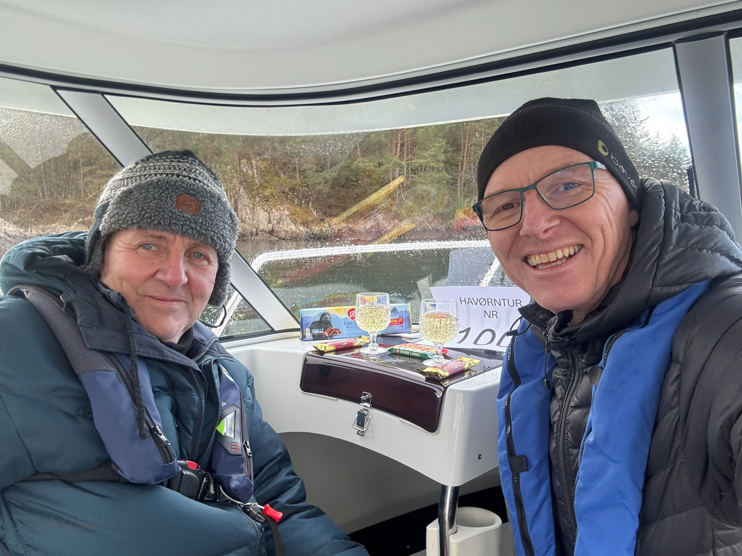 Søndag 1. mars kom endeleg våren med god vèropning for årets andre havørntur. Før turen tok eg tilfeldigvis ei oppteljing i Lightroom av alle turane sidan 2022. Eg kom til 99, og kunne da litt overraska førebu ei jubileumsmarkering på tur nr 100. Den vart markert i båten med mozell i stetteglas, Gullbrød, Kvikklunsj og den obligatoriske firkløveren som aldri går tom i båten. Tore er sikkert ikkje langt unna sitt jubileum heller, så da får vi ta ei ny markering.