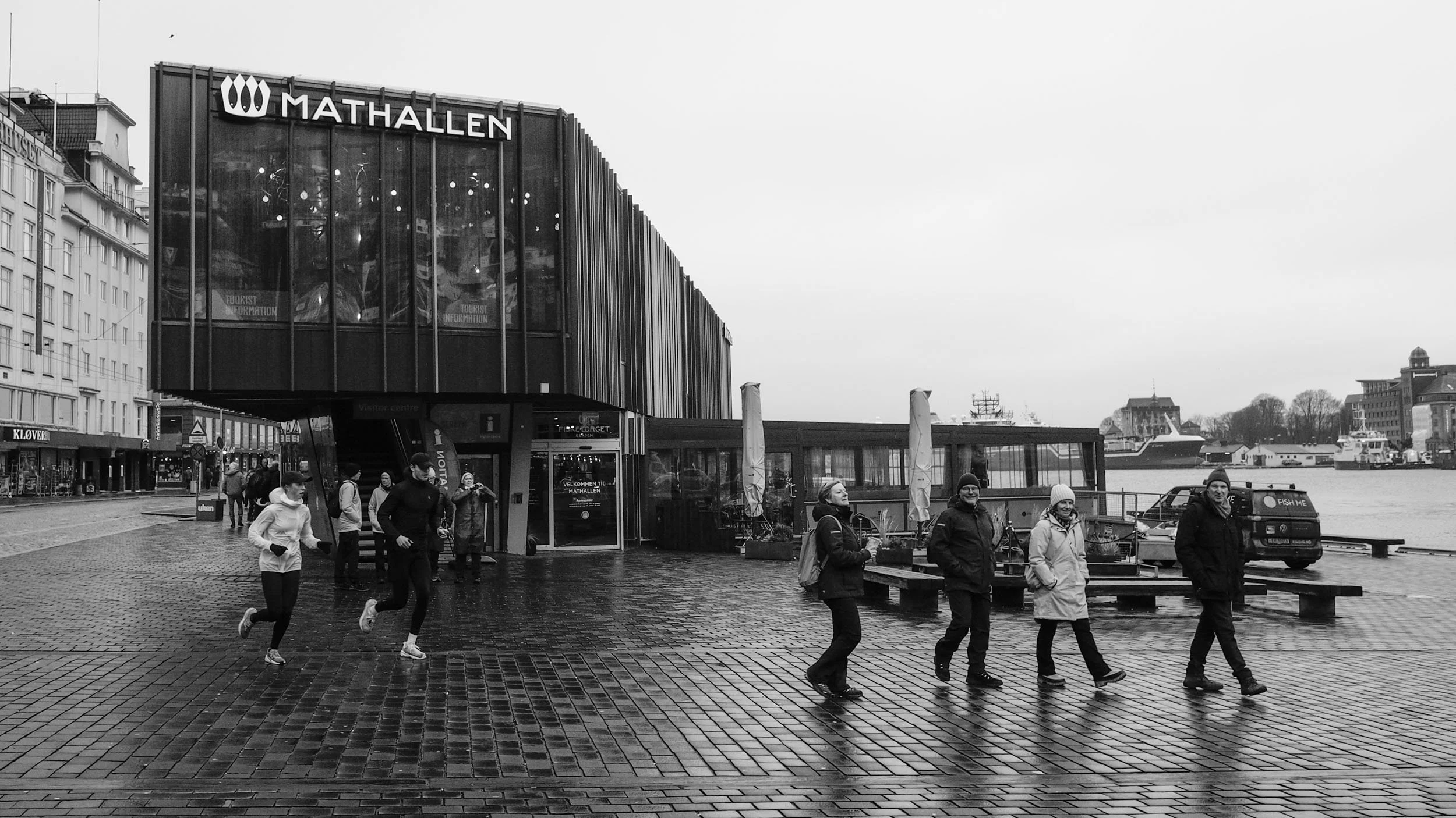 Joggande og smilande personar foran Mathallen. Olympus PEN-F, M.Zuiko 12mm f/2,0