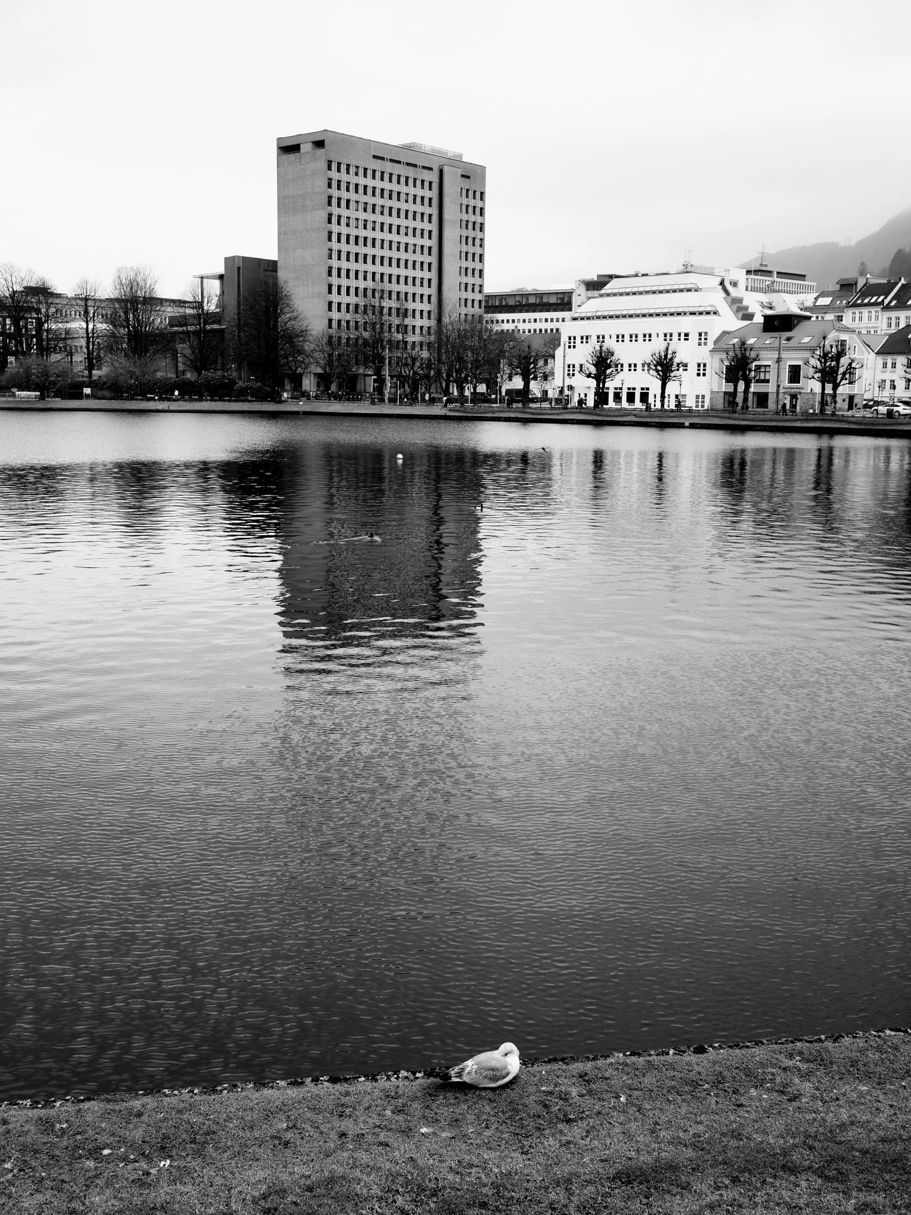 Fugl og betong på kvar si side av Lille Lungegårdsvann. Olympus PEN-F, M.Zuiko 17mm f/1,8