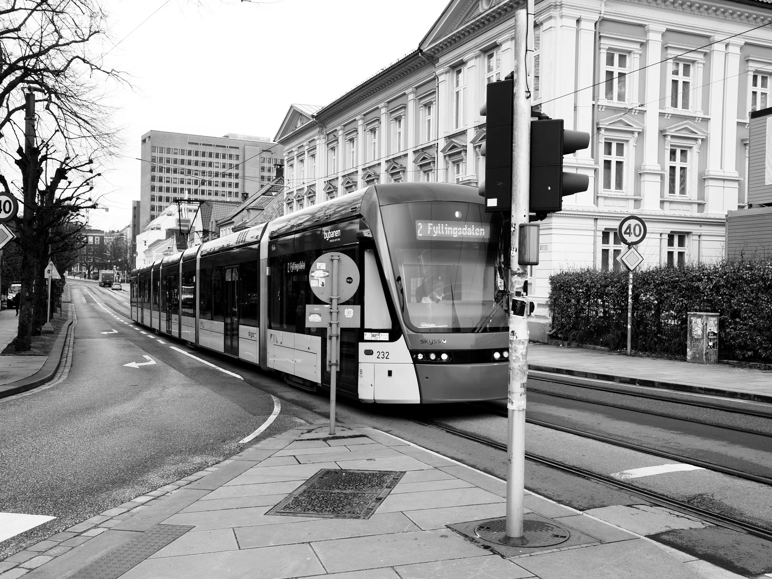 Kaigaten og Bybanen på skinner. Olympus PEN-F, M.Zuiko 17mm f/1,8