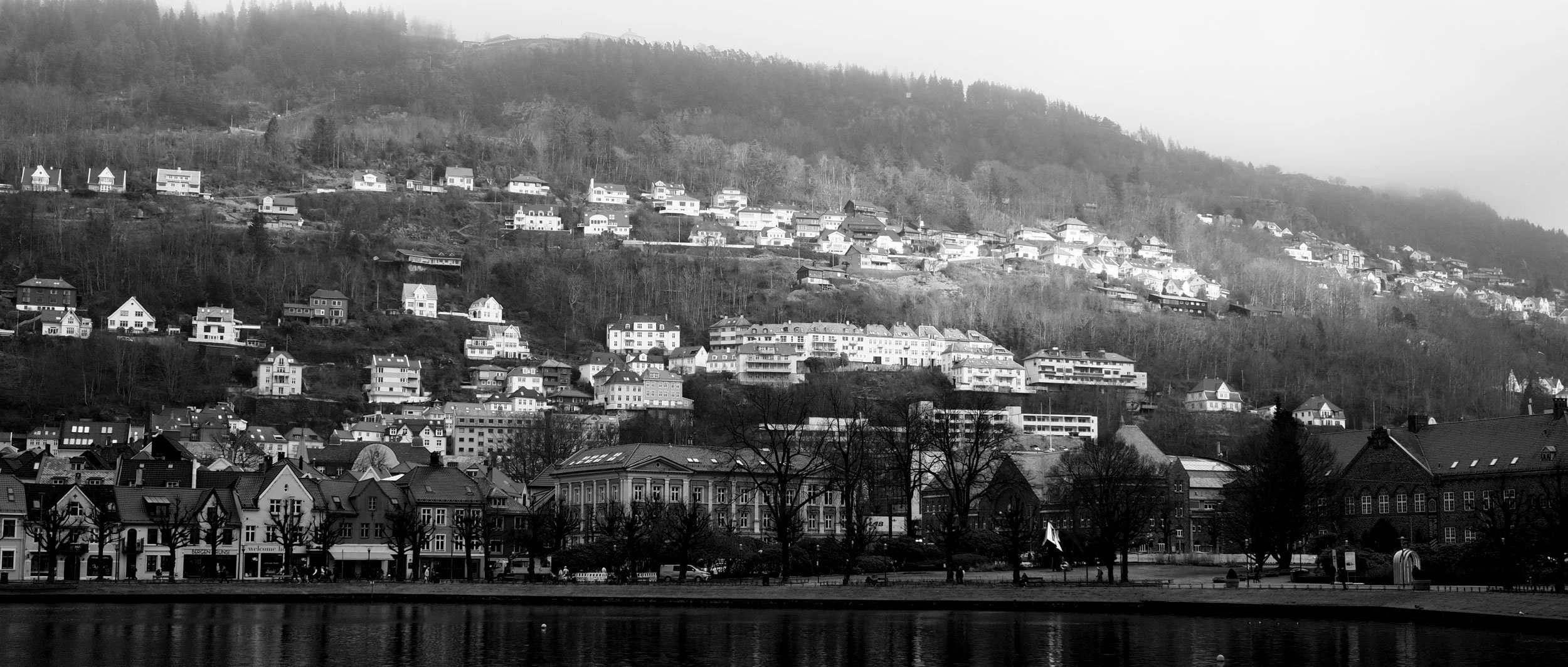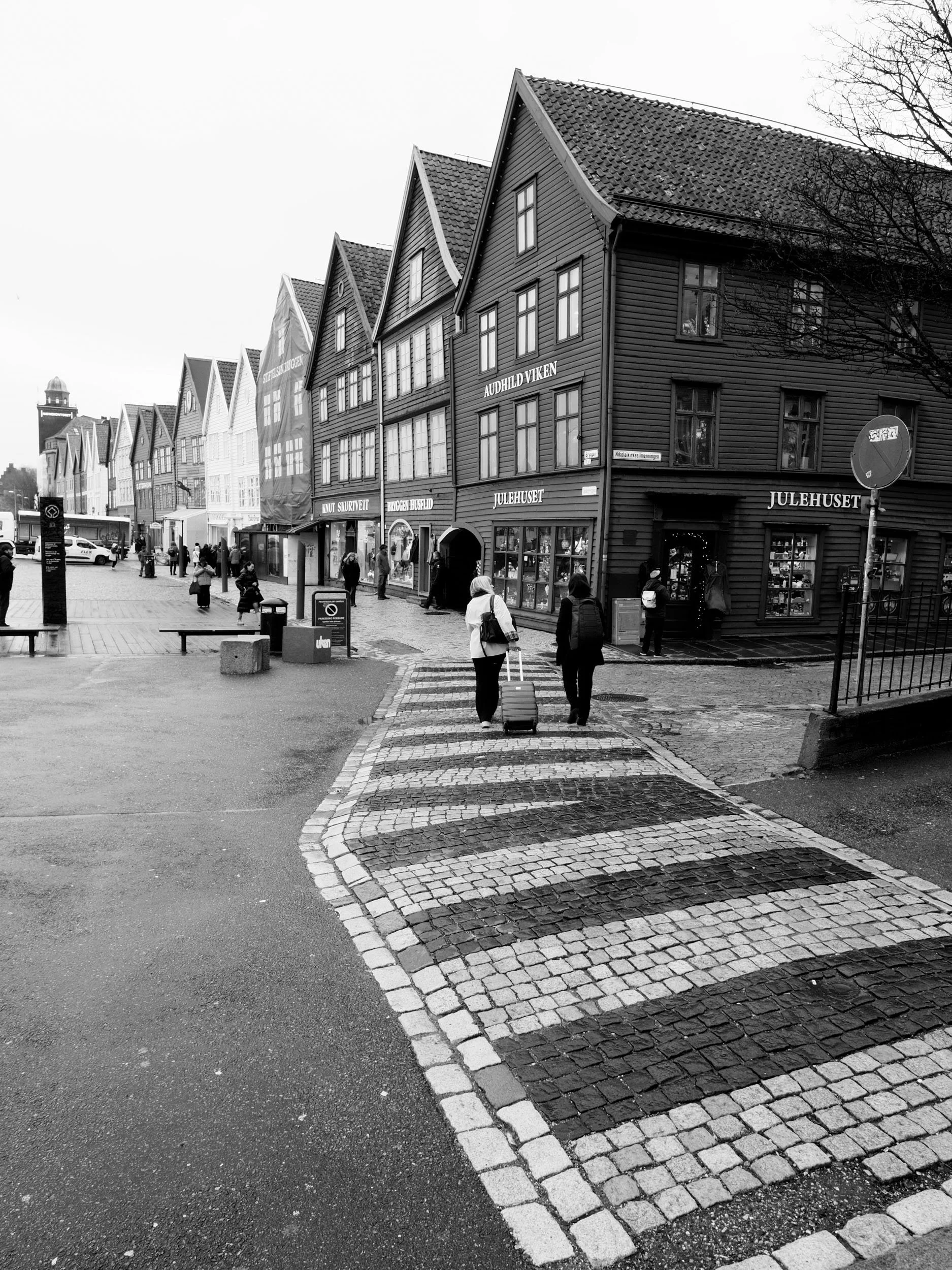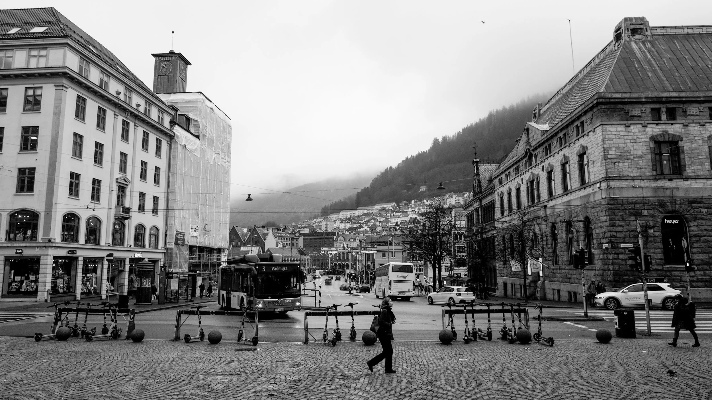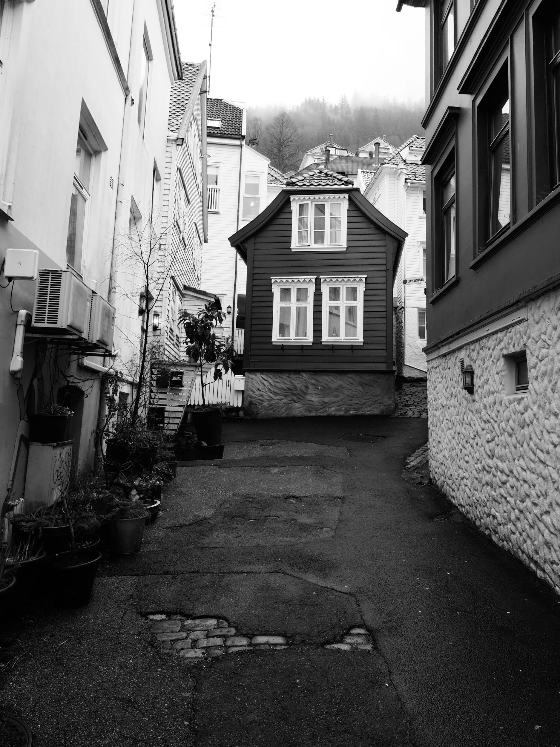Det er ikkje så ofte eg er i Bergen lenger. Byen eg reknar som min heimby, oppvaksen på Sotra som eg er, og byen som var vertskap for mitt studentliv utover i mine blomstrande 20-år. Det gir difor alltid ei heimkjensle å strekke på beina i Bergen sentrum, og eg koser meg ekstra med å gå gatelangs og ta inn byen på nytt. Denne dagen var kosenivået ekstra høgt, med mitt nyerverva PEN-F i lag med 17mm f/1.8 og 12mm f/2.0 i skulderbagen. Skydekket hang lågt over byfjella og inviterte på alle måtar til litt stemningsfull fotografering i svart og kvitt.