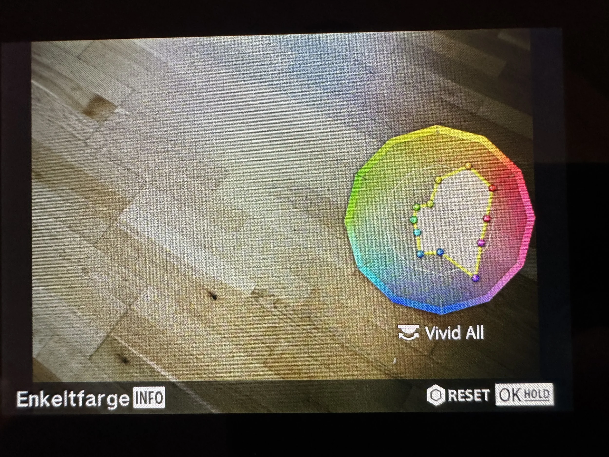 For fargeprofilane kan ein justere 12 fargar, sjå figur som viser innstillingane som simulerer Kodachrome 25. I tillegg har eg lagt inn fargeprofilar for Fujicolor Velvia, Fujichrome Classic, og Kodachrome 64. Det er svært givande og artig å ta bilete som er ferdige i kameraet. Det blir nesten som å fotografere med analog film. Ein hovudeffekt for meg er at kameraet roer meg ned, og inviterer til saktefotografering. I gatefotografering legg folk og mindre merke til denne type kamerahus.