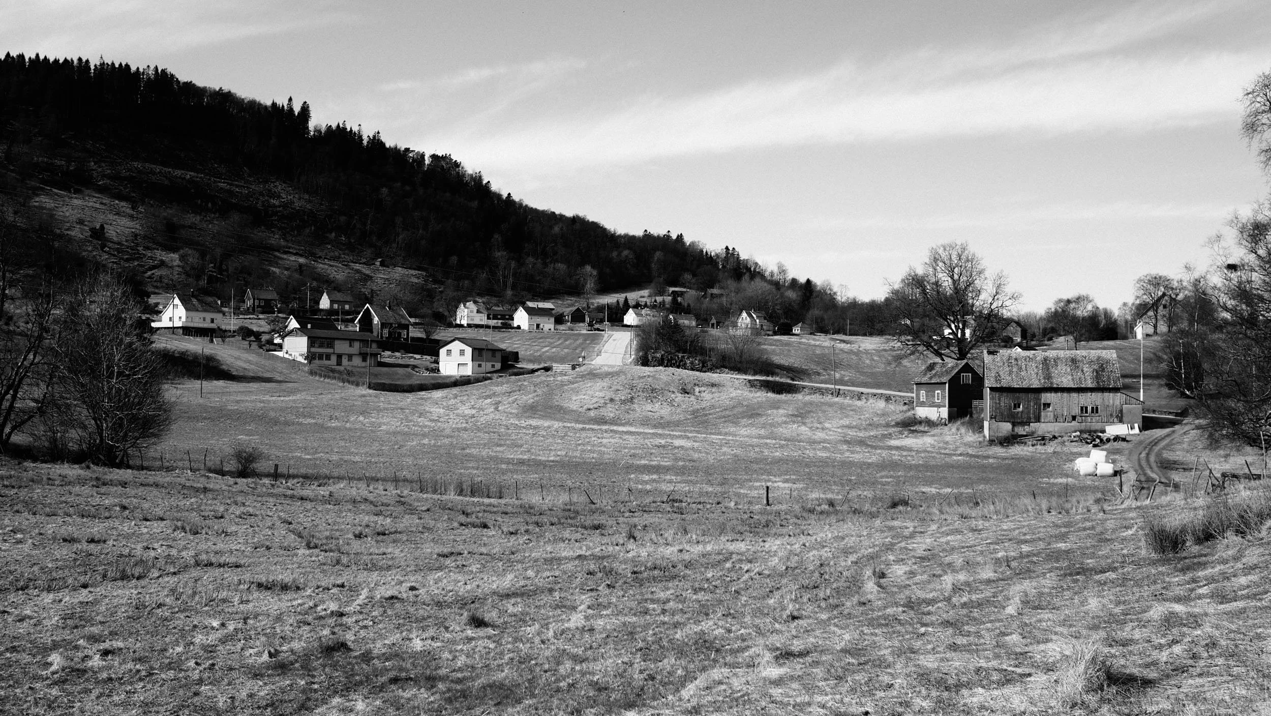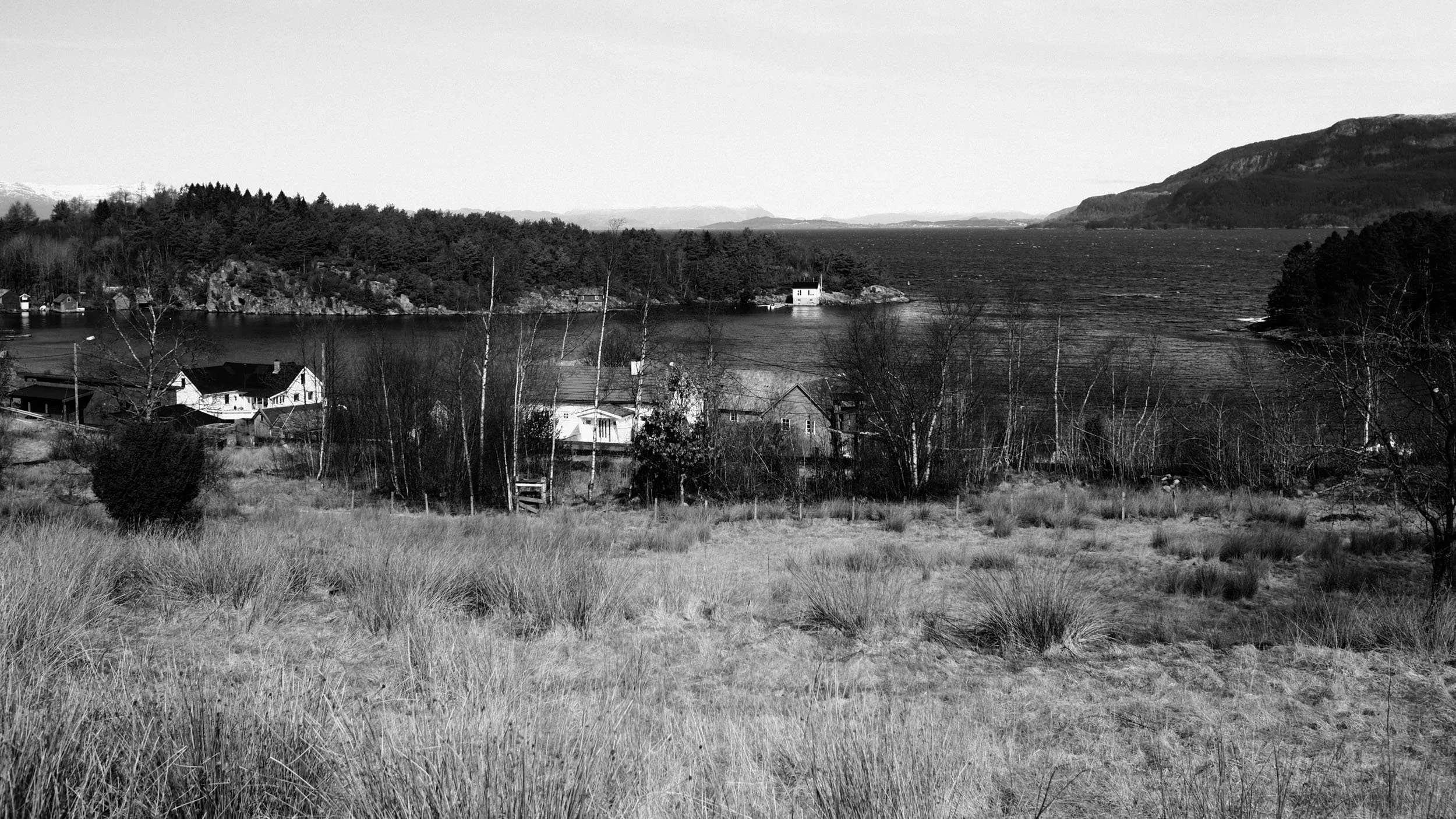 Gardsmiljø på Utbjoa. Vegen går ned til ferjekaien. Før Trekantsambandet var dette hovudfartsåra frå Stord og vidare til Ølensvåg og E134 over Haukelifjell. Olympus PEN-F, M.Zuiko 17mm f/1,8
