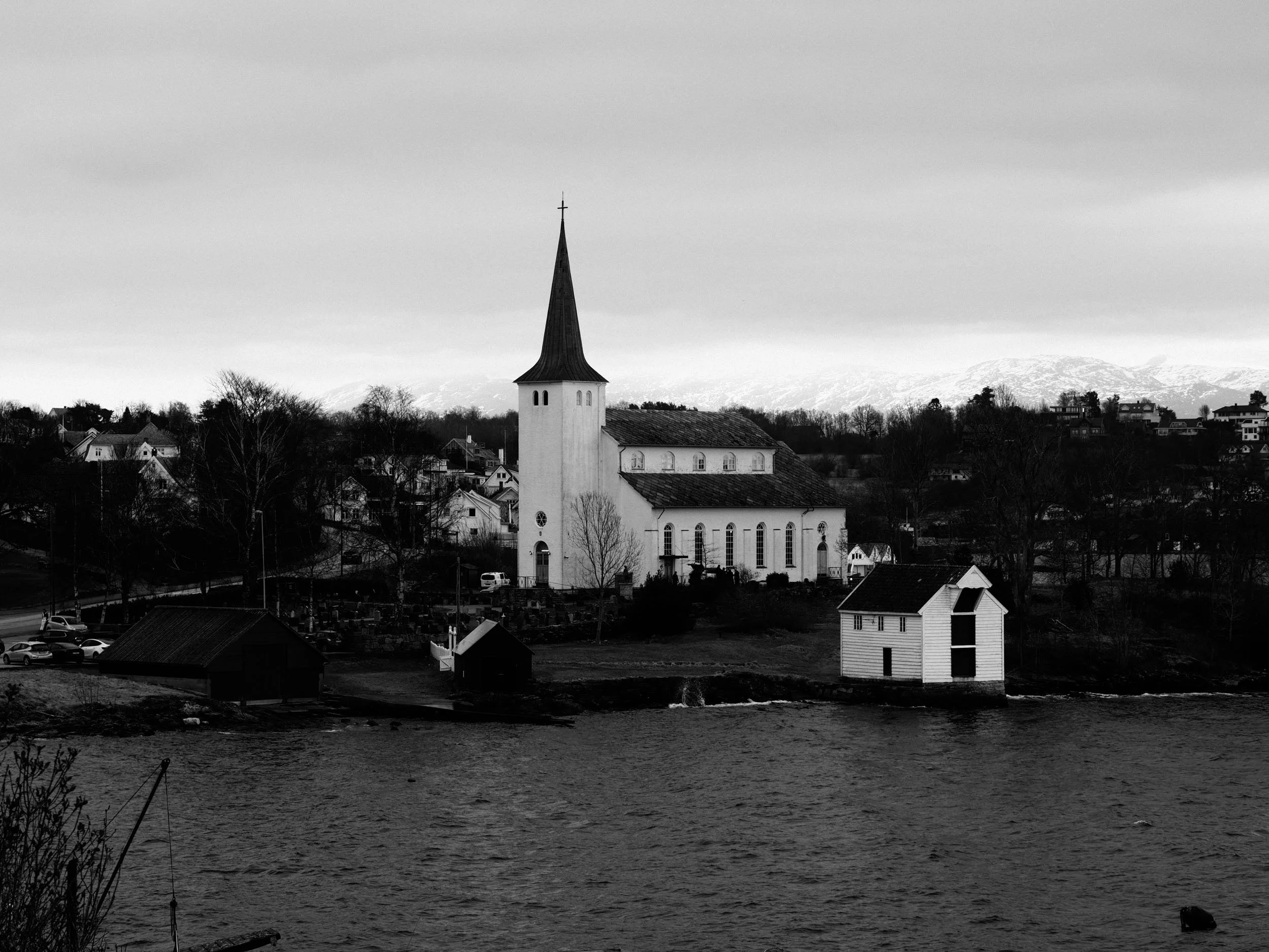 Stord kyrkje med kvitkledde Kvinnheradsfjell i bakgrunnen. Olympus PEN-F, M.Zuiko 45mm f/1,8